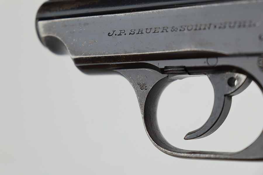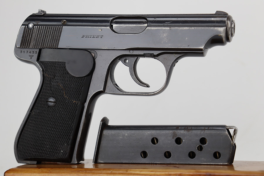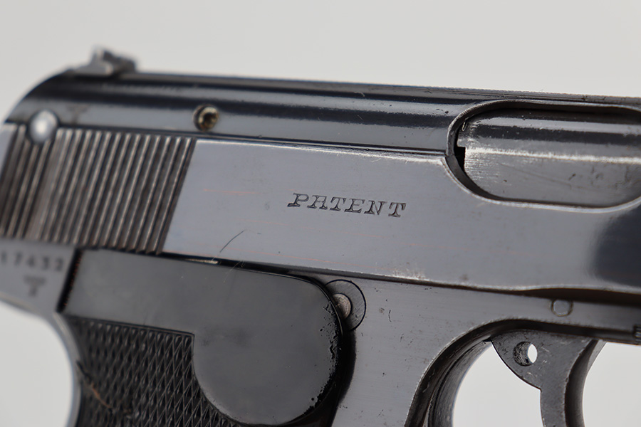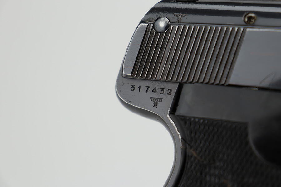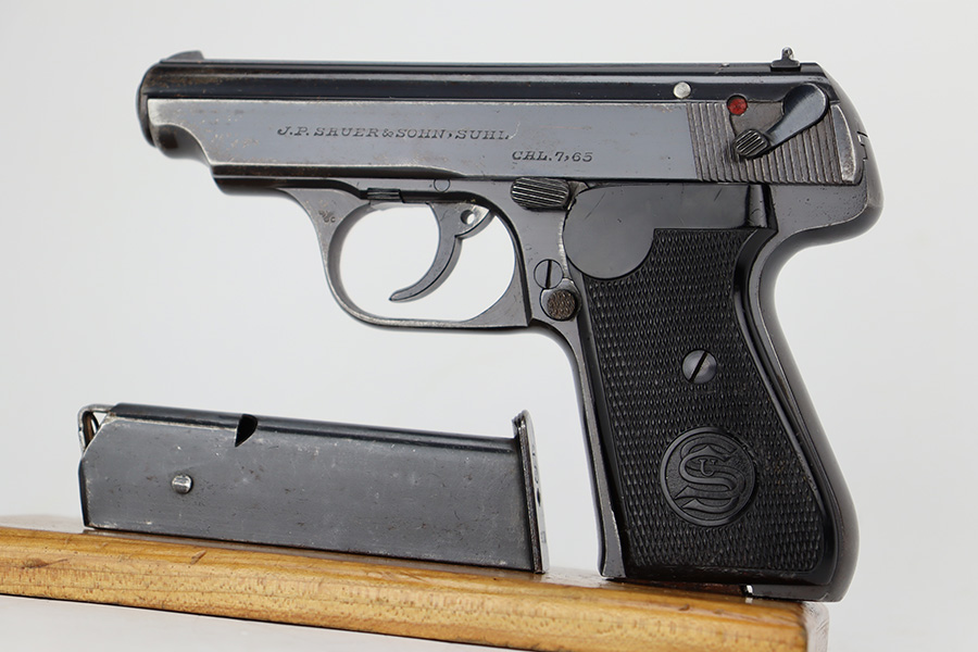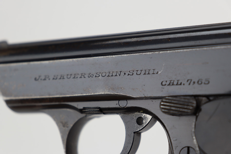 6/26/23 – This is a nice example of a Sauer 38h issued to the Nazi police force during WW2. This one is all matching and has a police “Eagle C” marking on the left side of the trigger guard. It has early features, such as a nice high polish finish and a checkered mag release button. It has retained roughly 85% of its original bluing. There is thinning on the grip straps and some light wear along the right side of the slide. But the most obvious sign of wear is the spotty discoloration along the left side of the slide. Fitted with period-correct black bakelite grips – noticeable cracks on the right side (repaired). Comes with one period-correct magazine. Mint bore.