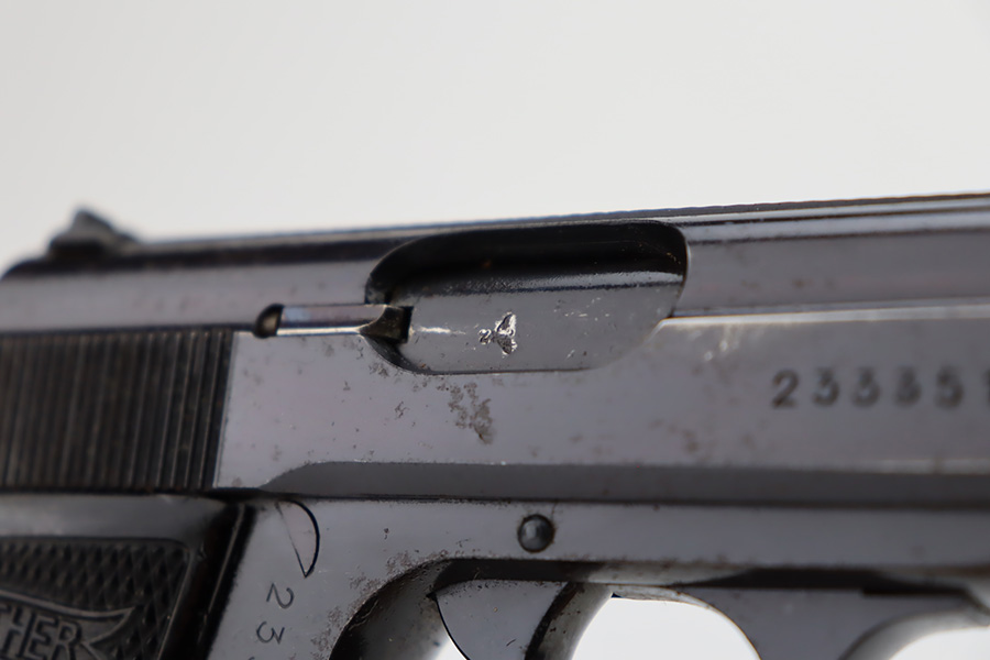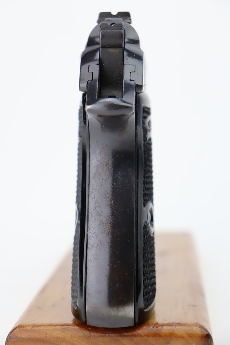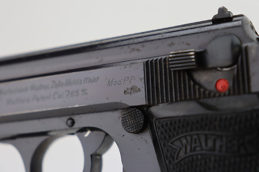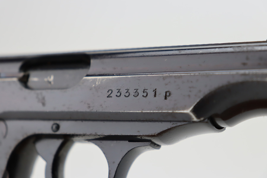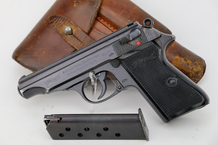 10/19/23 – This is a nice example of a Luftwaffe-contract Walther PP from 1941. It is all matching and has the proper “Waffen 359” military acceptance proofs on the slide and frame. It comes as a rig with a generic tan leather holster and one un-numbered wartime magazine. The gun itself has retained about 97% of its original high polish finish. Minor wear around the muzzle. While there is very little actual finish loss, there is noticeable spotty oxidation and pin-pricking throughout. Fitted with excellent black bakelite grips. Minty bore.