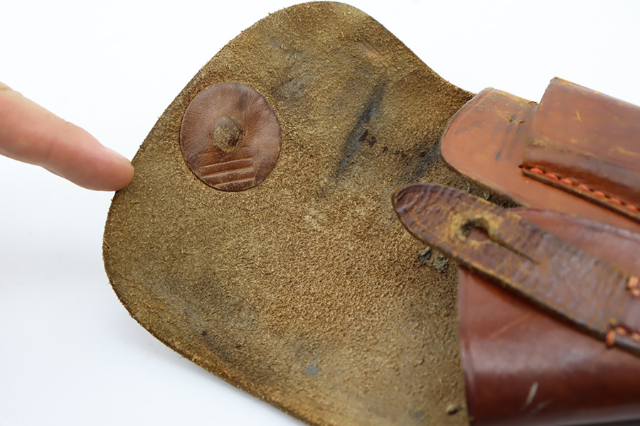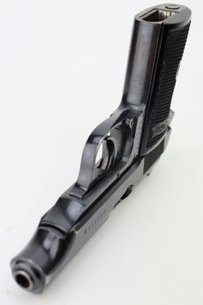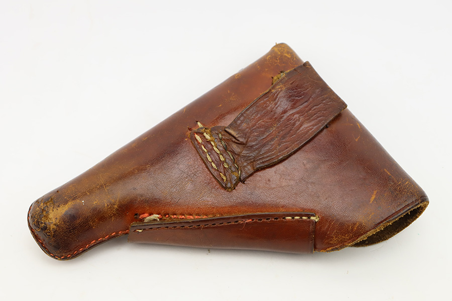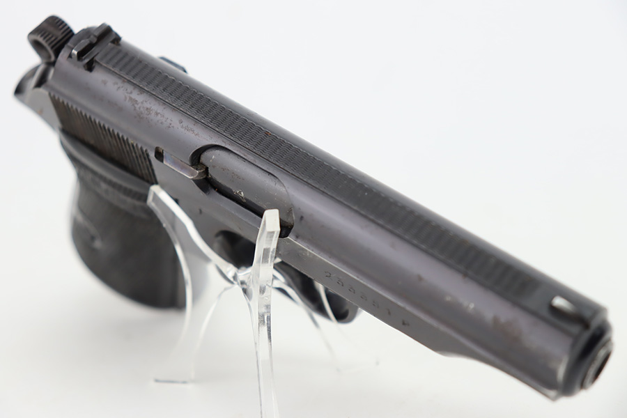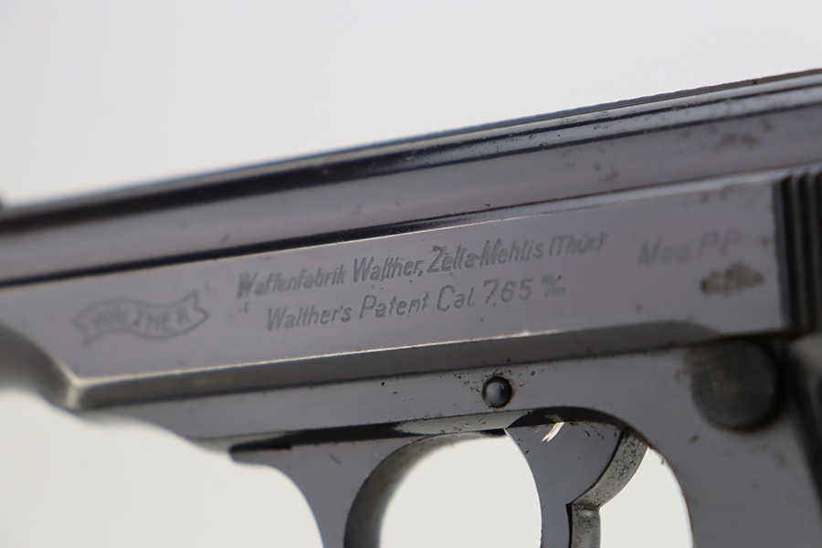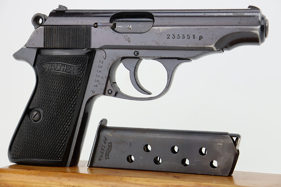 10/19/23 – This is a nice example of a Luftwaffe-contract Walther PP from 1941. It is all matching and has the proper “Waffen 359” military acceptance proofs on the slide and frame. It comes as a rig with a generic tan leather holster and one un-numbered wartime magazine. The gun itself has retained about 97% of its original high polish finish. Minor wear around the muzzle. While there is very little actual finish loss, there is noticeable spotty oxidation and pin-pricking throughout. Fitted with excellent black bakelite grips. Minty bore.