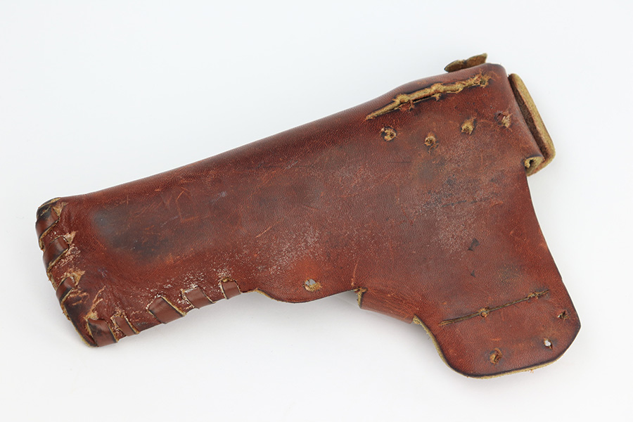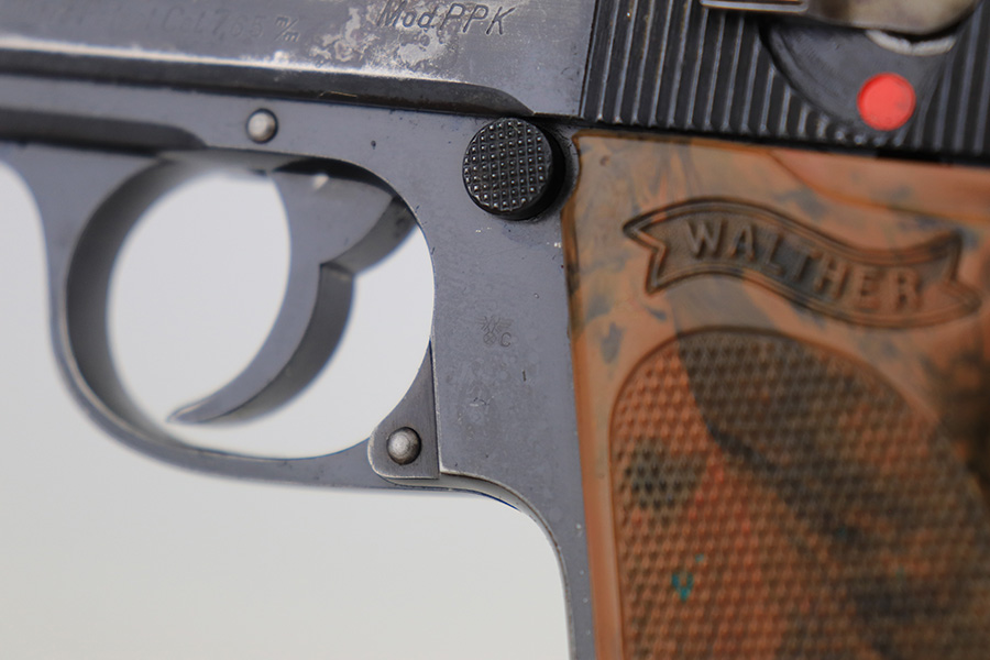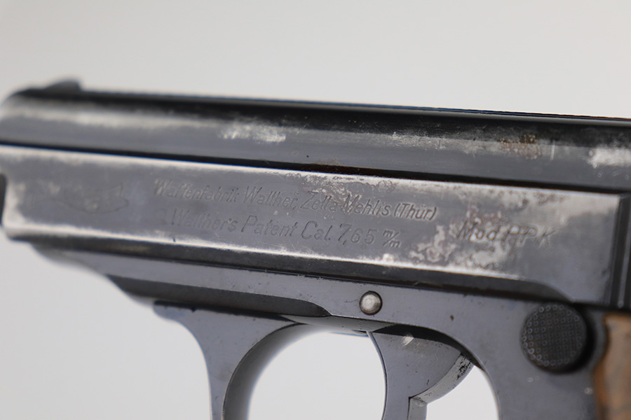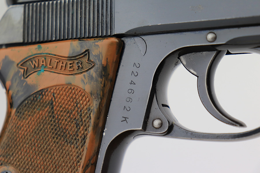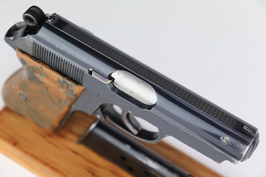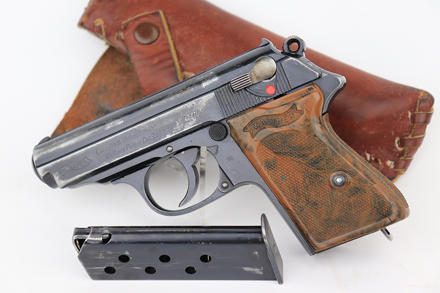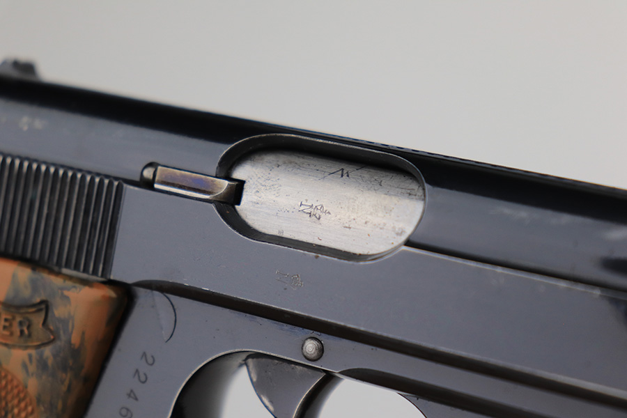 3/6/23 – This is a nice example of a Walther PPK issued to the Nazi police force in 1939. It is all matching, has the proper police “Eagle C” marking on the left side of the frame, and has an original high polish finish. It has retained roughly 85% of its bluing. The majority of the finish loss is along the left side of the slide, where there is also some splotchy discoloration. Minor muzzle wear. Fitted with a nice brown Walther grip – tiny crack on the spine. Comes with a Walther banner-only magazine and a custom post-war leather holster. Minty bore.