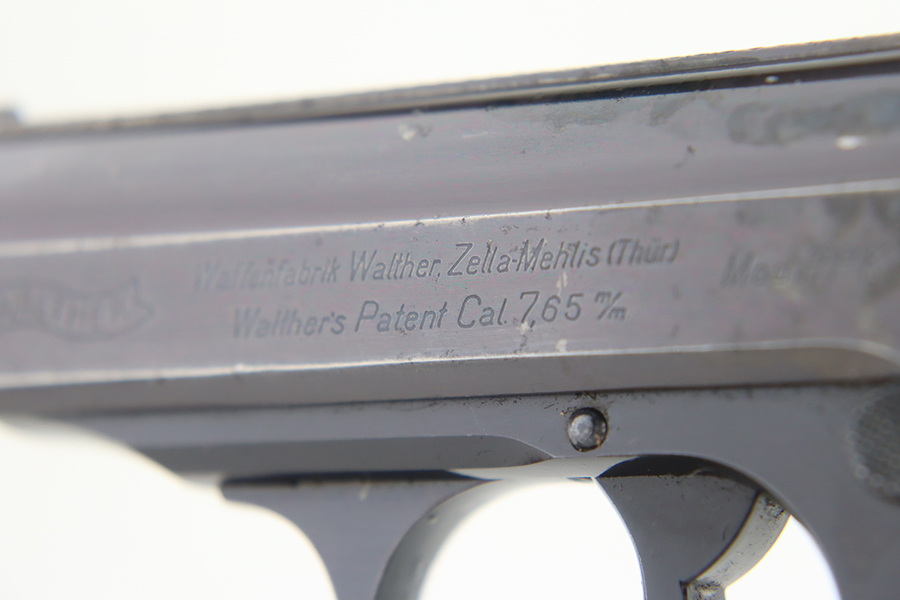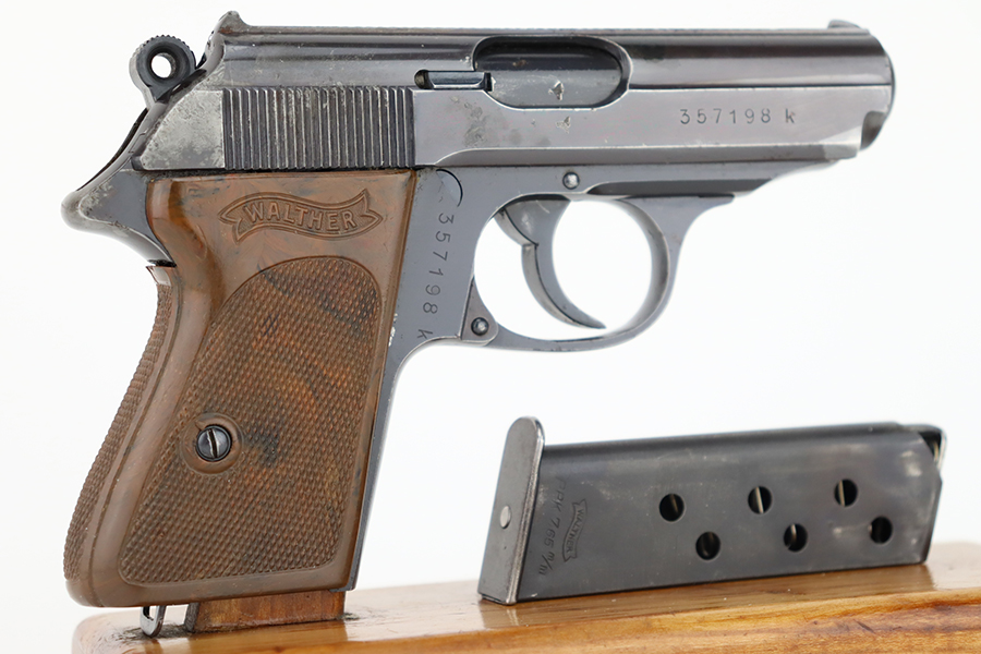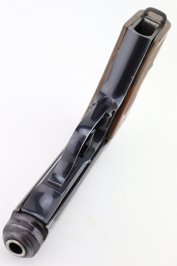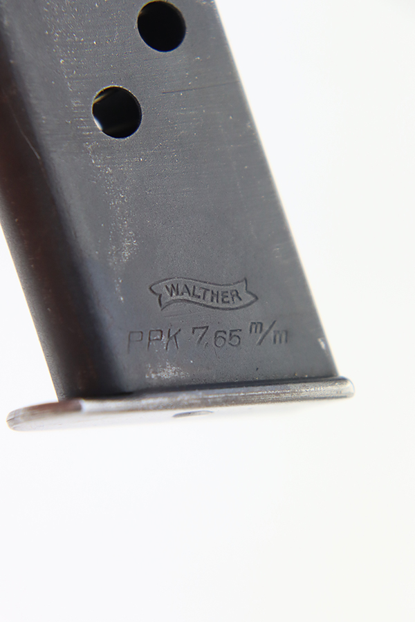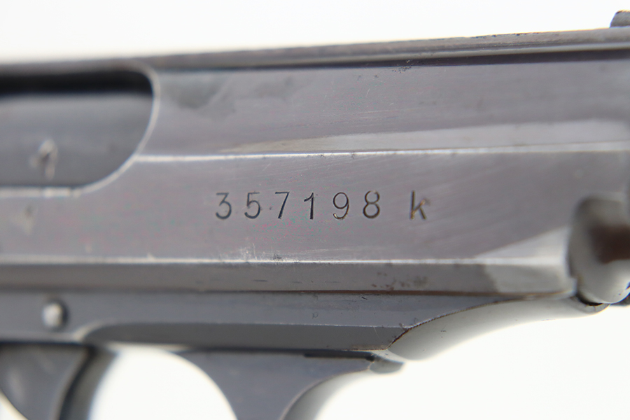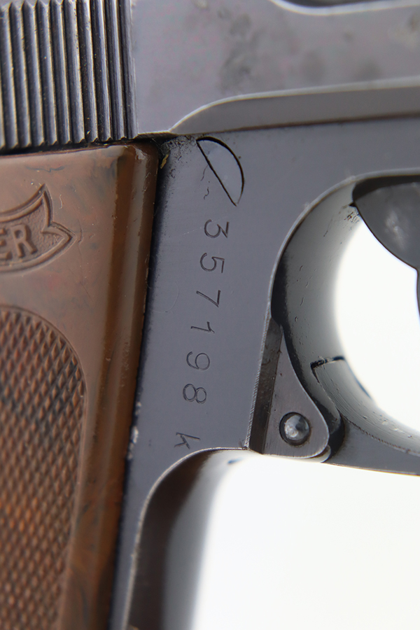 1/23/24 – This is a nice example of a Walther PPK issued to the Nazi police force in 1942. It is all matching, has the proper police “Eagle C” marking on the left side of the frame, and has an original high polish finish. It has retained about 90% of its bluing. While there isn’t a ton of actual finish loss, there are areas of obvious splotchy discoloration along both sides of the slide. Very minor wear around the muzzle and high edges of the slide. A couple of tiny scratches on the front strap. Comes with a very nice brown Walther grip (small crack in the spine) and a flat bottom magazine. Mint bore.