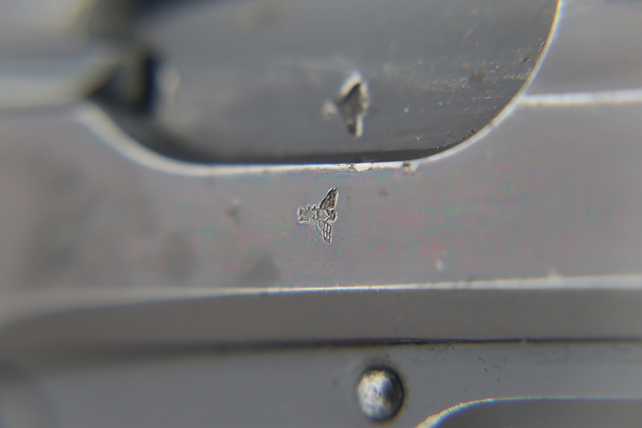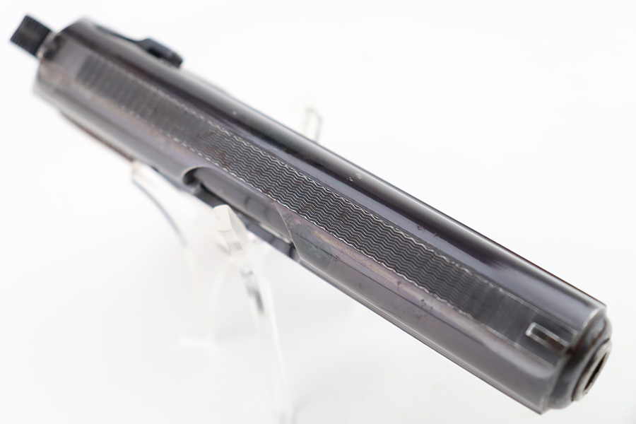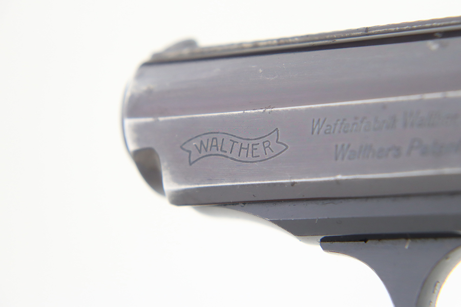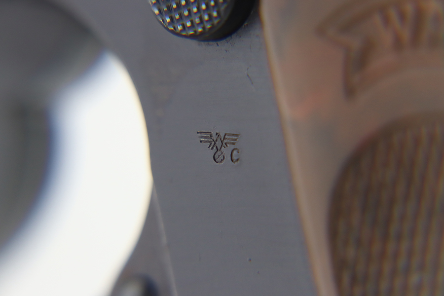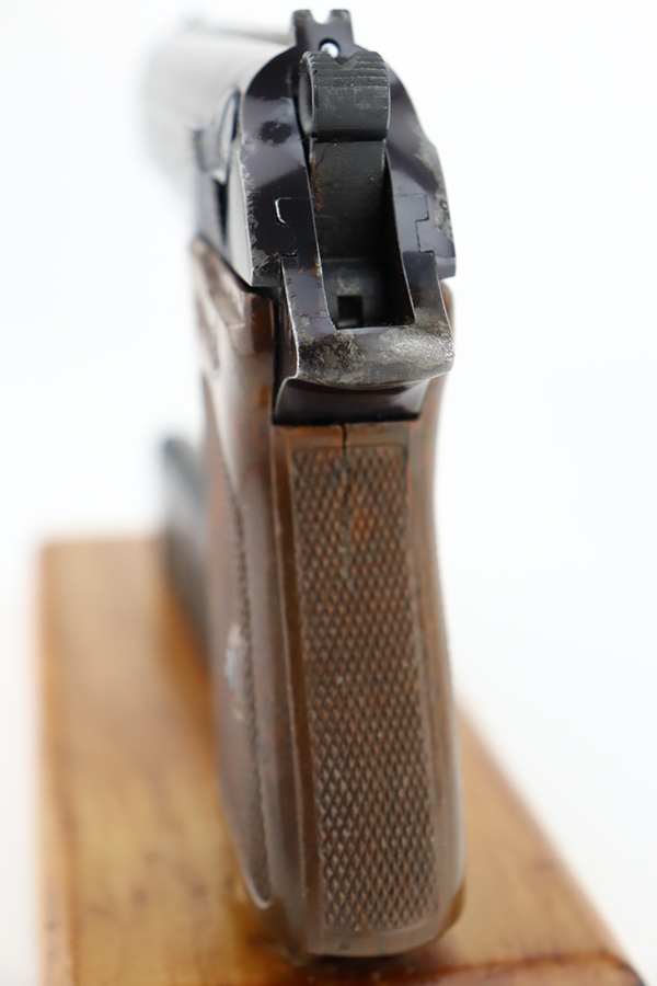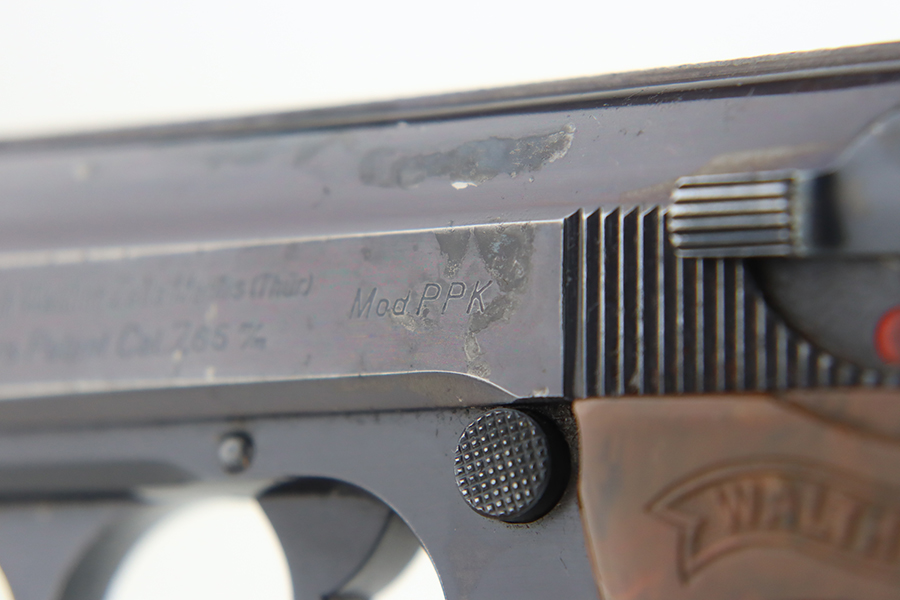 1/23/24 – This is a nice example of a Walther PPK issued to the Nazi police force in 1942. It is all matching, has the proper police “Eagle C” marking on the left side of the frame, and has an original high polish finish. It has retained about 90% of its bluing. While there isn’t a ton of actual finish loss, there are areas of obvious splotchy discoloration along both sides of the slide. Very minor wear around the muzzle and high edges of the slide. A couple of tiny scratches on the front strap. Comes with a very nice brown Walther grip (small crack in the spine) and a flat bottom magazine. Mint bore.