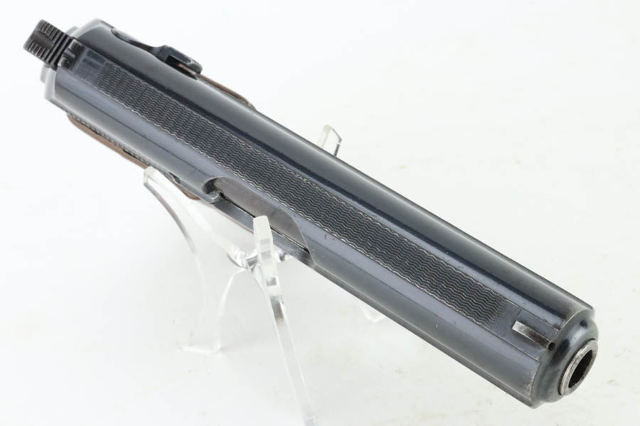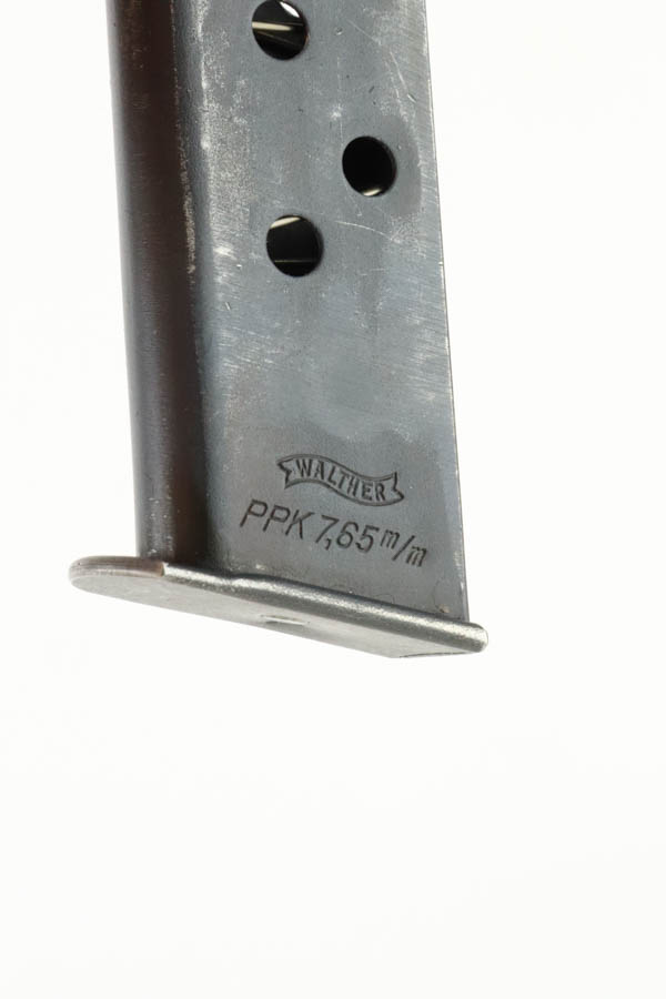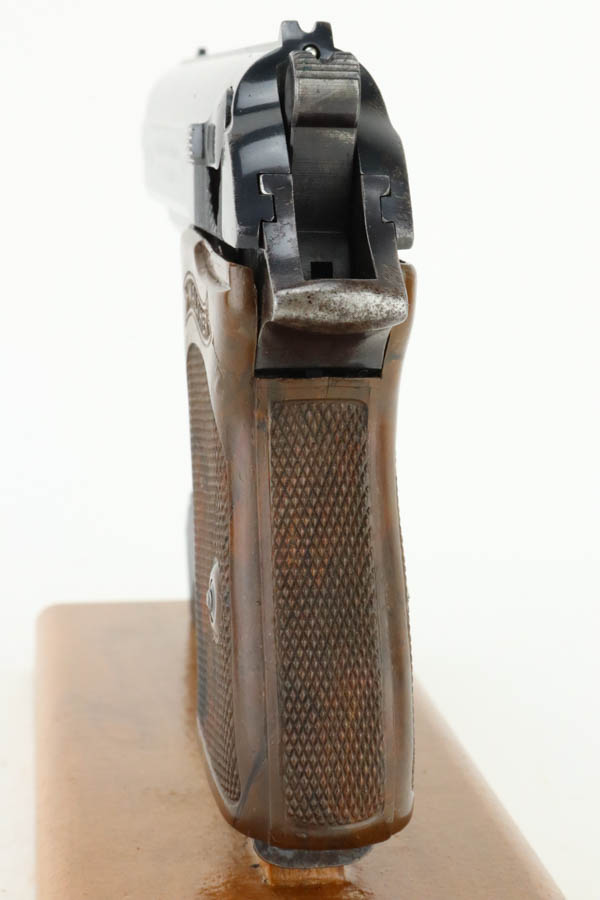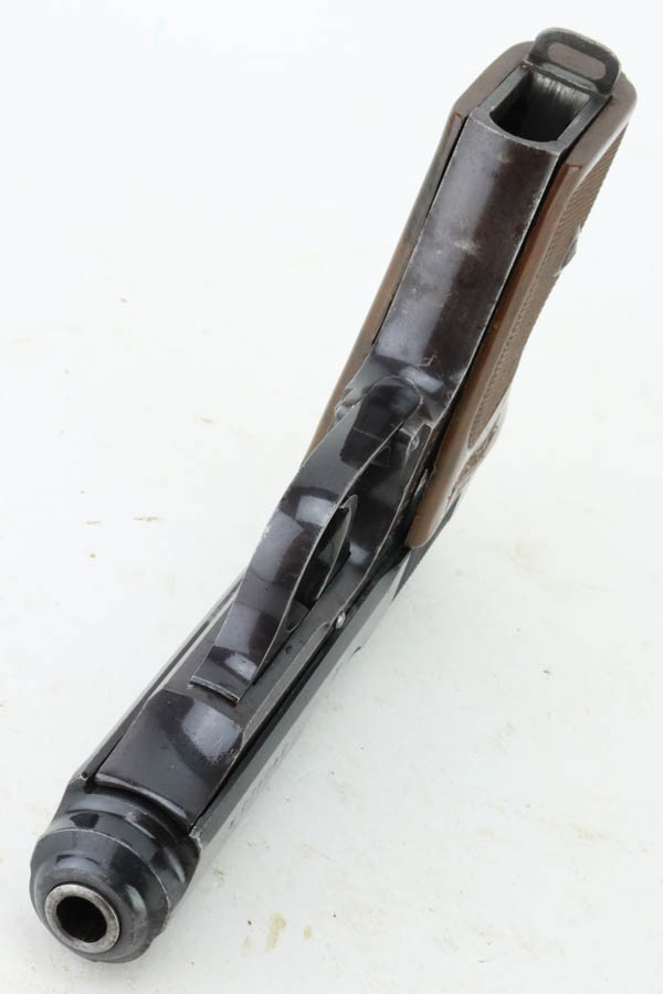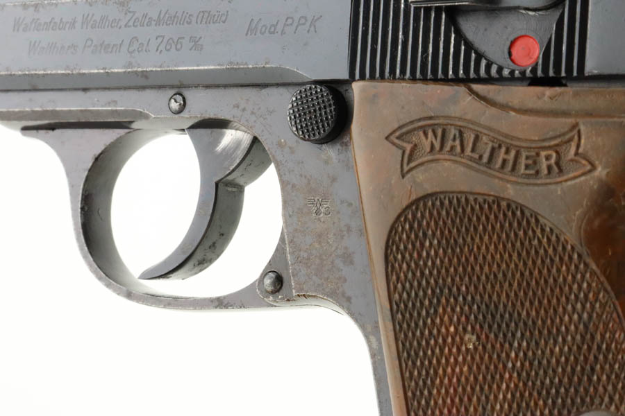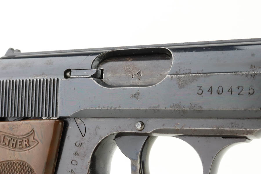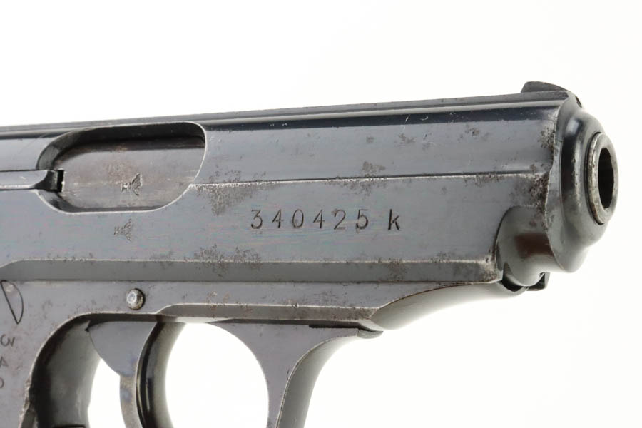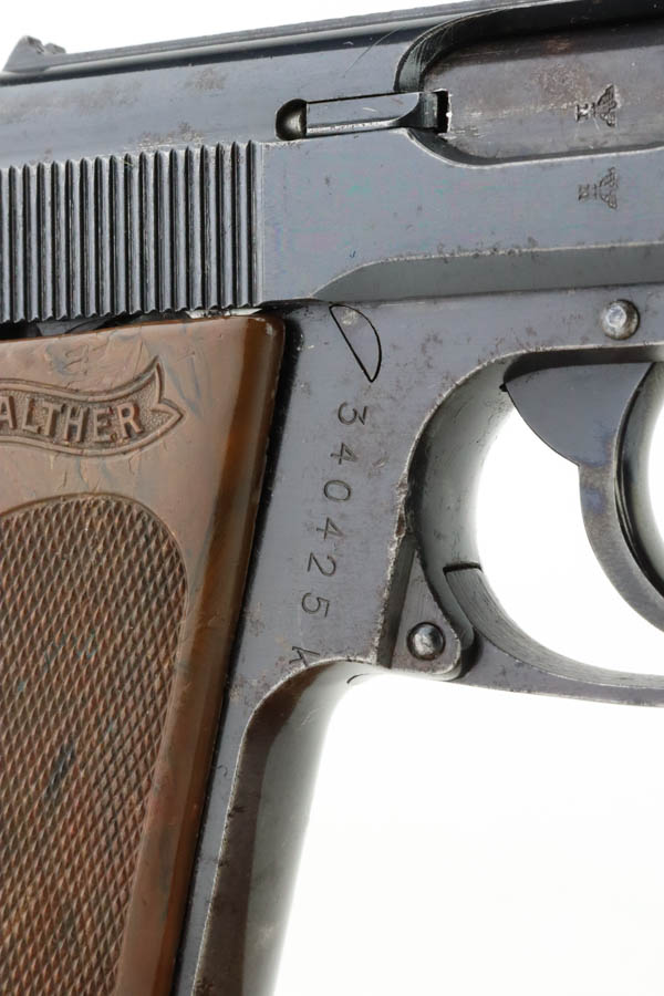7/10/24 – This is a Walther PPK issued to the Nazi police force in 1941. It is all matching, has the proper police “Eagle C” marking on the left side of the frame, and has an earlier high polish finish. It has retained about 95% of its bluing. While there isn’t a ton of actual finish loss, there are some areas of pitting here and there (especially on the high edges) and minor spotty discoloration on the frame. Fitted with a brown grip and comes with a proper wartime magazine. Excellent, shiny bore.