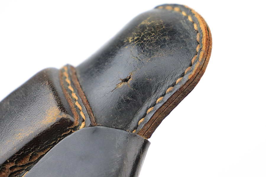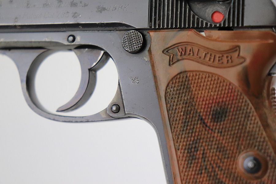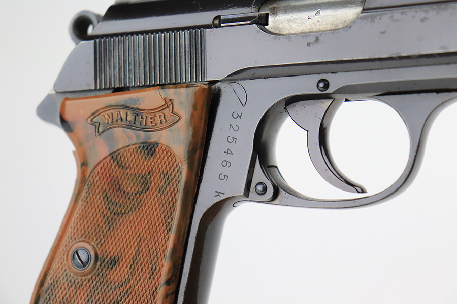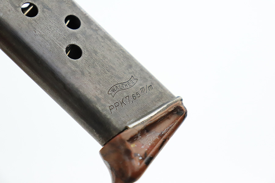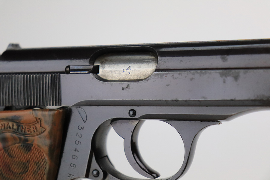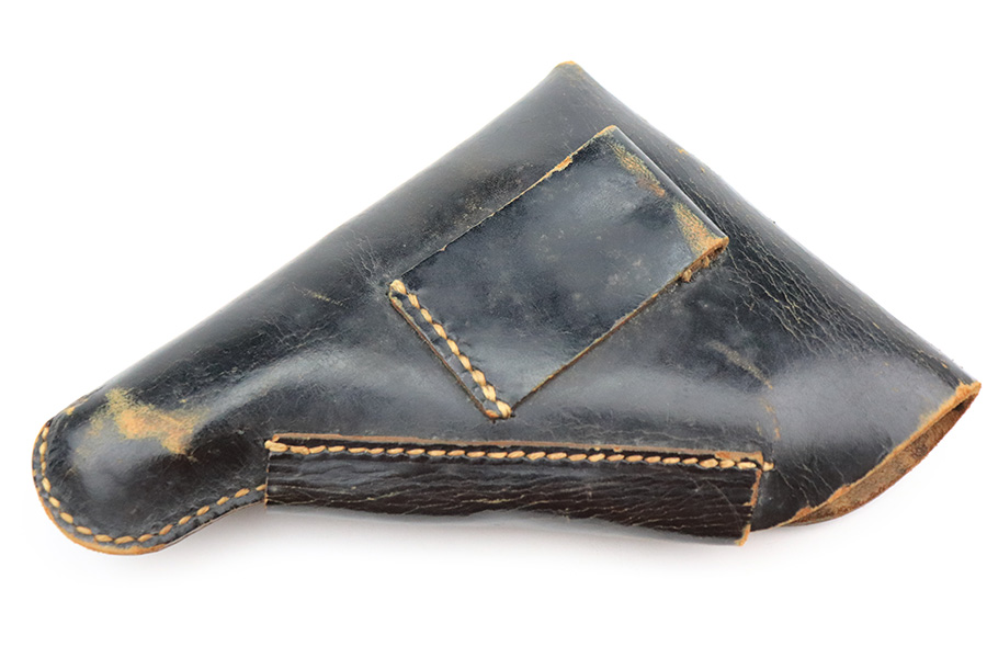 6/8/22 – This is an excellent example of a high-polish Walther PPK issued to the Nazi police force in 1941. It is all matching and has an “Eagle C” police proof on the left side of the frame. It comes as a rig with a nice 1944-dated black leather holster, one wartime finger extension magazine, and one flat-bottom magazine. The gun itself has retained about 95% of its original high polish finish. There isn’t much actual finish loss, but there is noticeable spotty discoloration and oxidation on the left side of the slide and frame. Areas of tiny pits in those same areas and on the right side of the slide. Comes with a period-correct brown bakelite grip – small chip on the left side and cracks in the spine and right side. Mint bore.