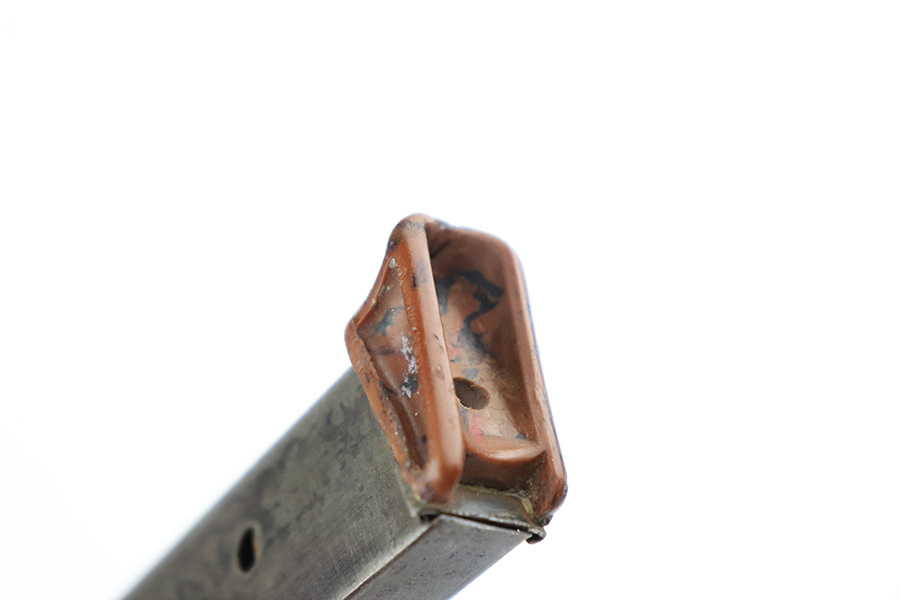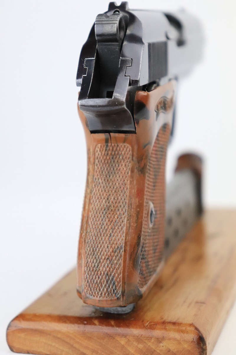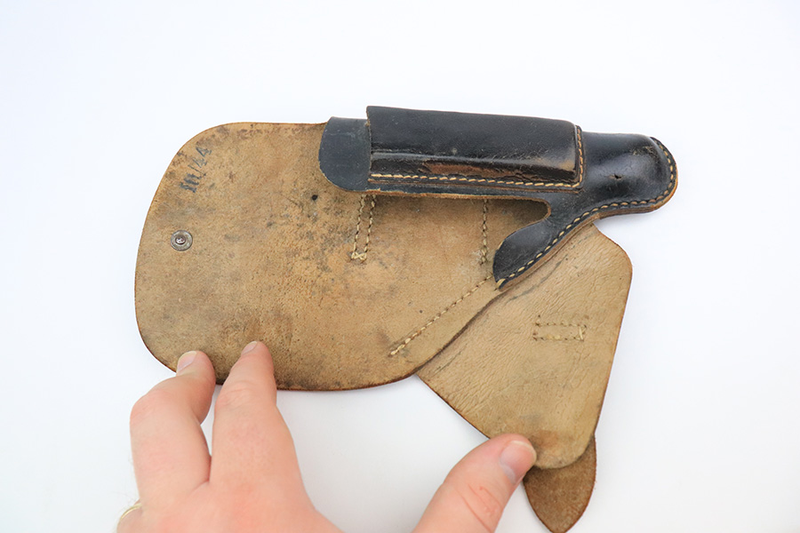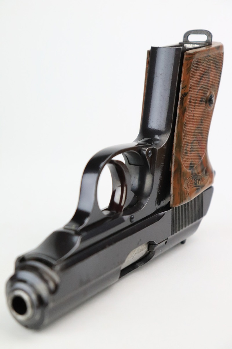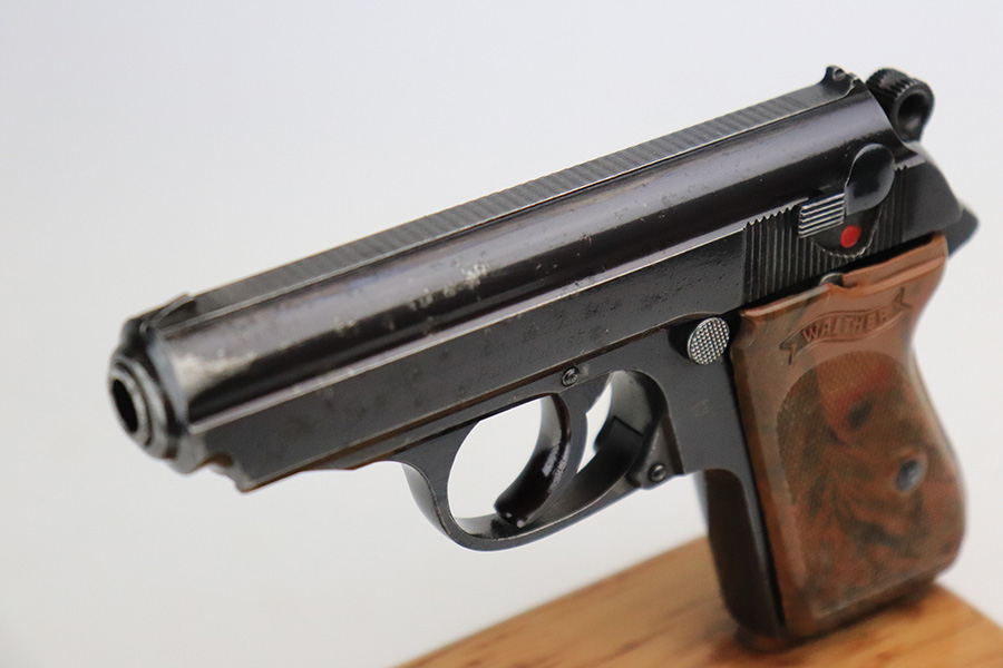 6/8/22 – This is an excellent example of a high-polish Walther PPK issued to the Nazi police force in 1941. It is all matching and has an “Eagle C” police proof on the left side of the frame. It comes as a rig with a nice 1944-dated black leather holster, one wartime finger extension magazine, and one flat-bottom magazine. The gun itself has retained about 95% of its original high polish finish. There isn’t much actual finish loss, but there is noticeable spotty discoloration and oxidation on the left side of the slide and frame. Areas of tiny pits in those same areas and on the right side of the slide. Comes with a period-correct brown bakelite grip – small chip on the left side and cracks in the spine and right side. Mint bore.