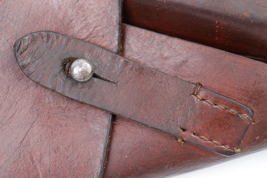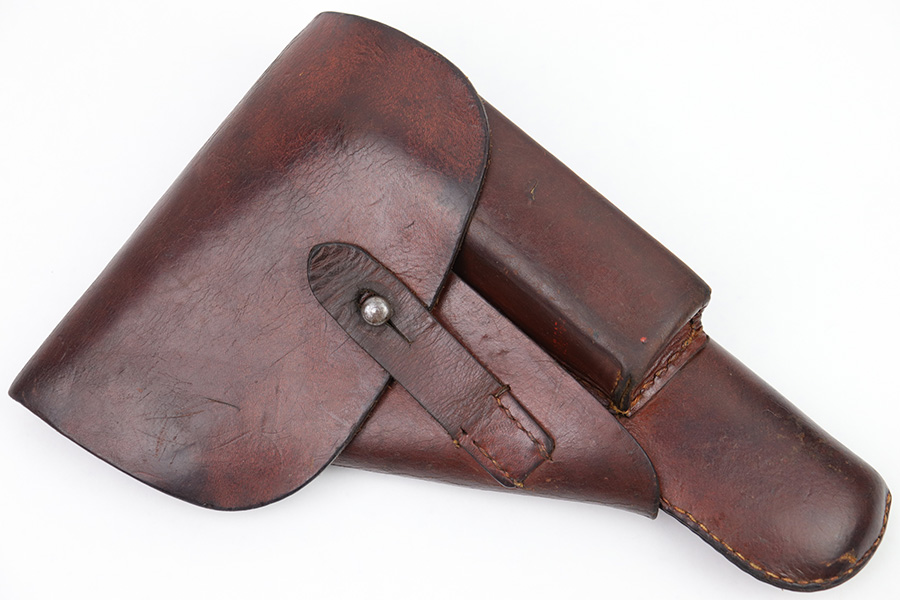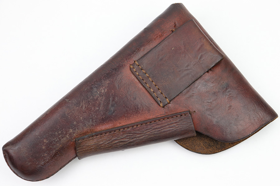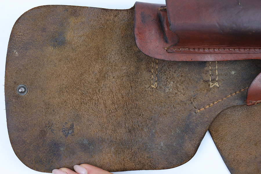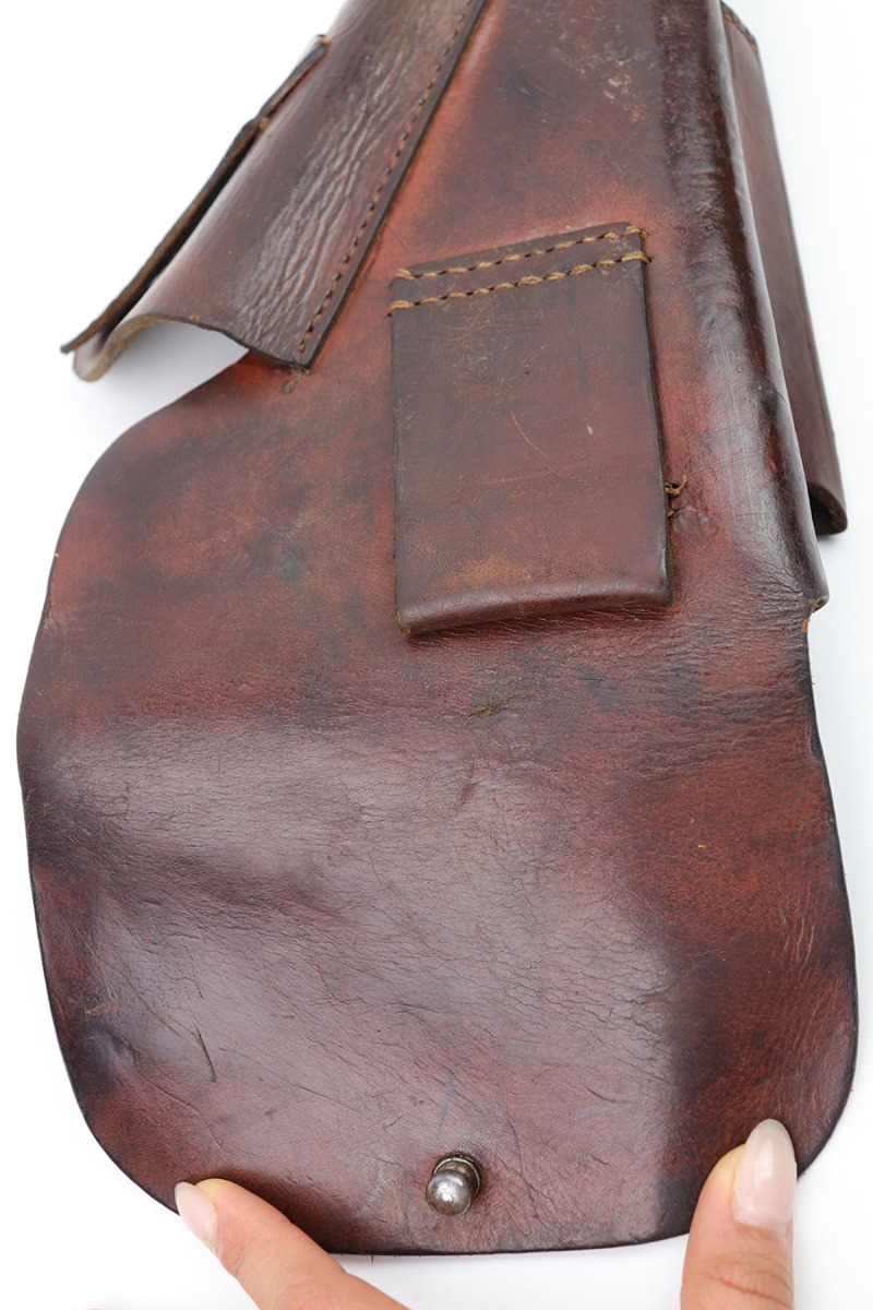 3/2/23 – This is an original WW2 High Power holster. The holster features a waffen stamp in ink on the interior leather. There’s another ink stamp near this proof, but we can’t decipher what it says. We believe it’s either a “42” date stamp, or a “dlv” maker stamp (or similar maker). The leather has normal pliability and some surface discoloration and typical use wear. No notable stitching flaws with all original stitching.