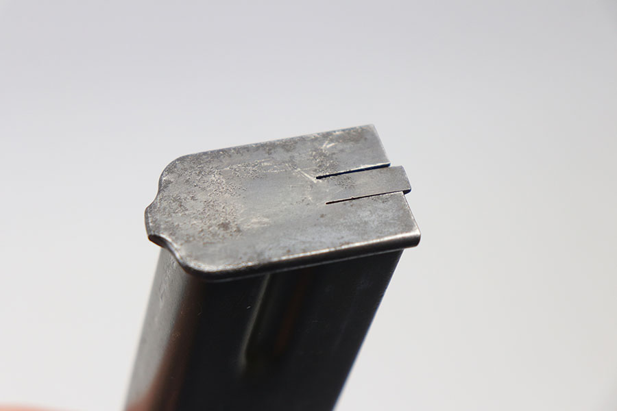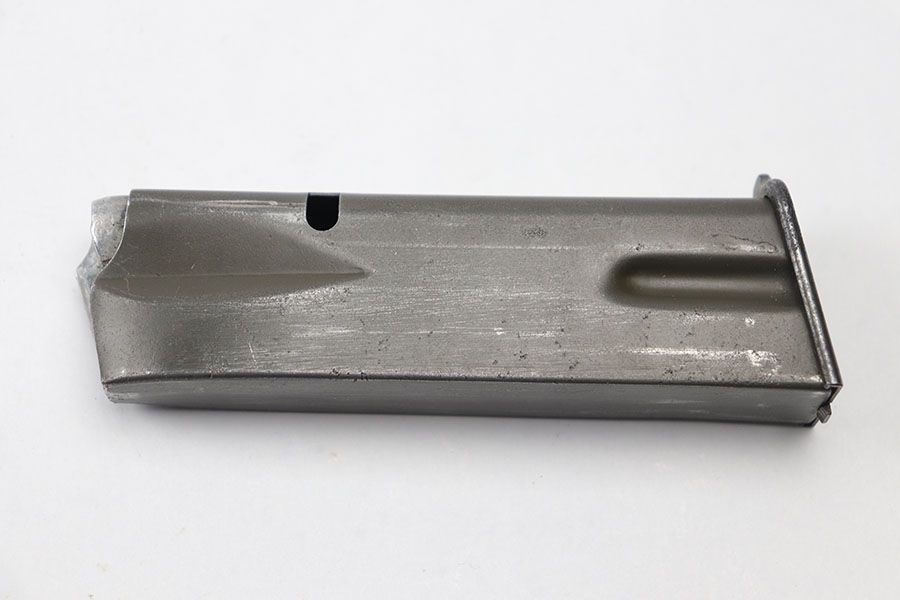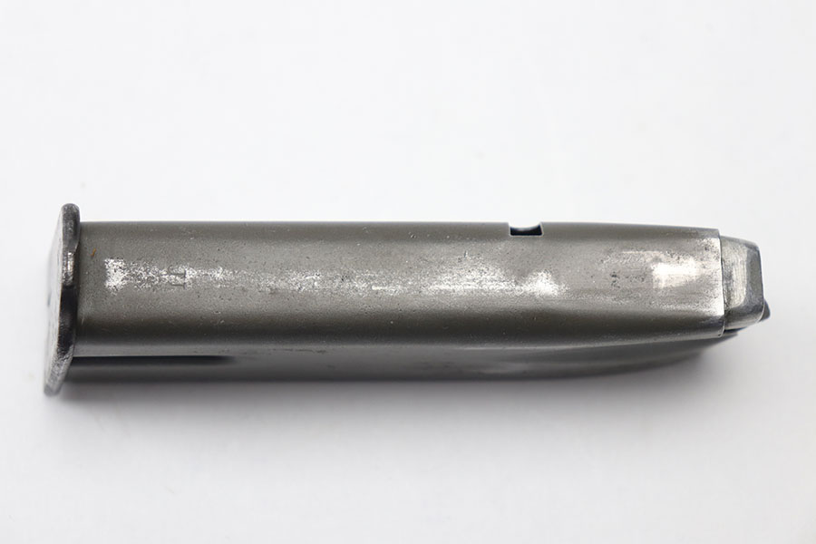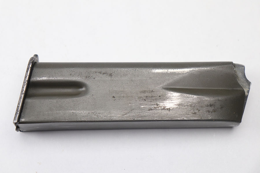 11/2/21 – This is a WW2 era production High Power magazine. The magazine has a phosphate finish on the tube and a blued base. No markings or stamps. Strong, fully functional spring. Minimal finish loss. Some pitting on baseplate.
