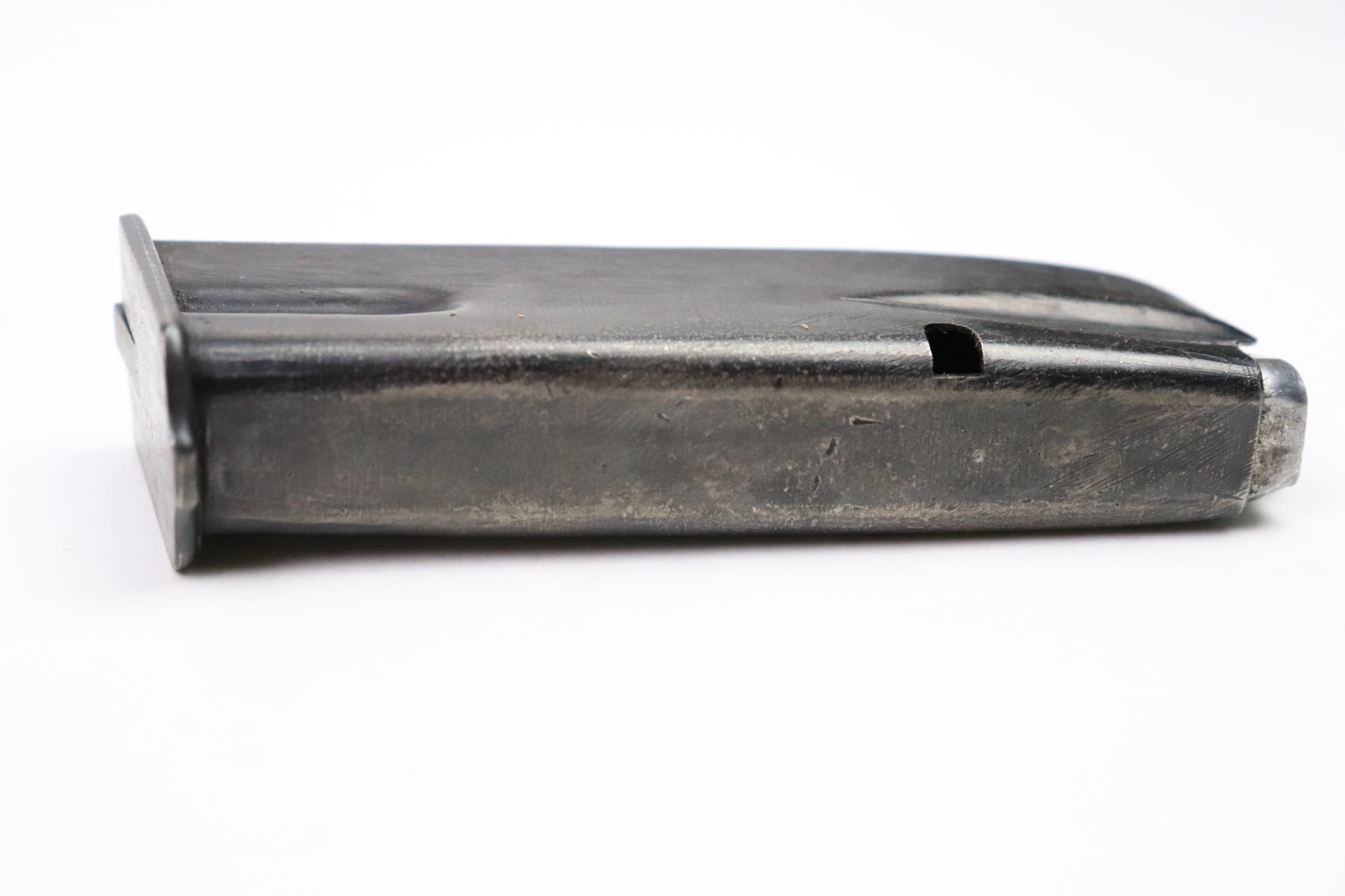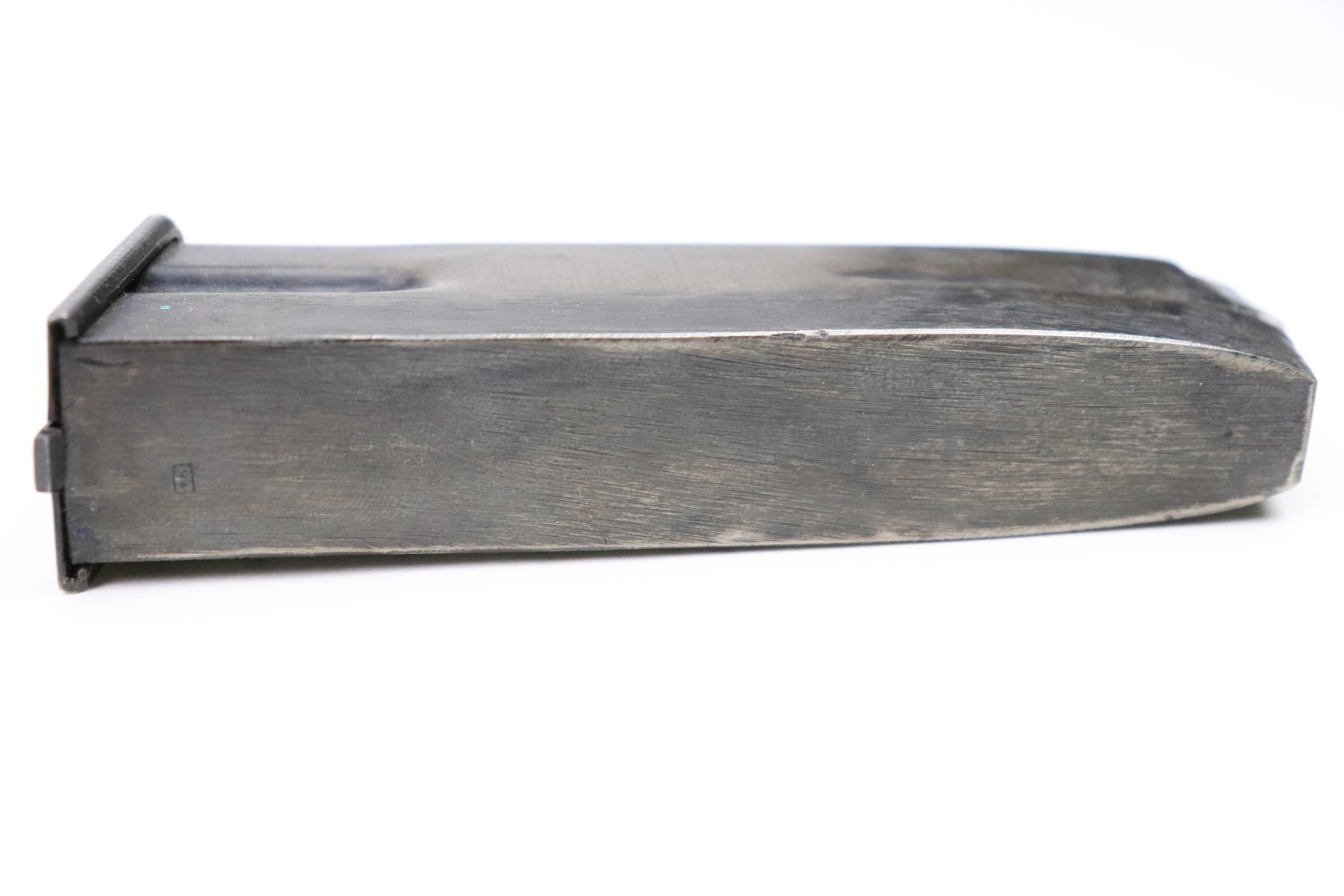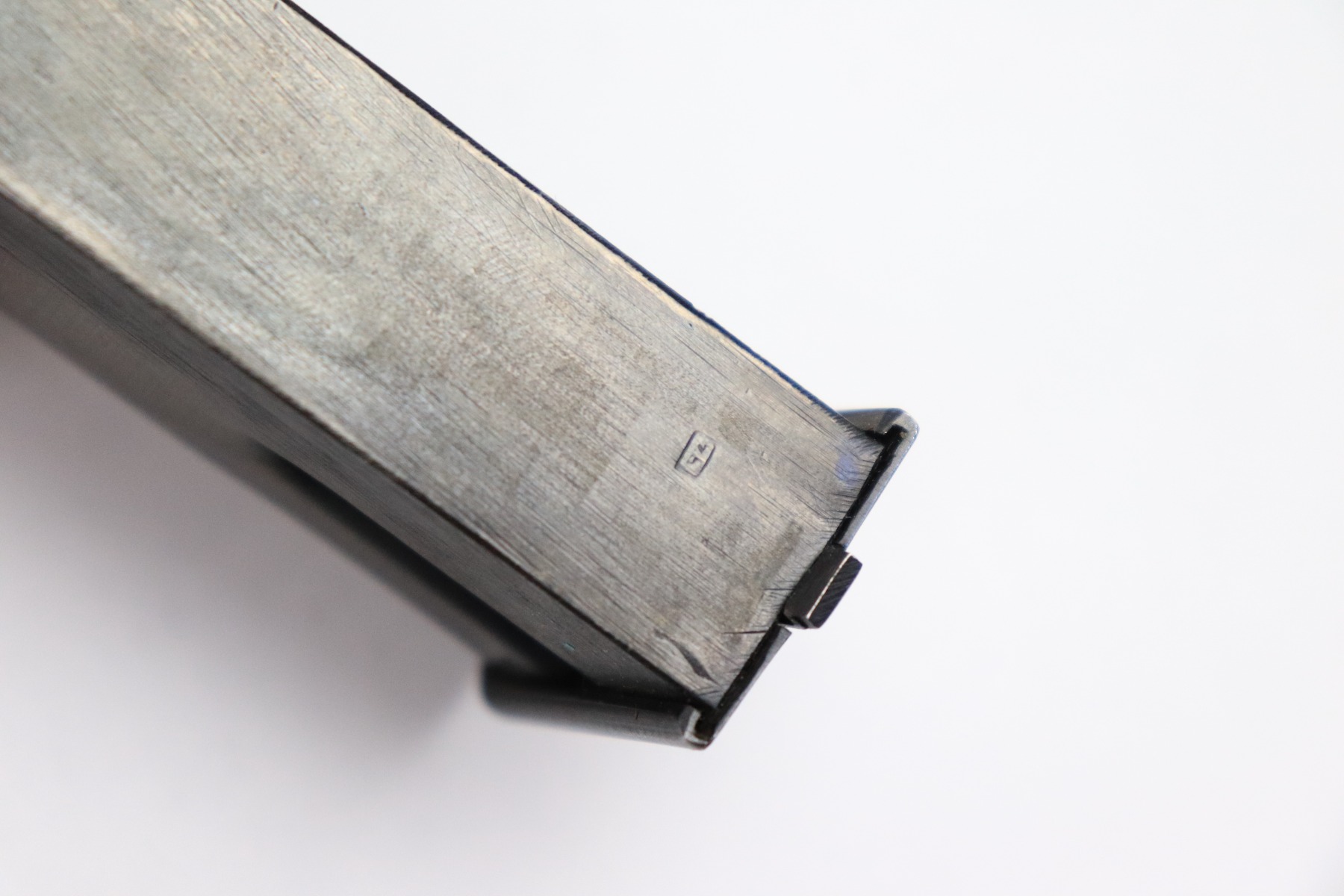 12/1/22 – This is a WW2 era production Commercial High Power magazine. The magazine has a small stamp on the spine and no other markings or proofs. The finish is thinning and spotty throughout the magazine and there is some mild surface patina, but no rust or pitting. The spring is strong and fully functional.