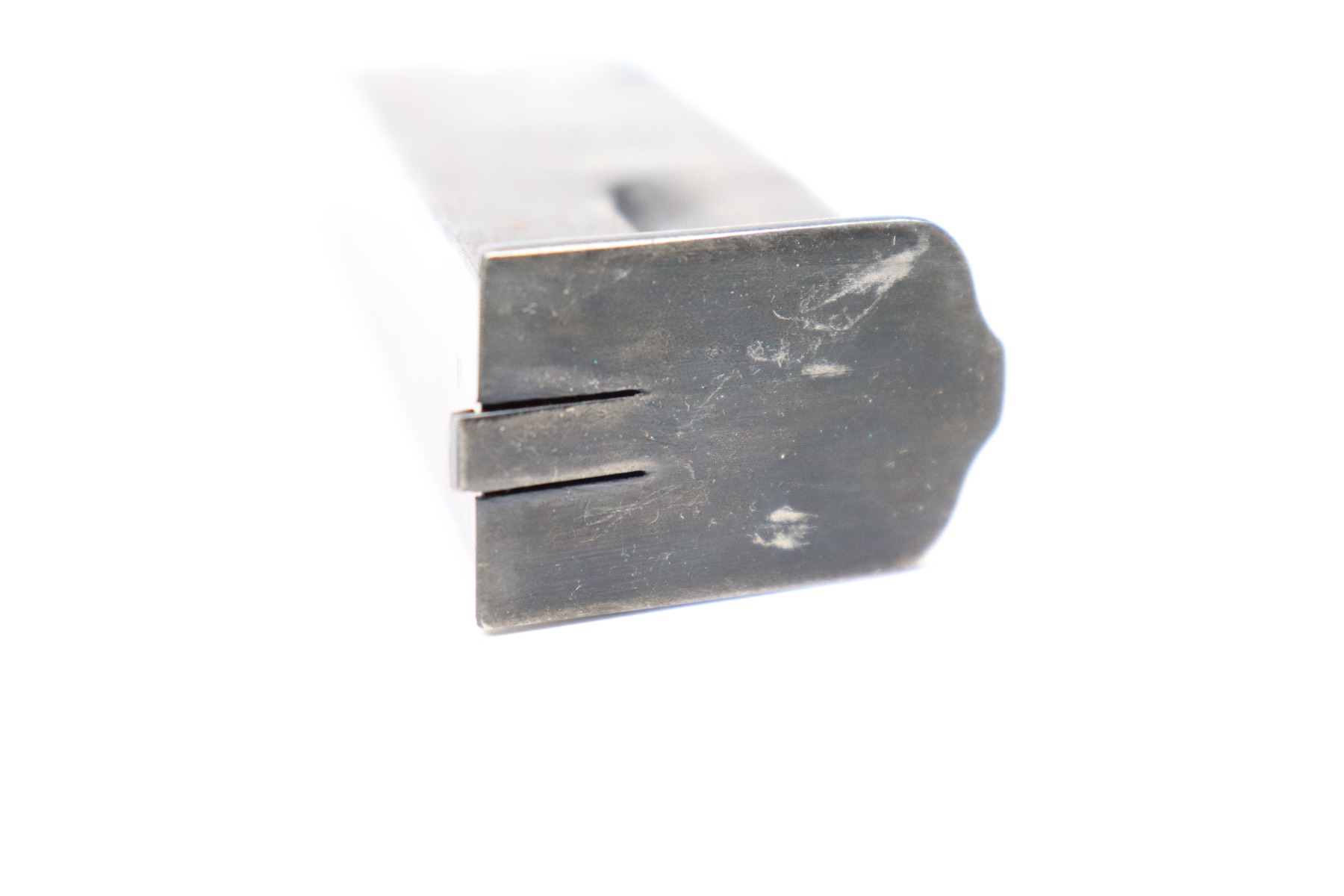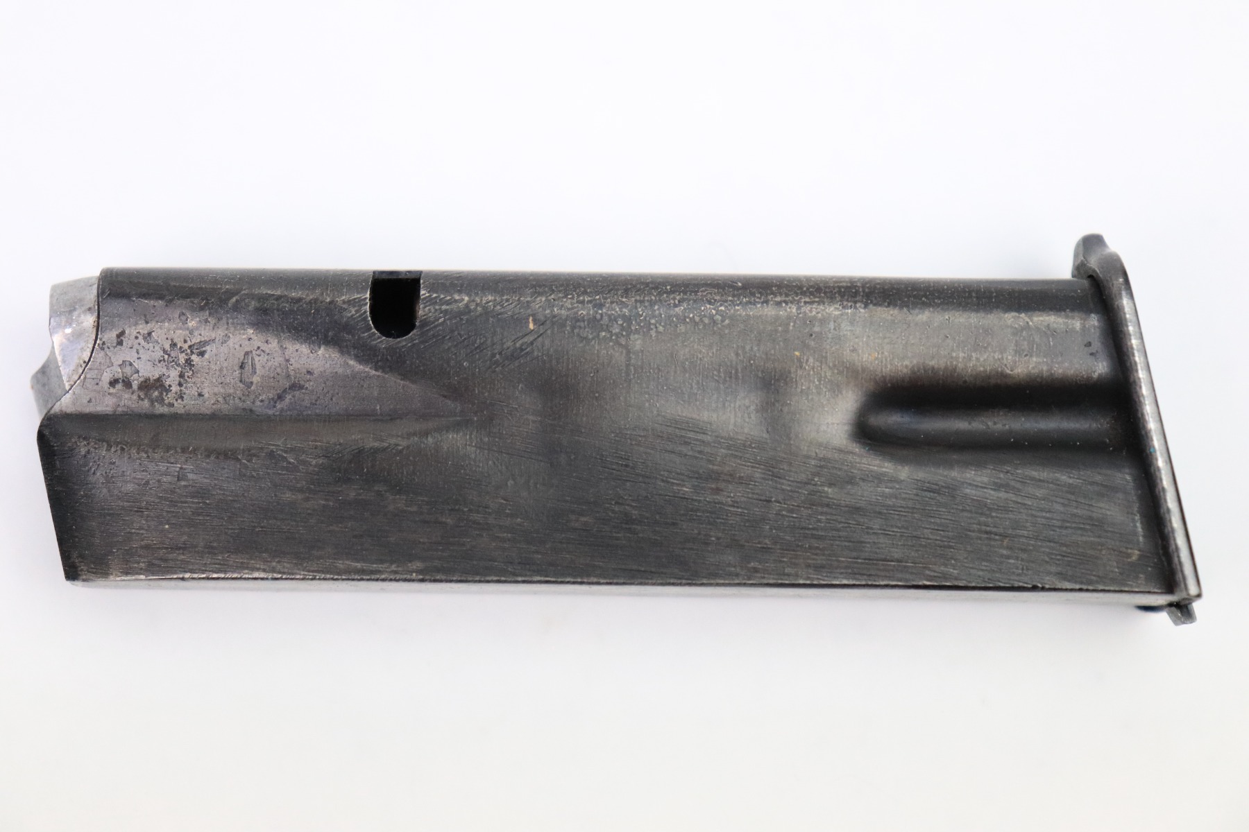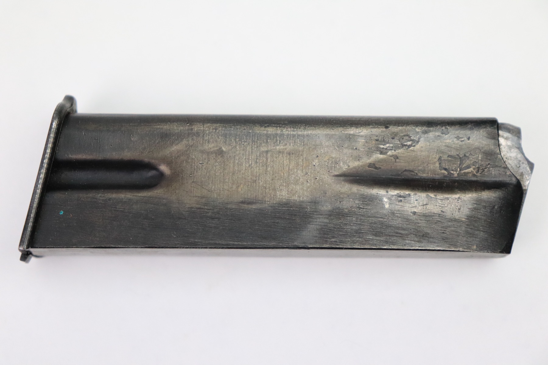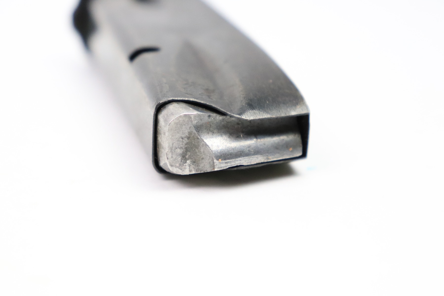 12/1/22 – This is a WW2 era production Commercial High Power magazine. The magazine has a small stamp on the spine and no other markings or proofs. The finish is thinning and spotty throughout the magazine and there is some mild surface patina, but no rust or pitting. The spring is strong and fully functional.