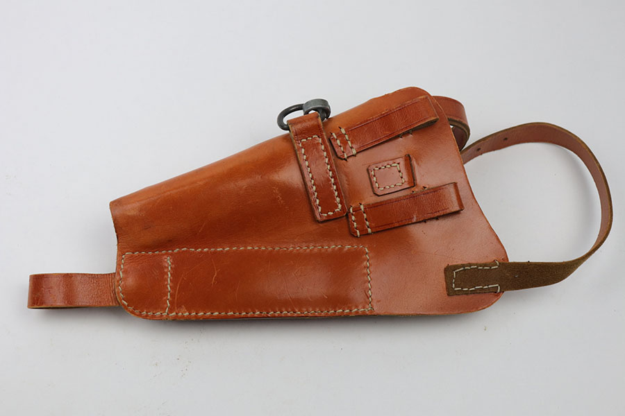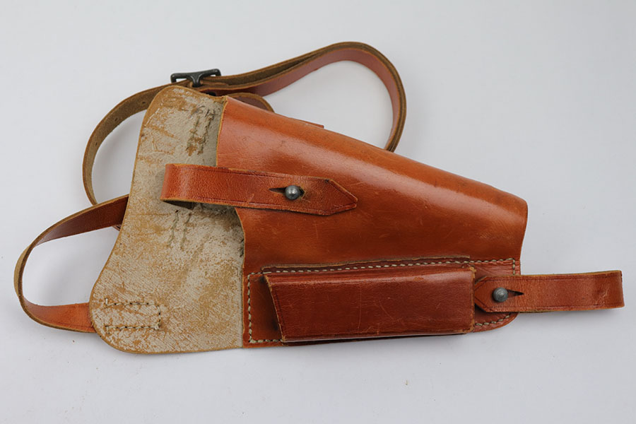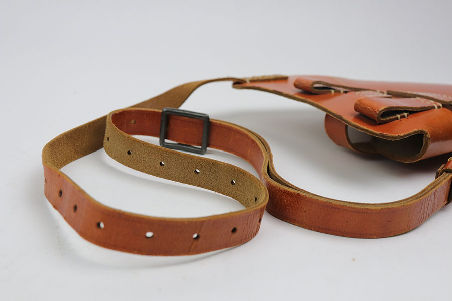 12/28/22 – This is a shoulder holster for a FN High Power Pistol. Most likely post war production. Excellent condition with very clean light brown leather and all stitching in tact. There are no stamps or markings on the holster to determine maker or date.