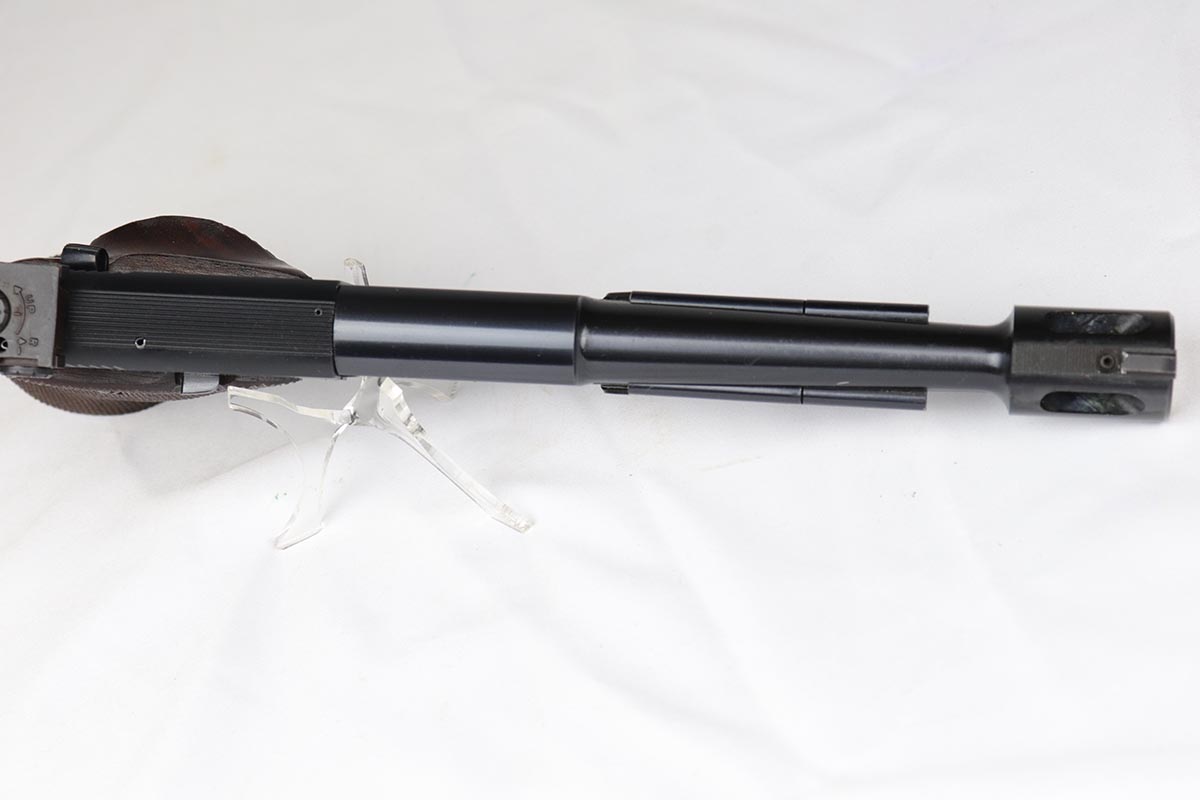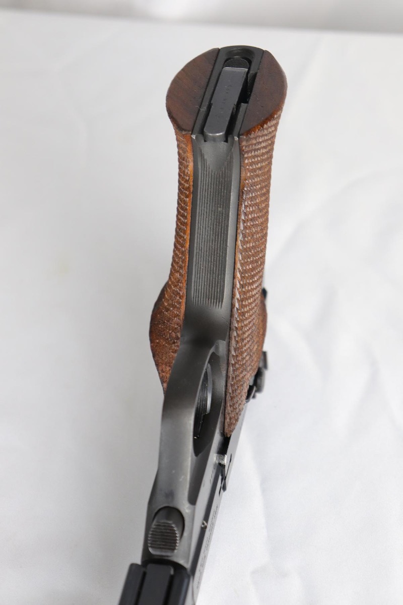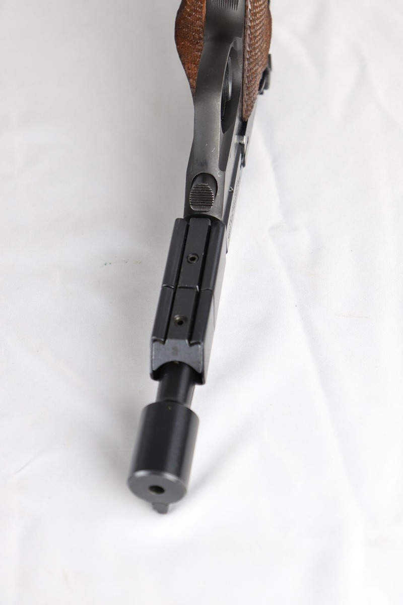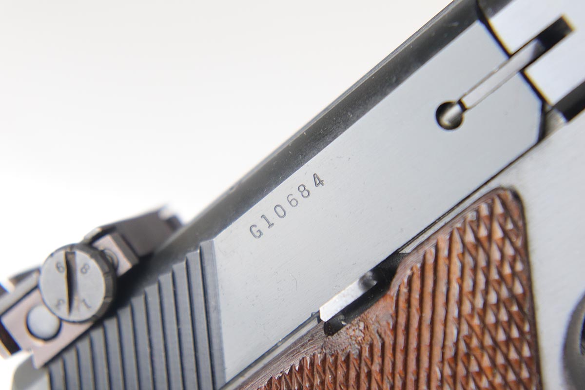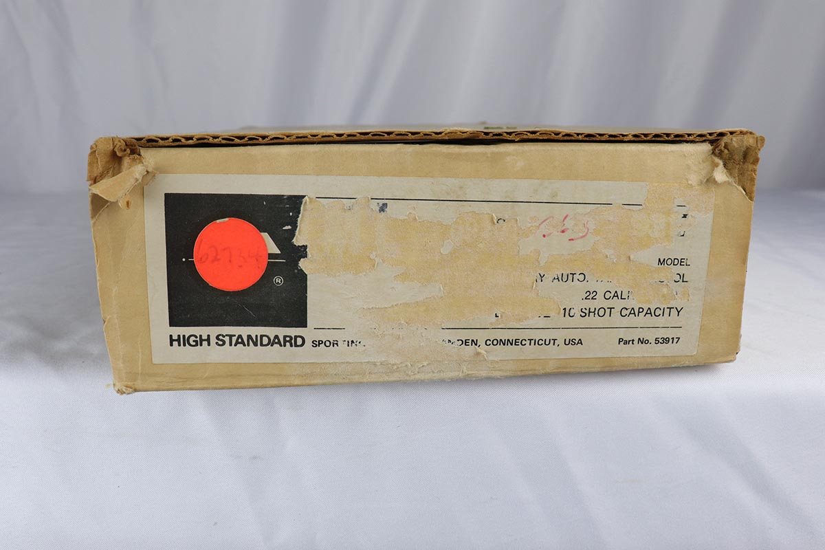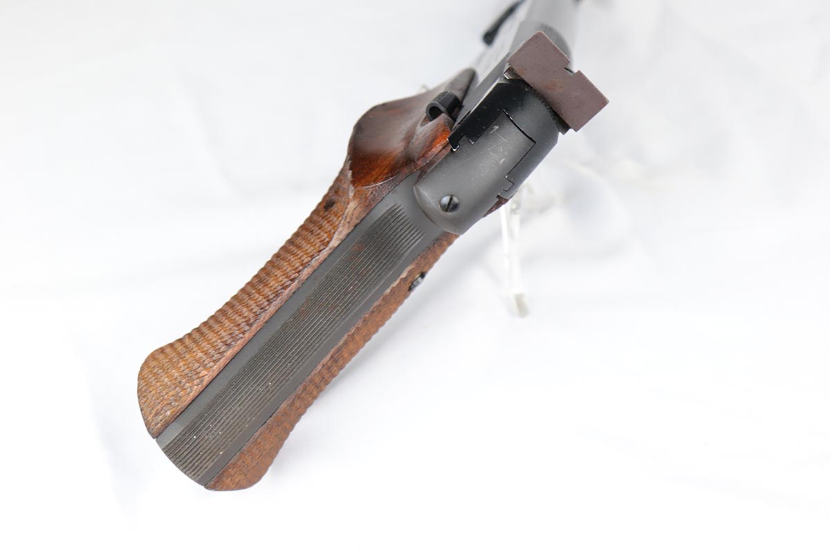 6/12/18 – This gun is considered to be the rarest of all the Olympic High Standard models, as only about 200 were made in the early 70s with a G-prefix serial number. This gun is minty with just a hint of muzzle wear on the left side. It appears nearly unfired, in the box. All Olympic model guns were chambered in .22 short, and this one has a mint bore and grips.