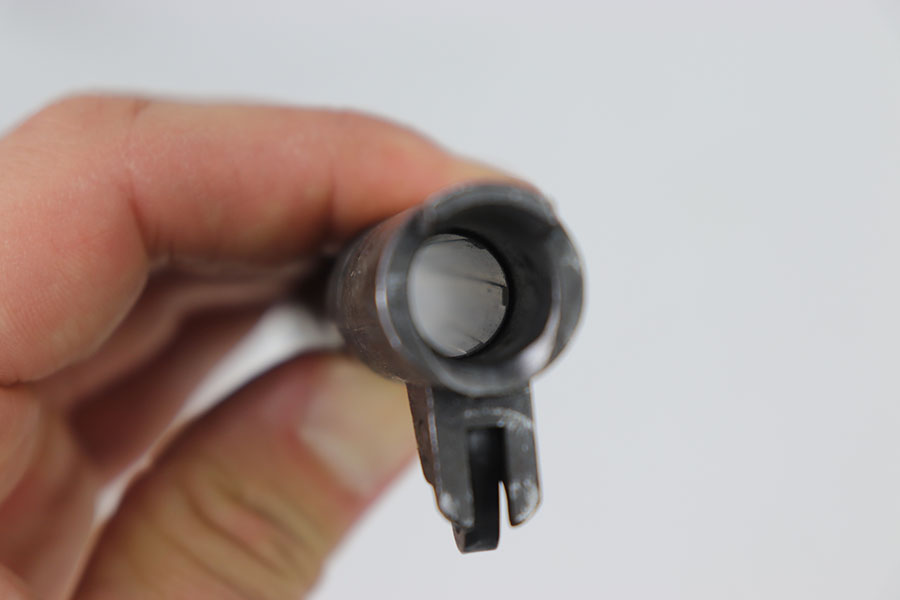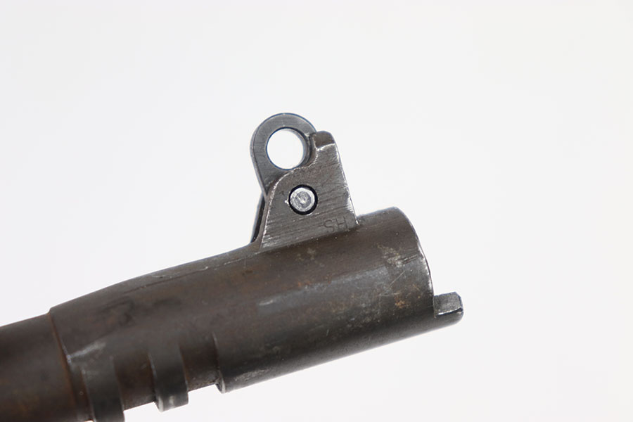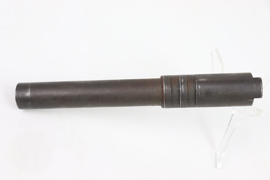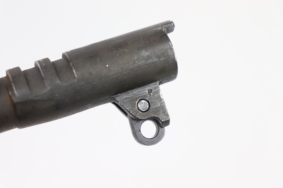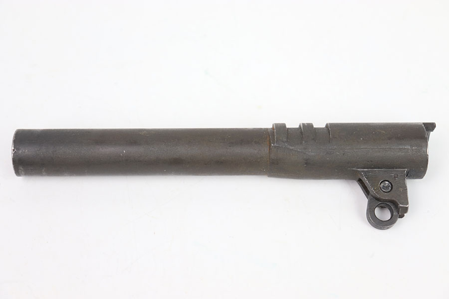 5/31/24 – This is an original High Standard – Remington Rand/Ithaca 1911 barrel. This barrel is marked “HS” on the right side of the lug indicating “High Standard” and a “P” on the other which indicates it is either a Remington Rand or an Ithaca. This barrels dull finish is in good+ condition with only a few minor wear marks throughout mainly around the muzzle of the barrel and some light patina. The bore is a 8/10, very clean with nice rifling. The barrel comes with a pin and link.