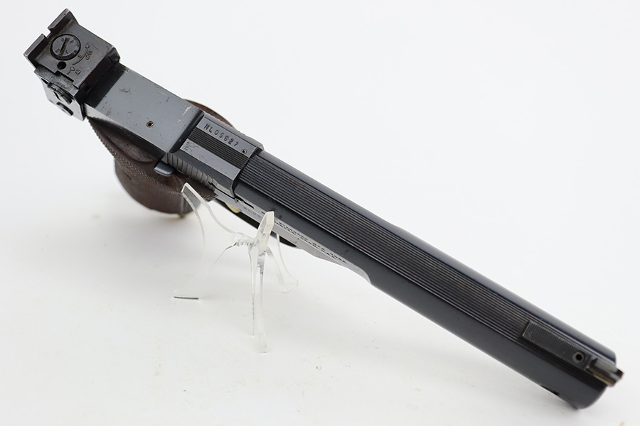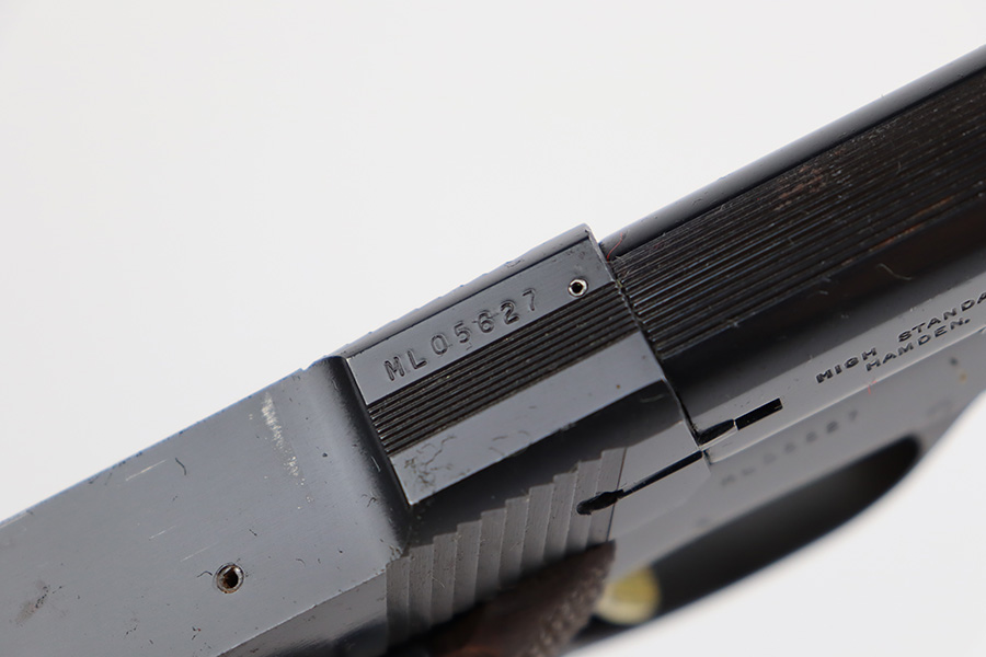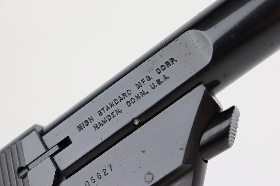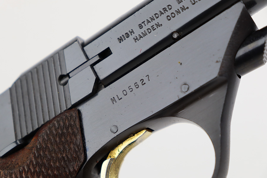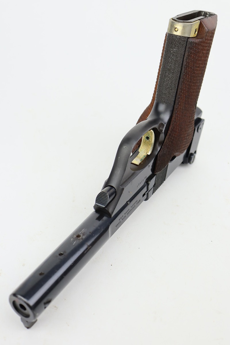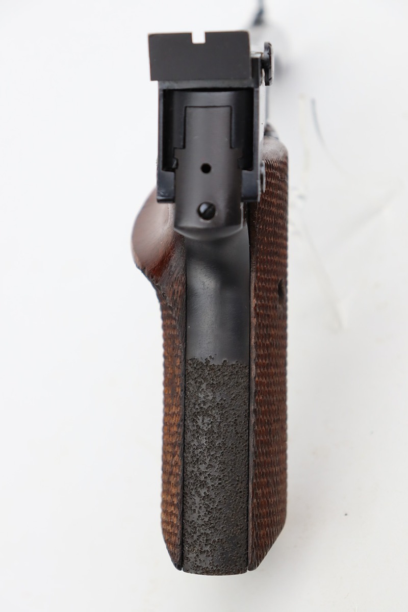 8/7/23 – This is an excellent example of a High Standard Supermatic Trophy, manufactured in the 1960’s and chambered in .22 LR. It is matching and has retained about 98% of its original finish. While there is very little actual finish loss, there is light spotty oxidation along the barrel. An area of light scratching on the underside of the barrel around one of the screw holes. Fitted with excellent wood grips. Comes with one proper magazine. Minty bore. The front sight appears to have been modified.