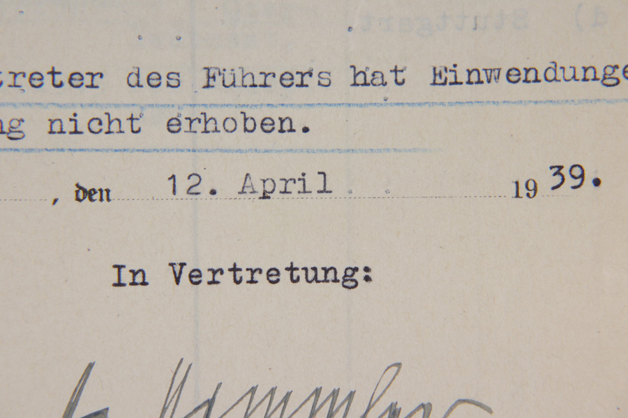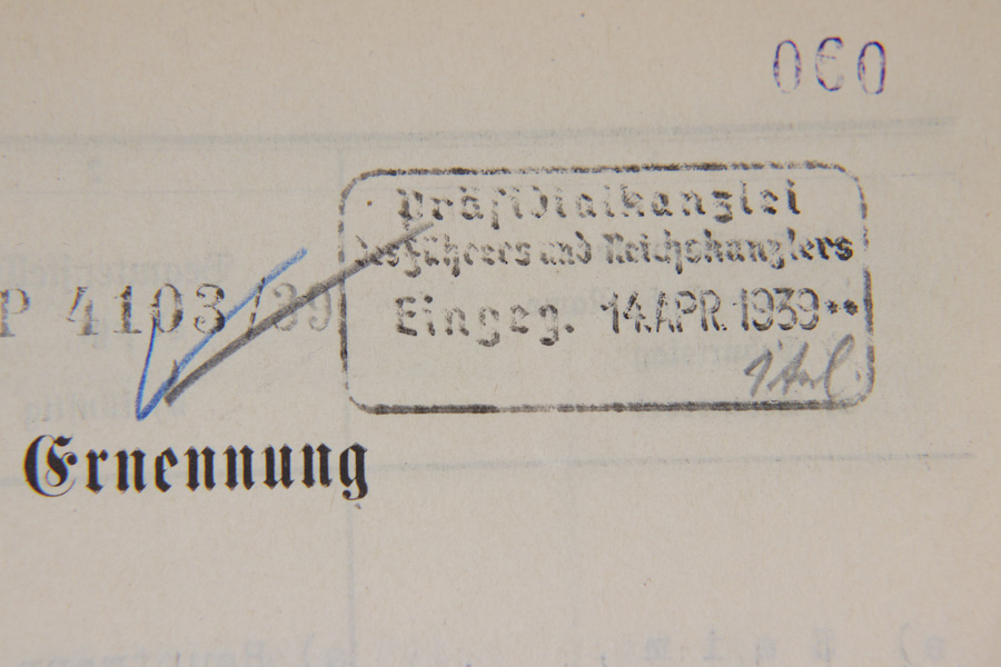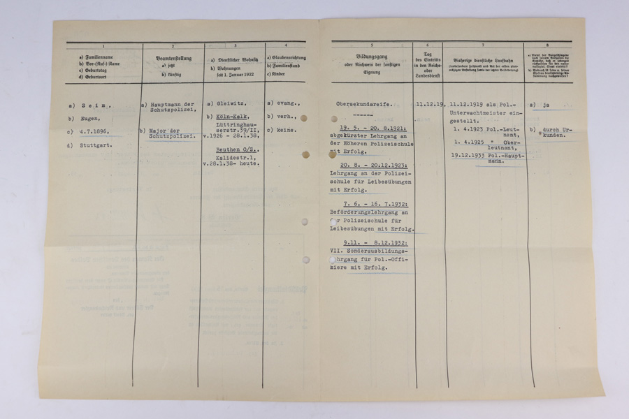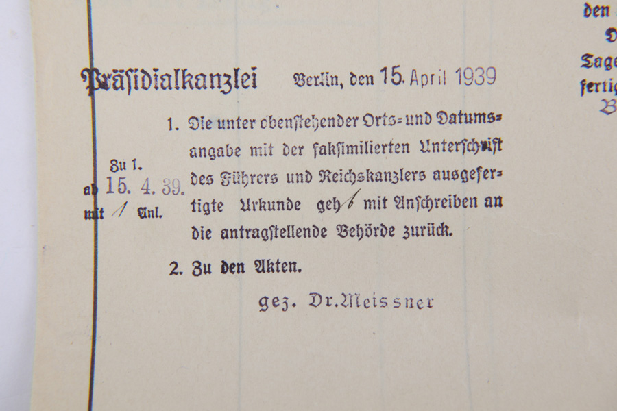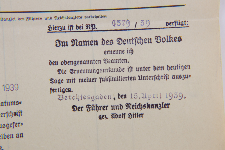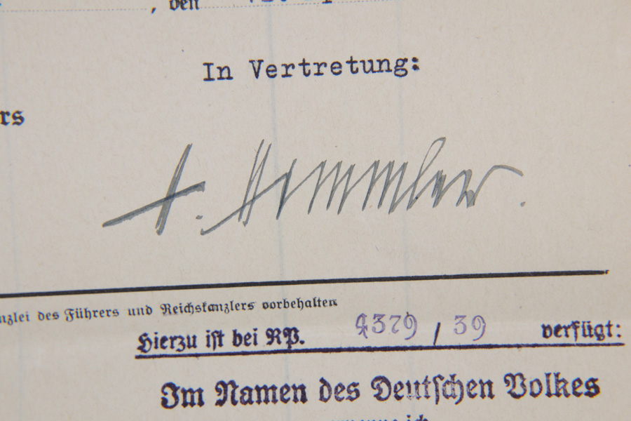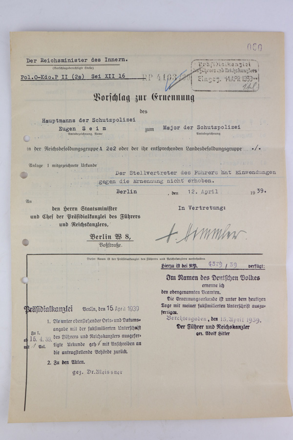 1/2/19 – This document features an original live-ink signature of Reichfuehrer SS, Heinrich Himmler. Dated April of 1939, it is a proposal for the promotion of one Eugen Seim from Nazi Police Captain to Police Major. The document is in amazing condition with crisp edges, no stains, and only minor creases where it was folded. Guaranteed original document and signature!