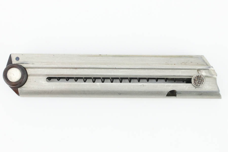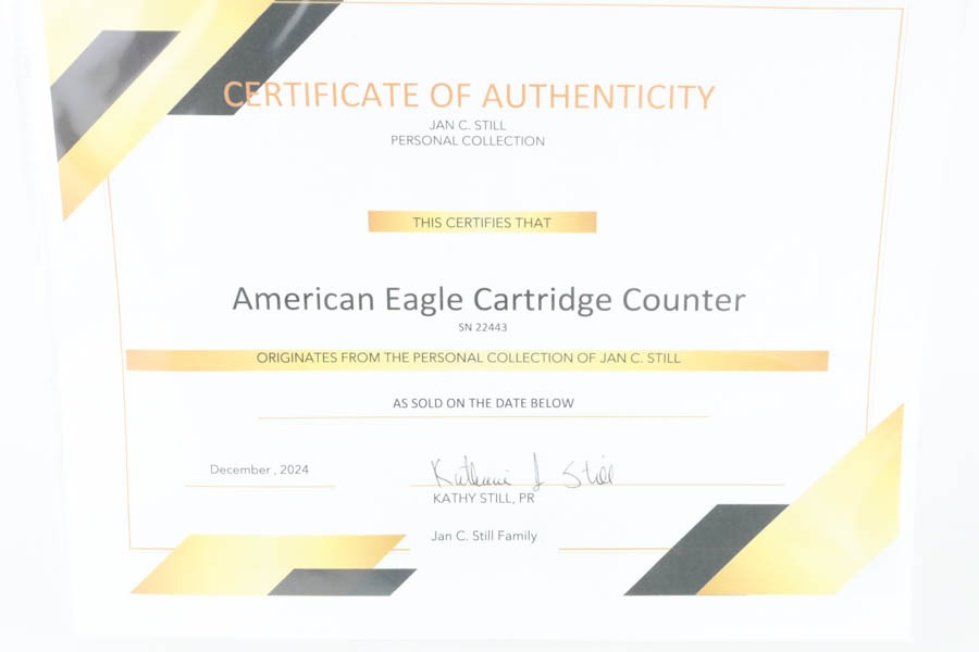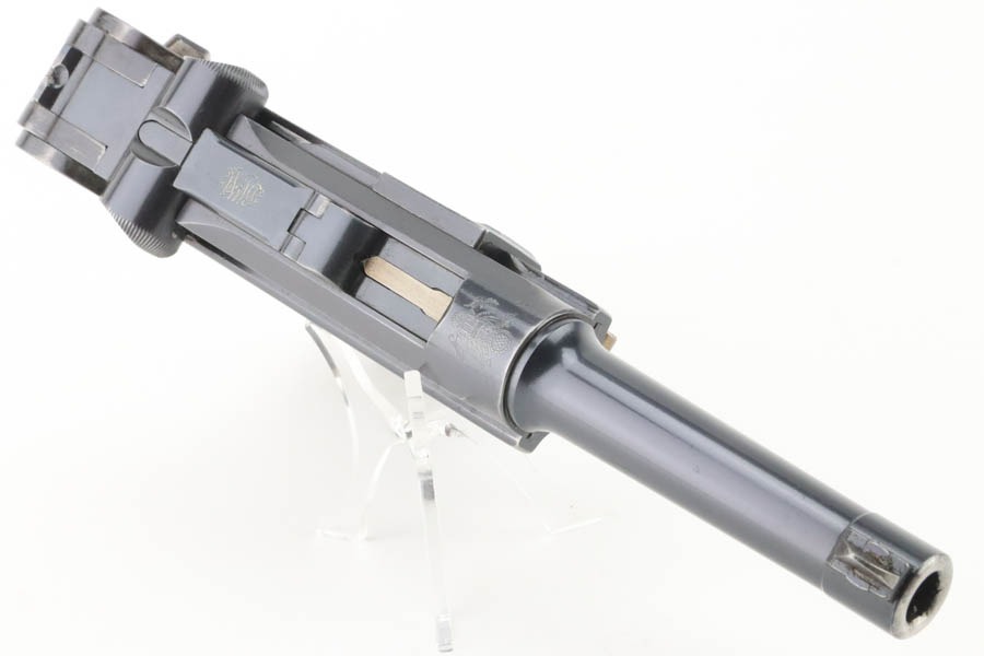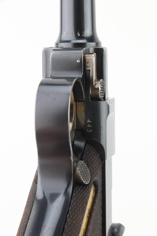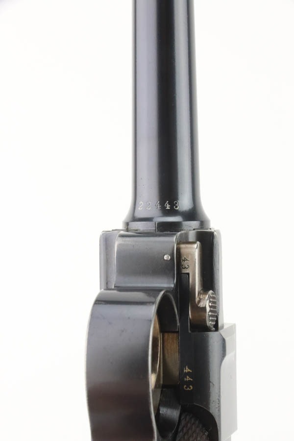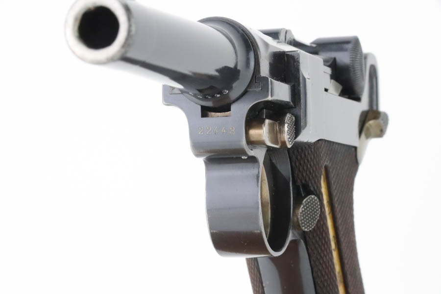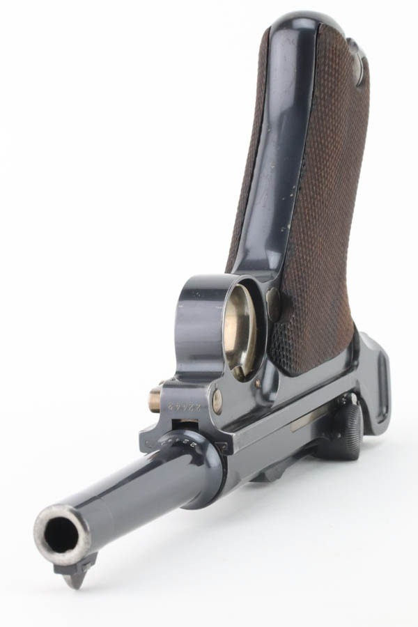 11/5/24 – From the famed collection of author Jan Still, this is an extremely rare and historically significant DWM Model 1902 Cartridge Counter Luger. One of only 50 produced, all in the serial range of 22,401-22,450. Produced on order from the U.S. Board of Ordnance circa 1902-1903, the Cartridge Counter Luger was originally requested as a straight 1:1 replacement for a batch of Lugers already in American inventory, an upgrade from 7.65mm to the more potent 9mm. These Lugers were fitted with the Powell Indicating Device, which consists of a numbered guide bar and celluloid plastic window installed in the left grip panel, and a specially prepared magazine with an extension on the left side of the follower. When the magazine is fully loaded, this follower extension rests at the “7” position, advancing upward with the follower as rounds are discharged, permitting the soldier to determine his remaining rounds by merely looking at the grip. In the end, the design was rejected as the U.S. military desired more stopping power than a 9mm pistol provided. The Cartridge Counter examples were all chambered in 9mm Luger and featured the early fat barrel design. All numbered parts on this particular example are matching, and the pistol is in excellent condition. It retains 96-97% of the original blue, with minor wear on the high points, and front strap/trigger guard. Strong, shiny bore with minor frost inside. The grips are in good condition but the celluloid does show a crack in it. Listing includes a certificate of authenticity that confirms it comes from the collection of Jan Still.