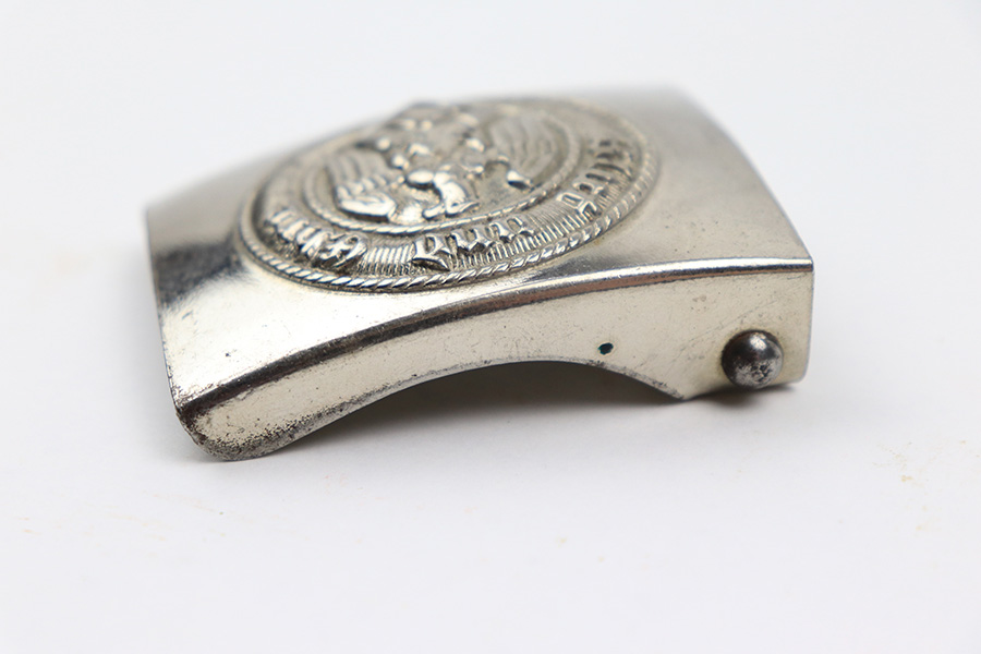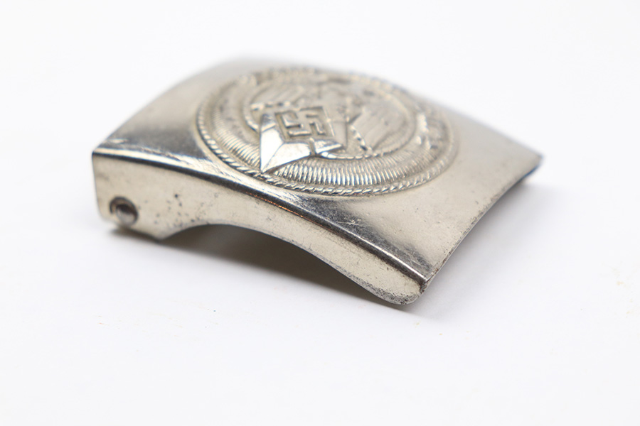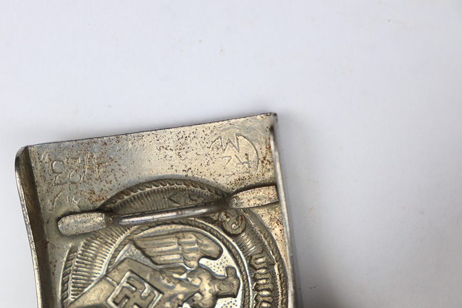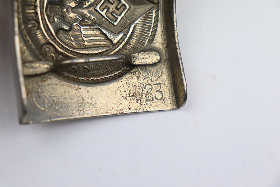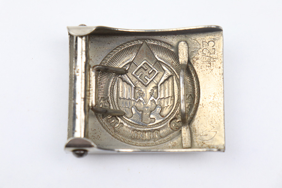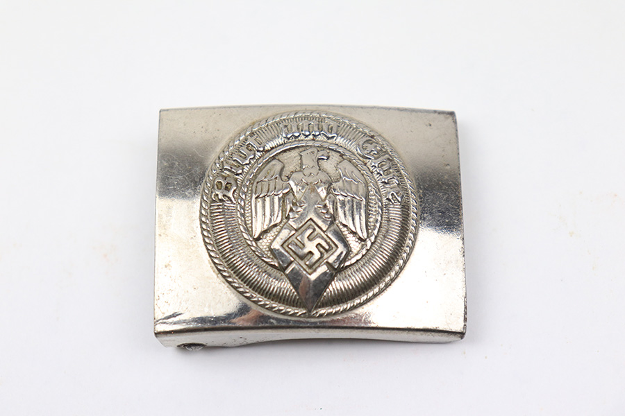 1/27/22 – This is a nicely stamped Hitler Youth belt buckle from WW2. The buckle has a RZM M4/23 maker stamp by Franke & Co. on the reverse. This is a fairly scarce marking to find on these buckles, and we believe this is an earlier variation. The buckle is shiny with some mild surface patina but no rust or pitting.