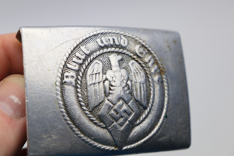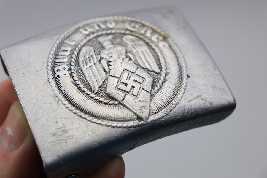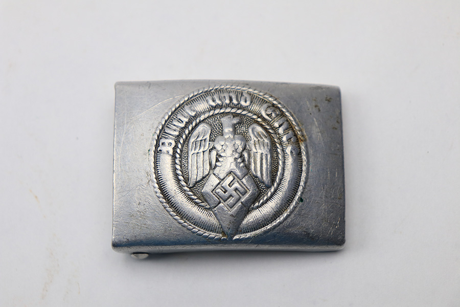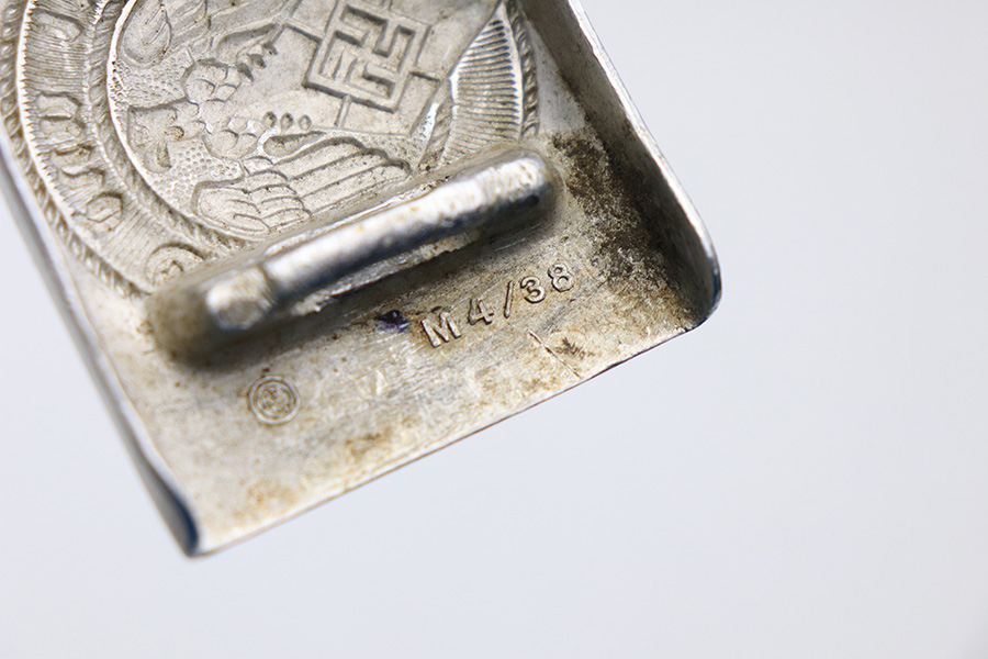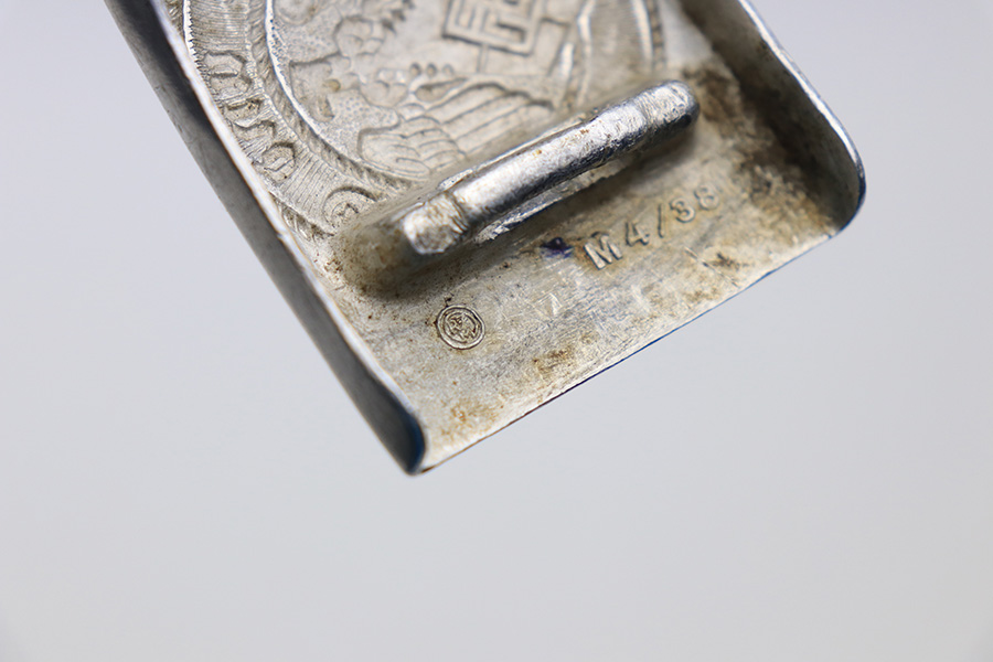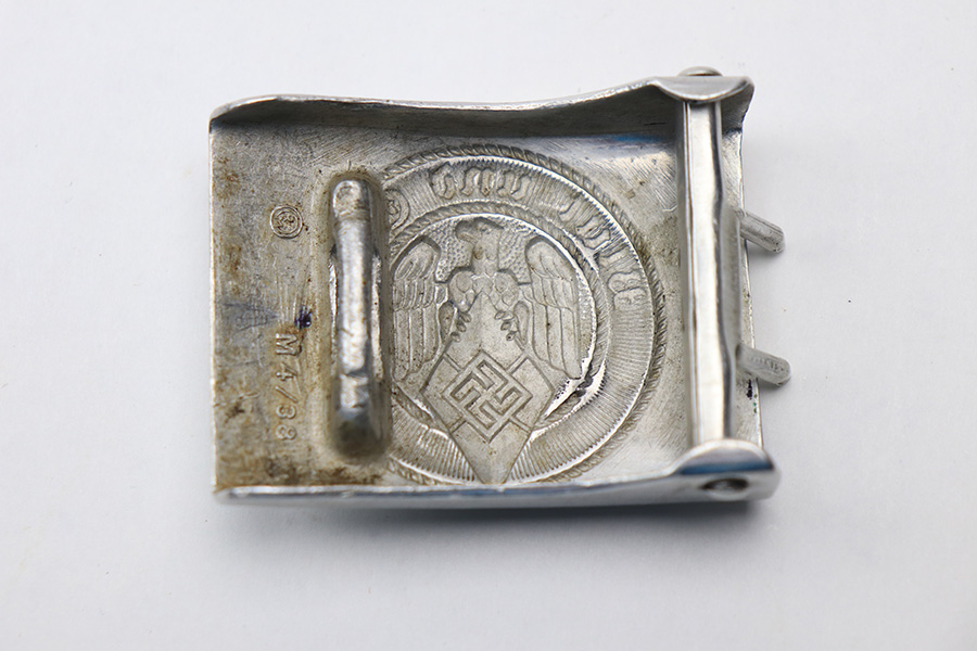 2/9/22 – This is an original WW2 Hitler Youth Belt Buckle. The buckle is aluminum and in good overall condition. The front of the buckle shows some rub wear and general surface wear from previous use and aging. The reverse is maker stamped RZM M4/38.