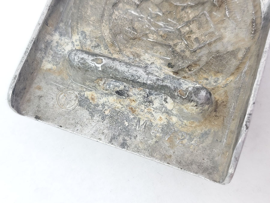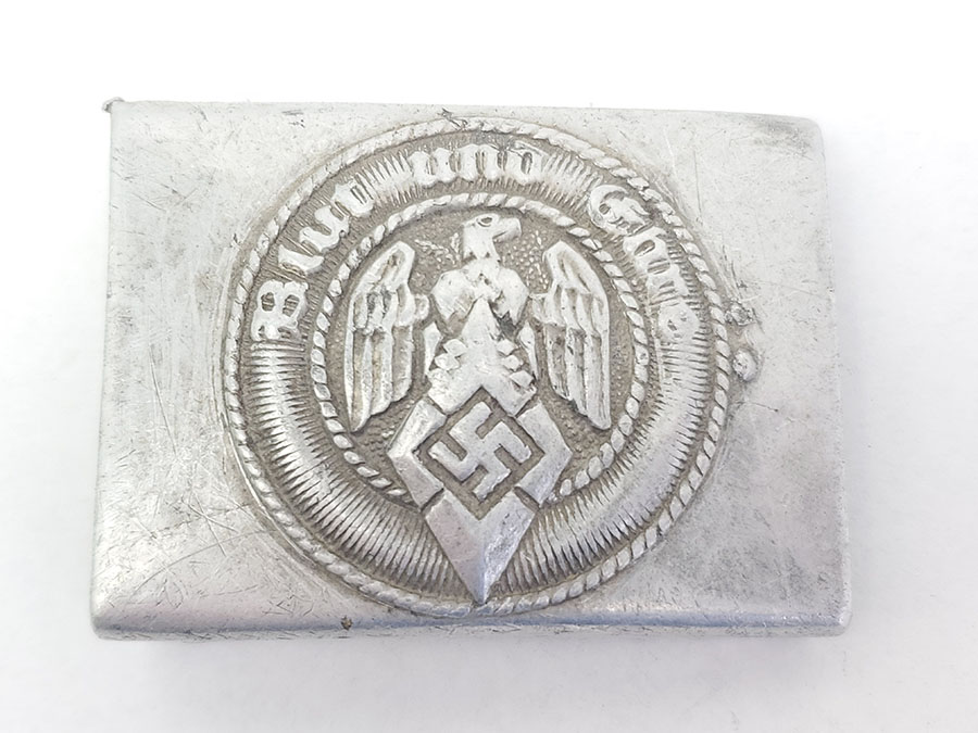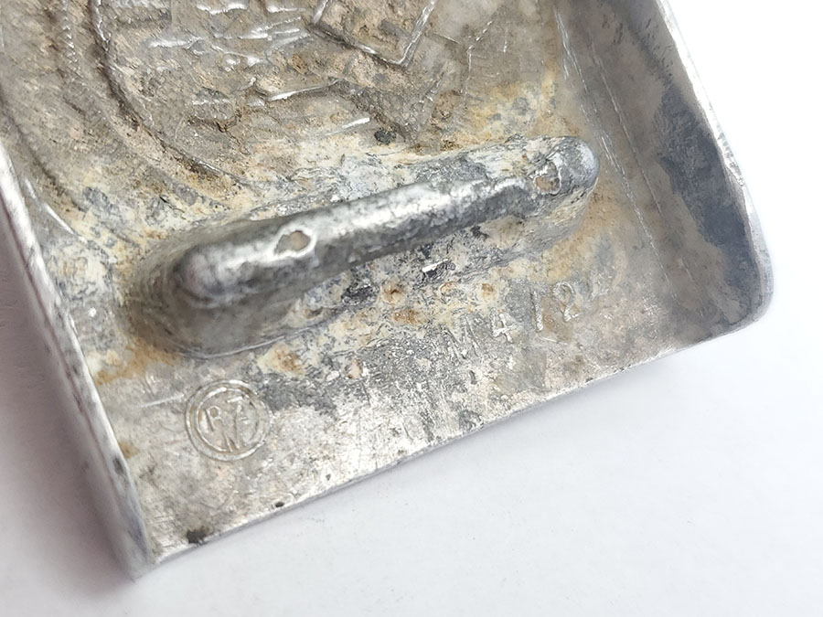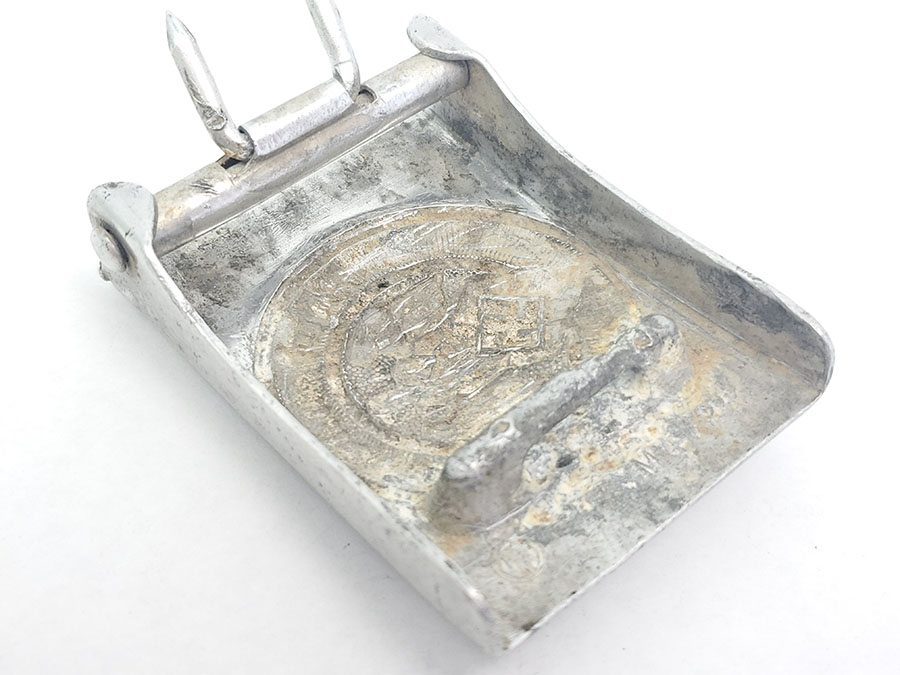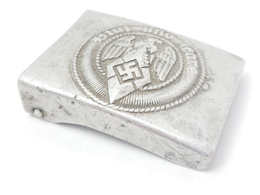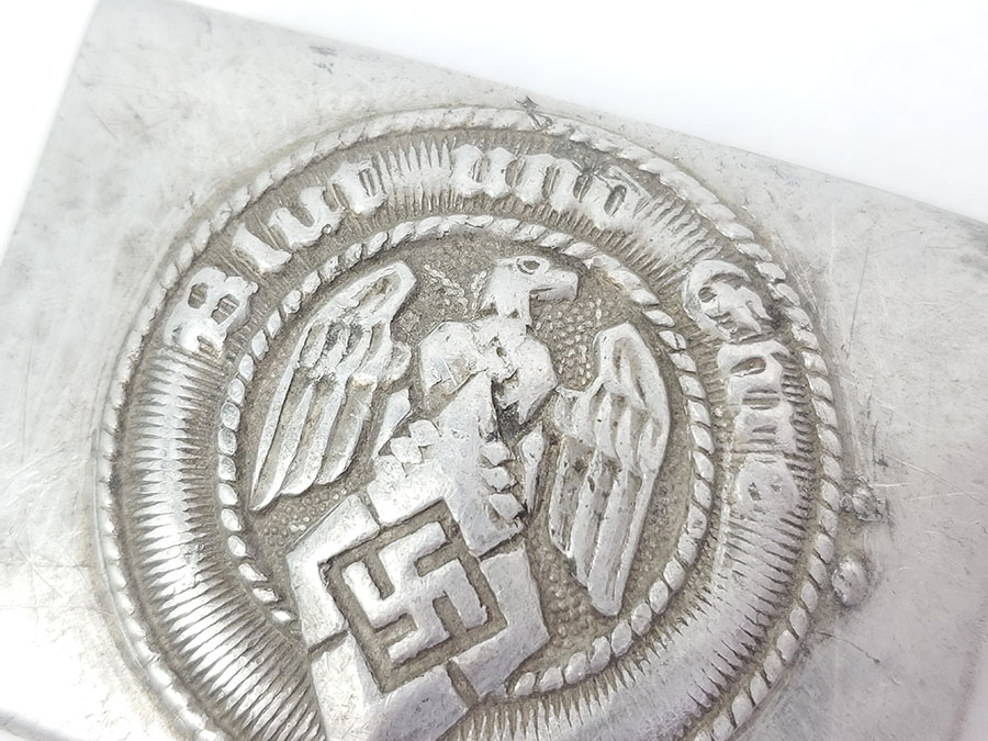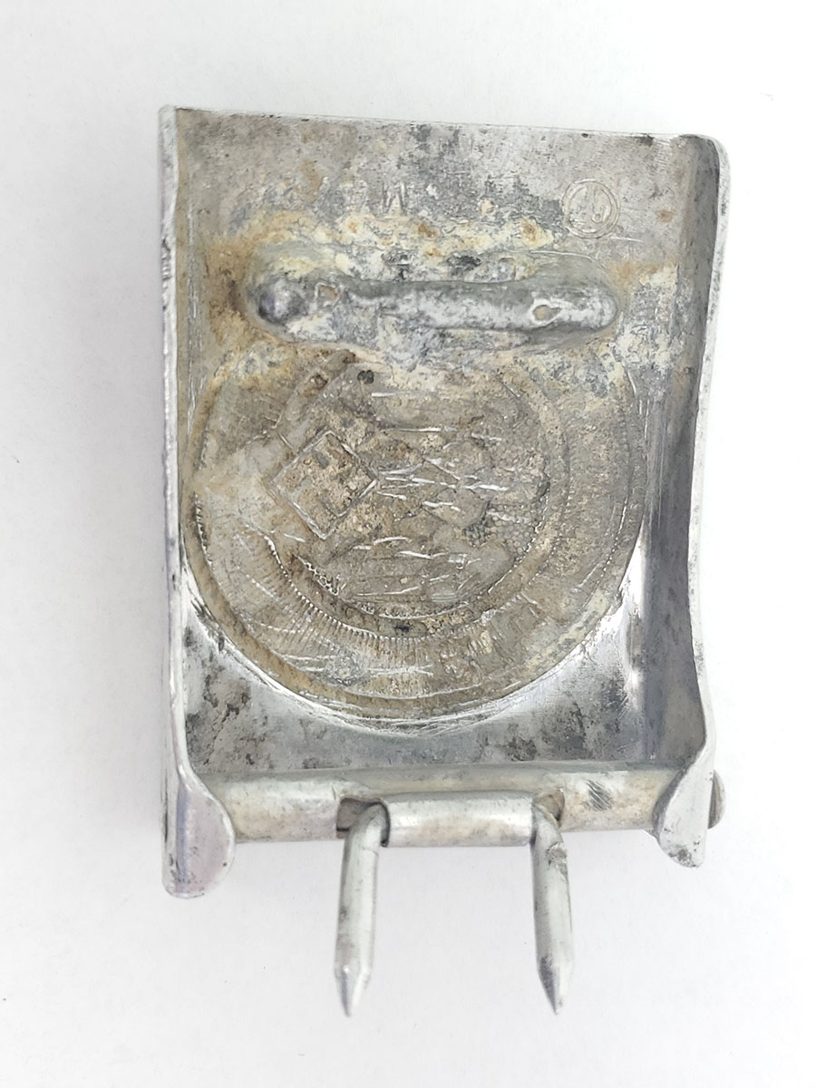 7/13/20 – This is an original Hitler youth belt buckle from WW2. The buckle has an excellent conditioned exterior with some moderate wear on the reverse side. The buckle is later wartime aluminum and stamped on the interior with a RZM maker stamp and M4/24 maker code. There is some corrosion to the fastening loop / hook on the interior, but the dual pronged fastening bar moves freely, and is in great condition.
