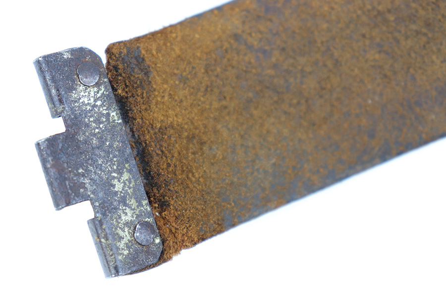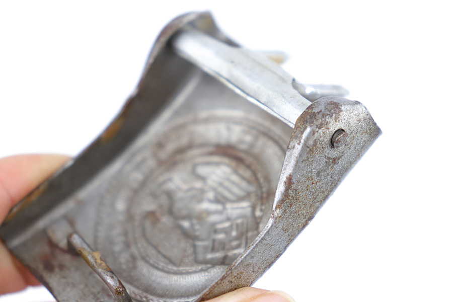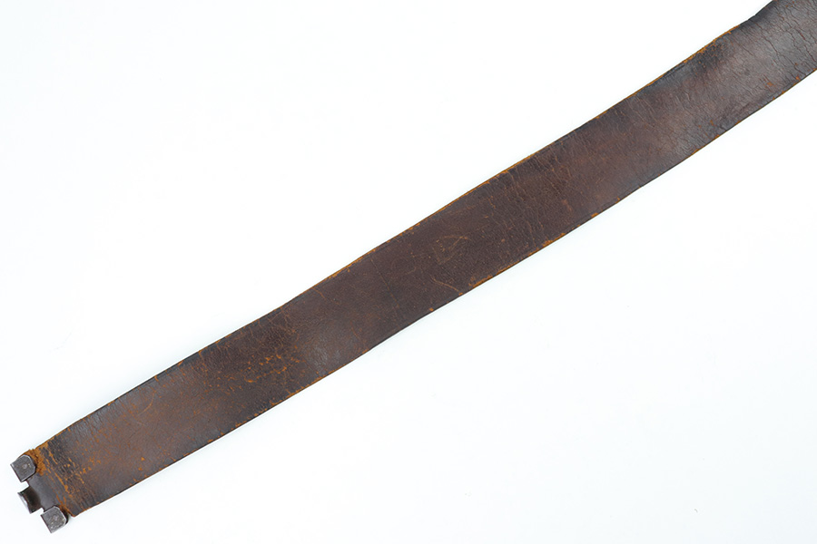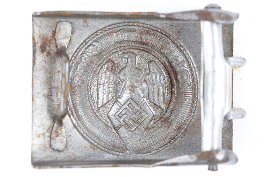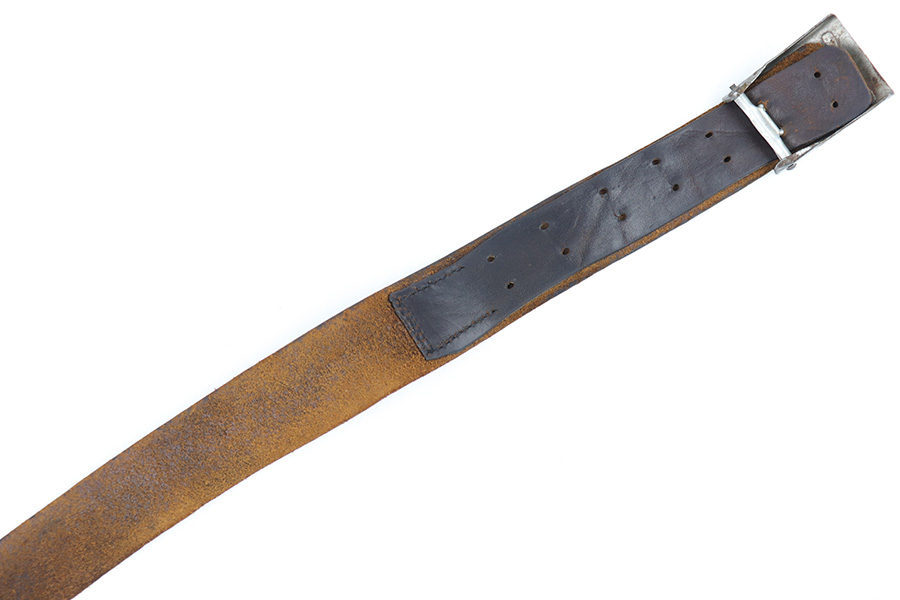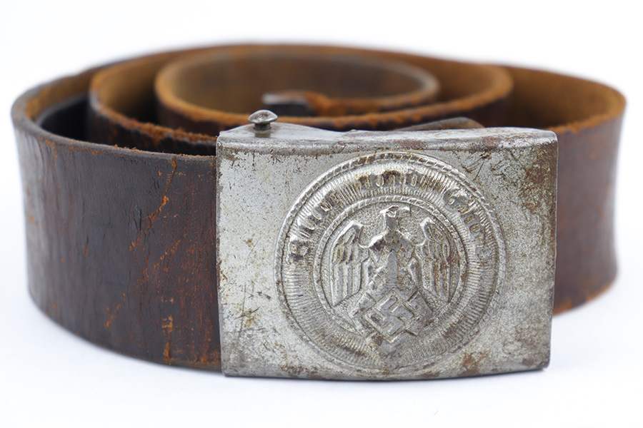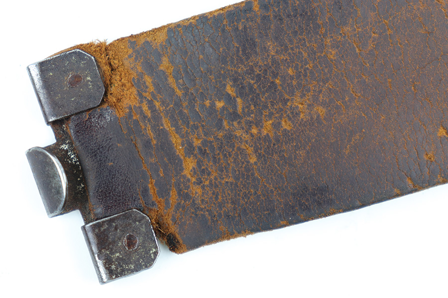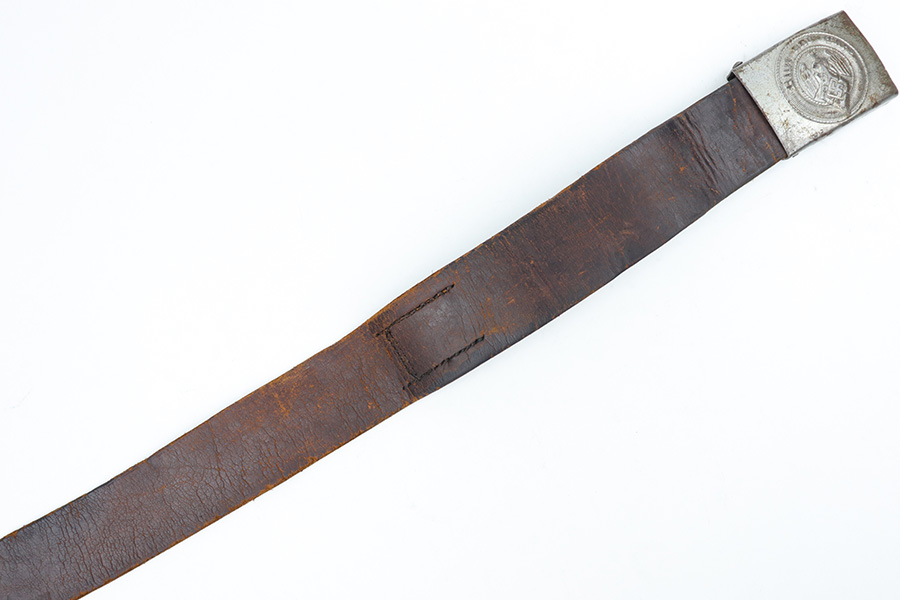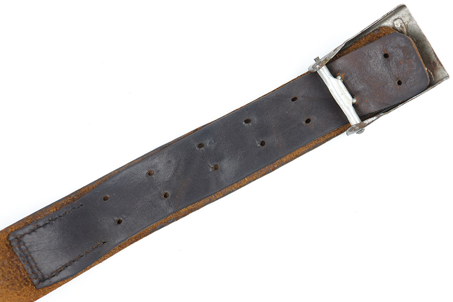 3/27/23 – This is an original Hitler Youth belt and buckle from WW2. The buckle is made from magnetic steel that has a nickel-silver plated finish. This finish is worn throughout with edge wear and surface patina along with discoloration from age and wear. The interior of the buckle is RZM M4/24 stamped by Friedrich Linden. The buckle comes with an original leather belt, which shows similar age and wear to that on the buckle, but no excessive damage. The leather is soft with surface wrinkling throughout. The size-adjustment tab is re-sewn onto the leather belt, but otherwise this example is all original.