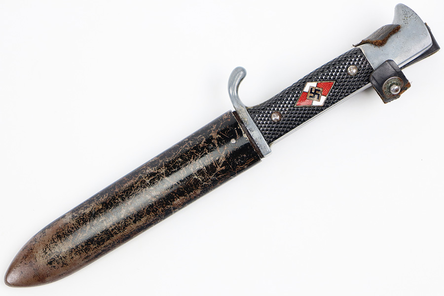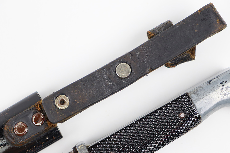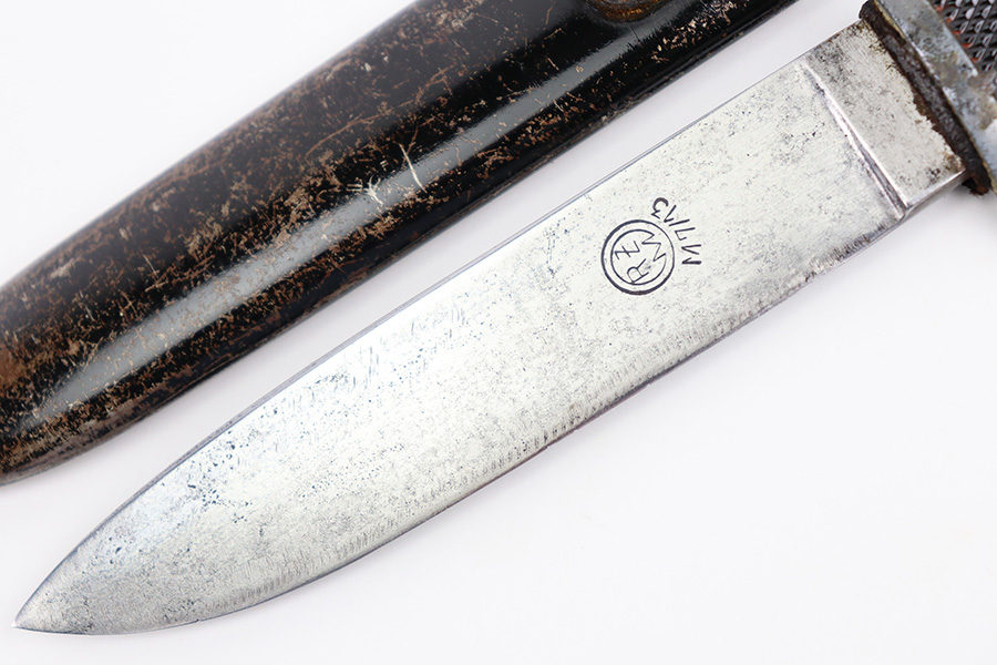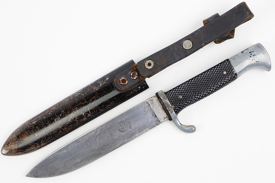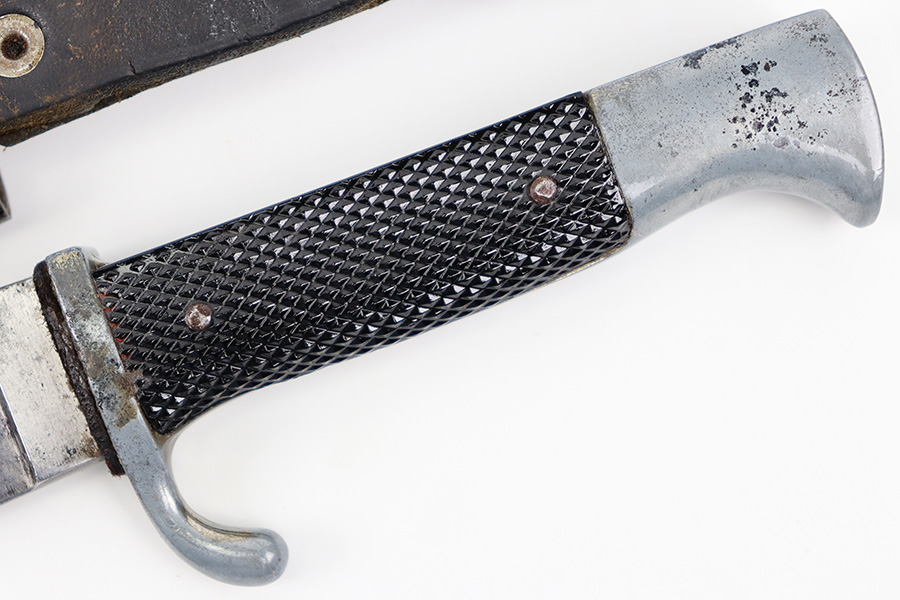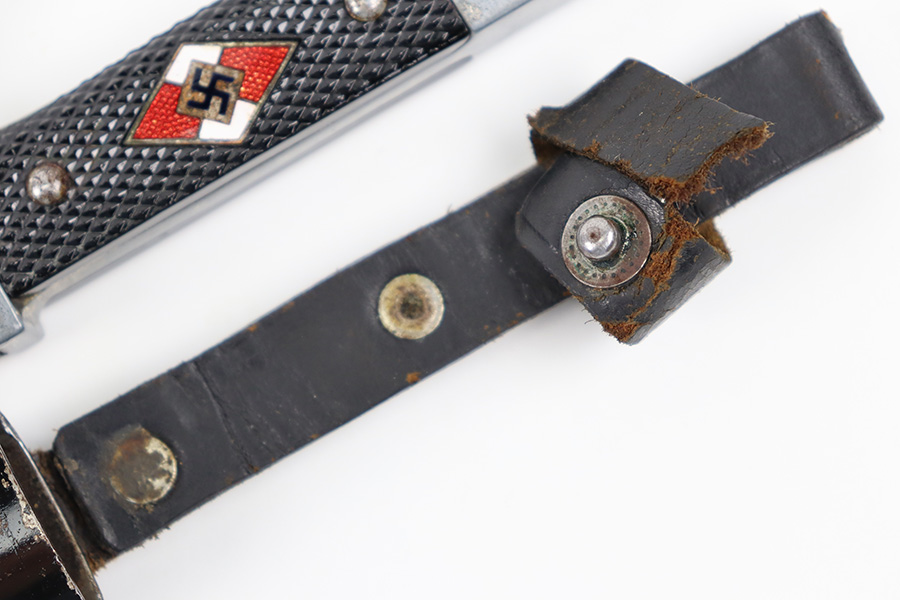 10/24/23 – This is an original WW2 production Hitler Youth Knife. This is a later wartime example with a larger style ricasso. The blade is in great overall condition with some mild surface wear and light sharpening along the edge. The edge also has a few mild nicks and dings from use. RZM maker stamped on one side. The leather stopper is still intact, though worn. Nice original grips and some mild patina throughout the hand guard and pommel. Comes with an original scabbard with leather frog, although the fastening strap is broken on the frog.