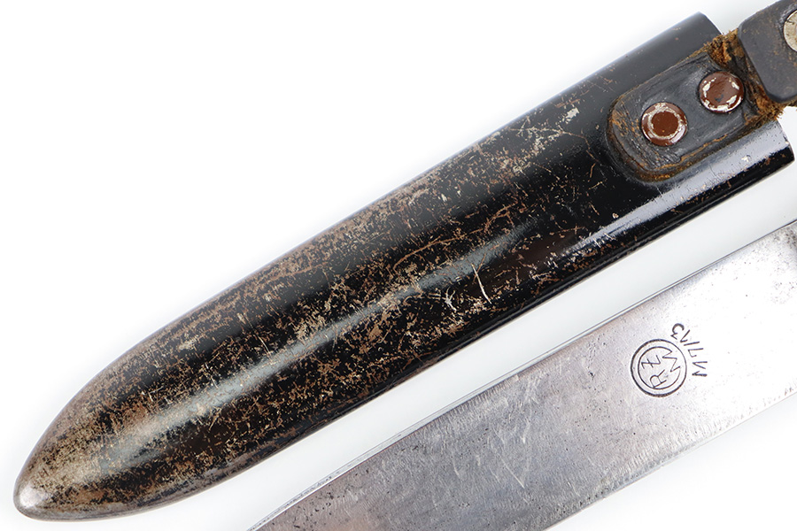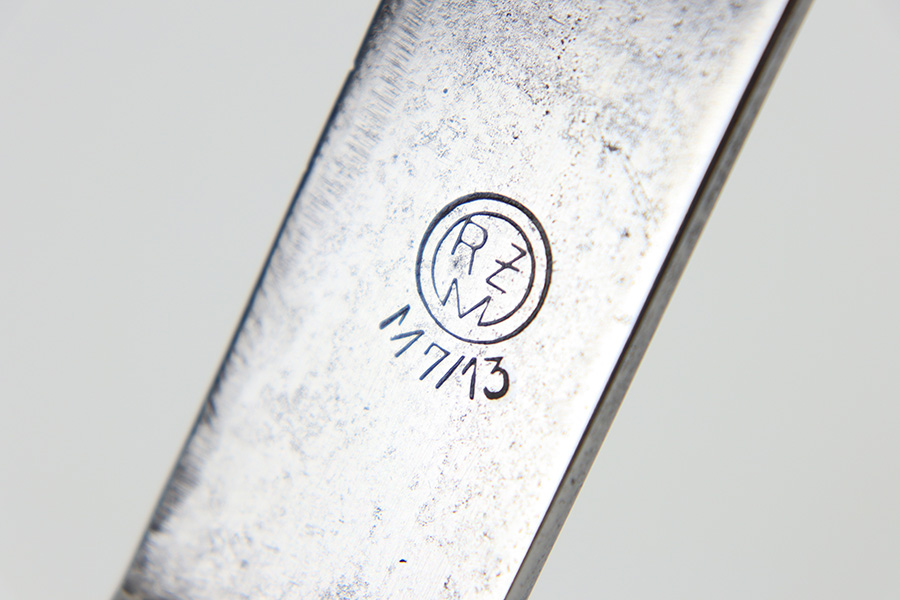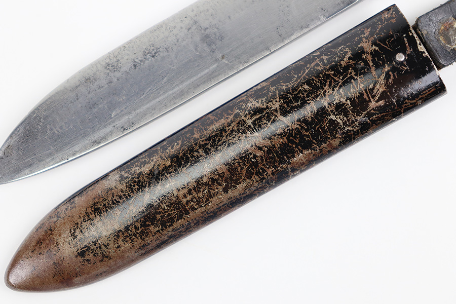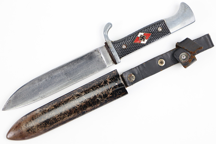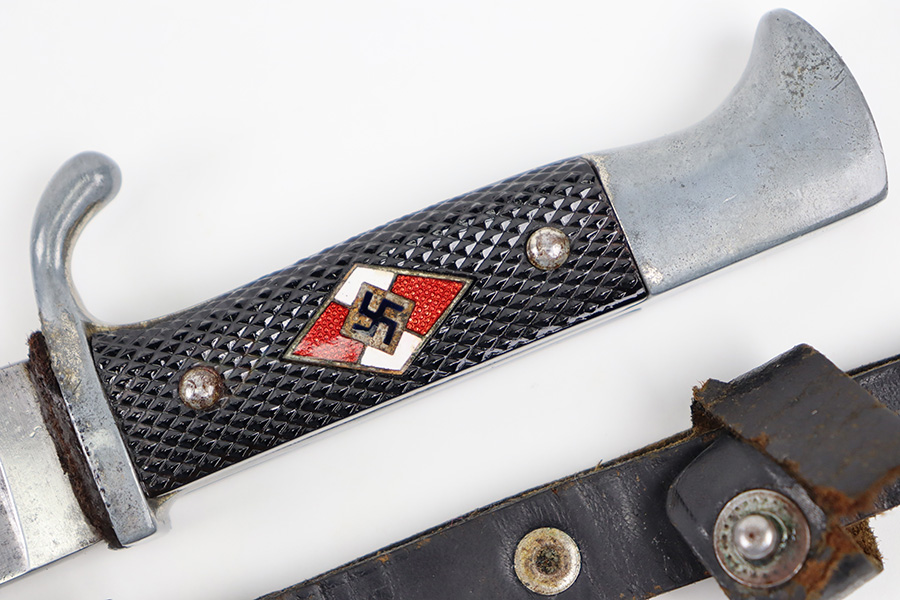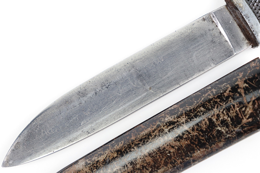 10/24/23 – This is an original WW2 production Hitler Youth Knife. This is a later wartime example with a larger style ricasso. The blade is in great overall condition with some mild surface wear and light sharpening along the edge. The edge also has a few mild nicks and dings from use. RZM maker stamped on one side. The leather stopper is still intact, though worn. Nice original grips and some mild patina throughout the hand guard and pommel. Comes with an original scabbard with leather frog, although the fastening strap is broken on the frog.