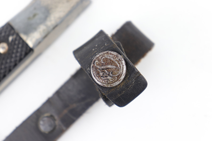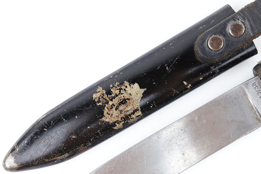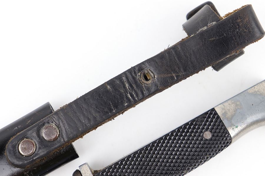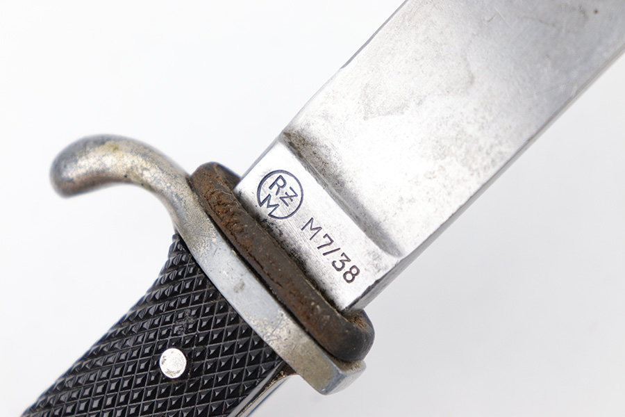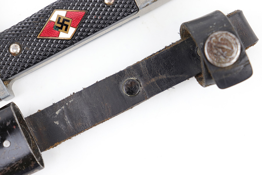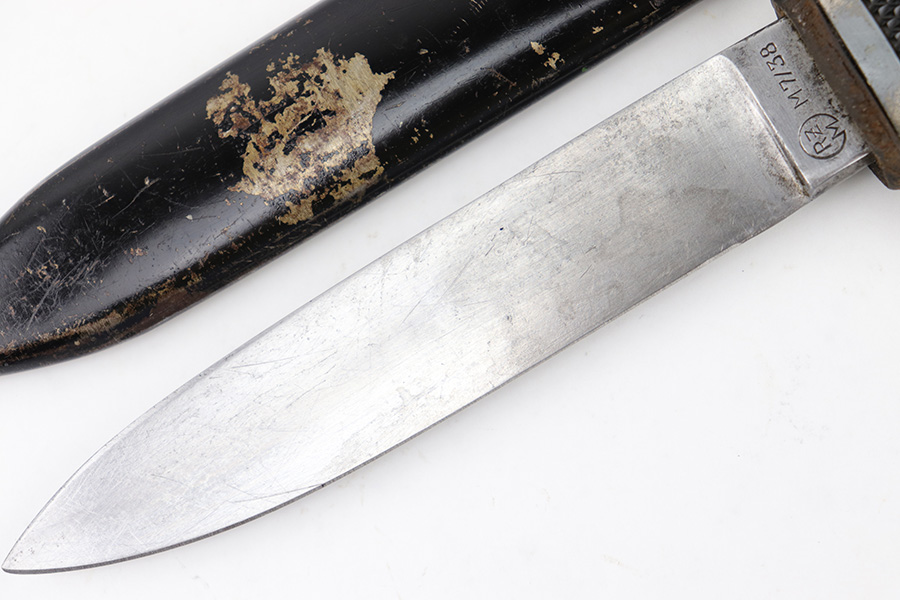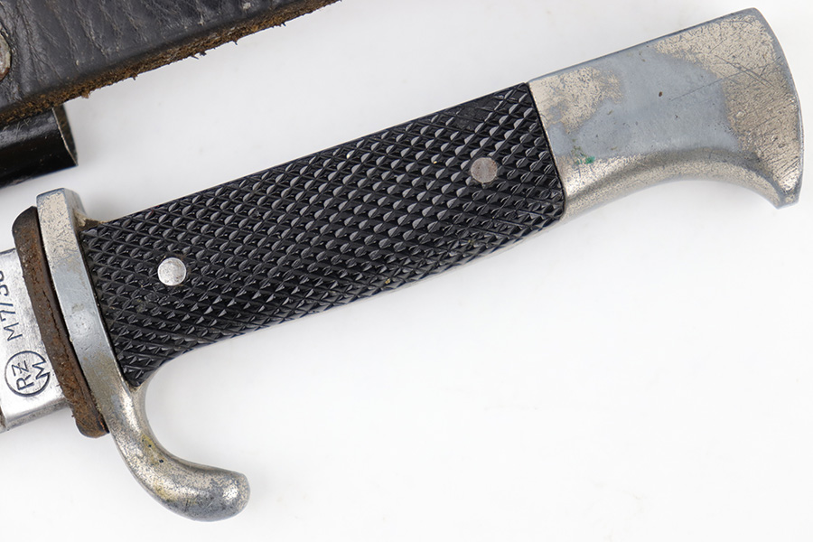 5/25/23 – This is an original WW2 production Hitler Youth Knife with an original scabbard. The dagger is a later wartime production example with a higher ricasso and thicker blade. The ricasso is RZM maker stamped on one side with code M7/38 for Paul Seilheimer. There’s light oxidation and surface scratching on the blade, as well as signs of professional / machine sharpening along the edge. The leather stopper is original and intact. The hand guard and pommel have light surface patina and natural aging wear. The grips are excellent with a strong diamond pattern. The scabbard has light surface patina but no major issues. The original leather frog is in great condition.