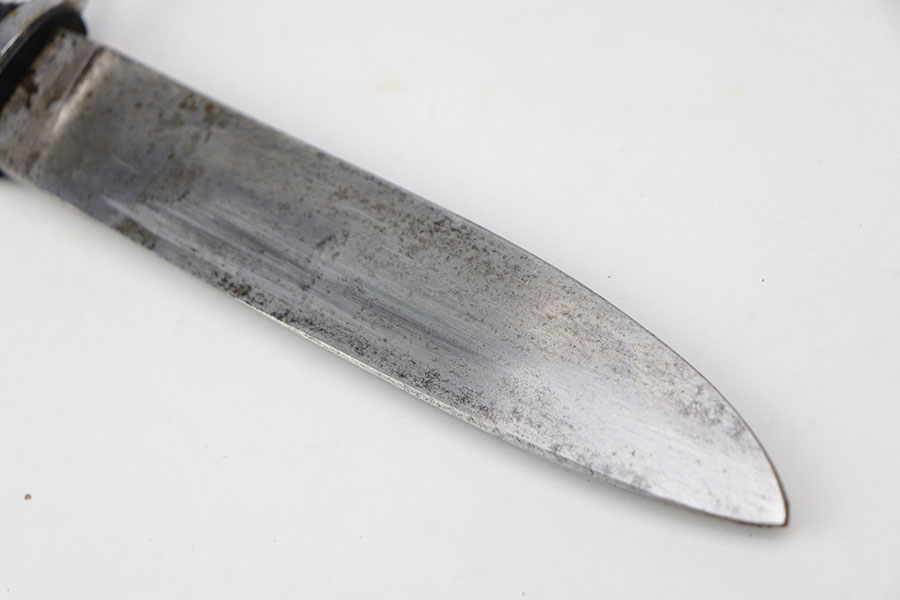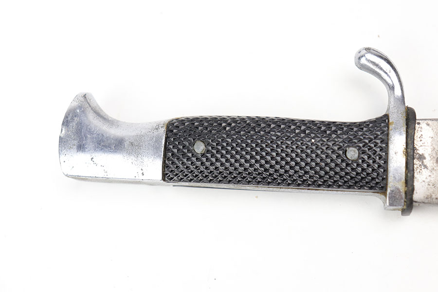 9/17/20 – This is an original WW2 wartime production Hitler Youth knife with an original scabbard. The blade is completely unmarked and in good overall condition. There is some light surface scratching / scabbard wear as well as signs of minor use wear near the edge. some light spotty oxidation throughout. The handle is all in tact and original. Leather stopper still in tact as well. The scabbard has no dents and most of the black finish in tact. Leather frog is complete as well.