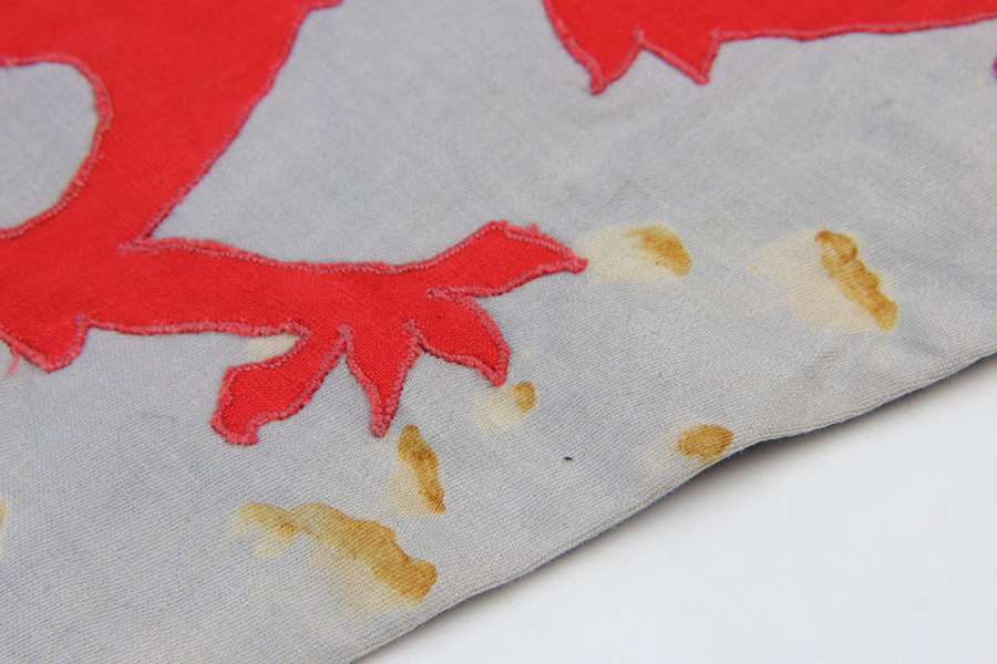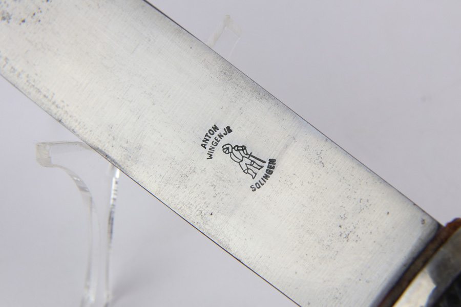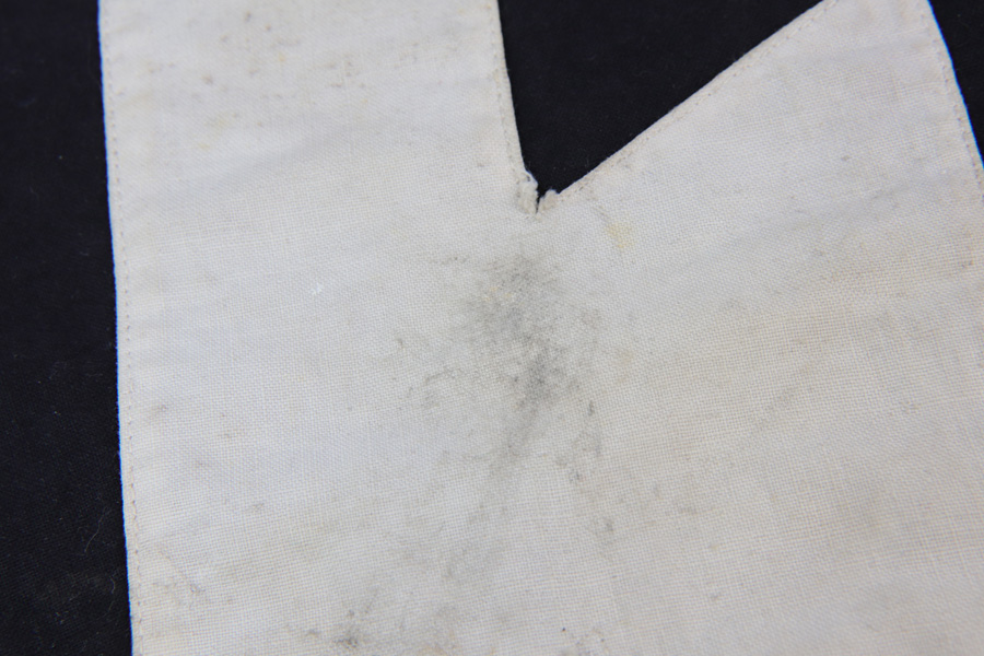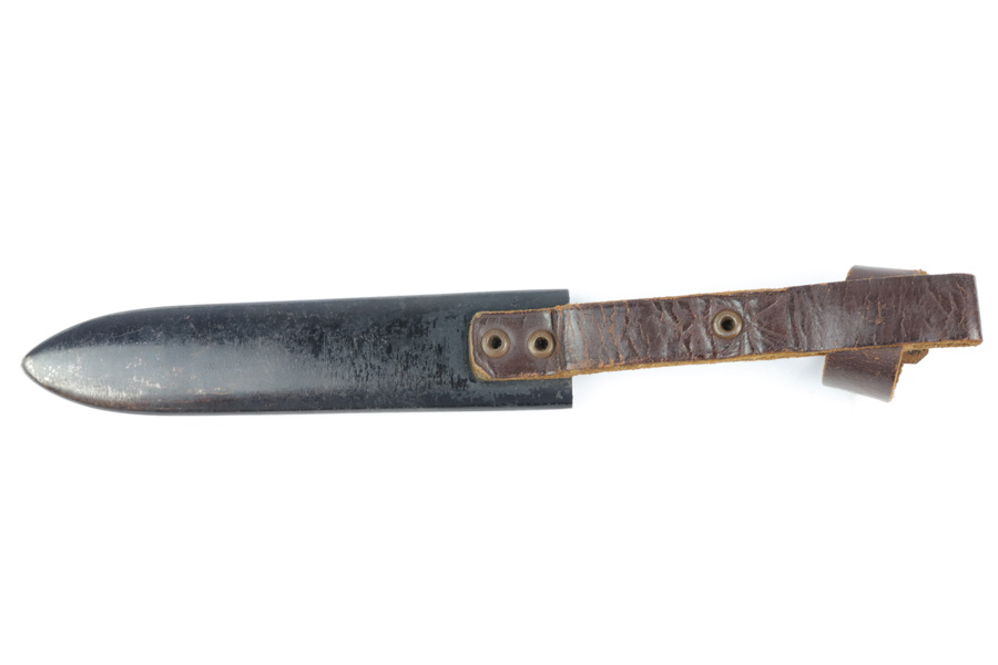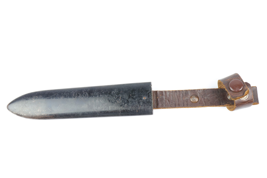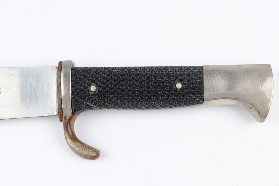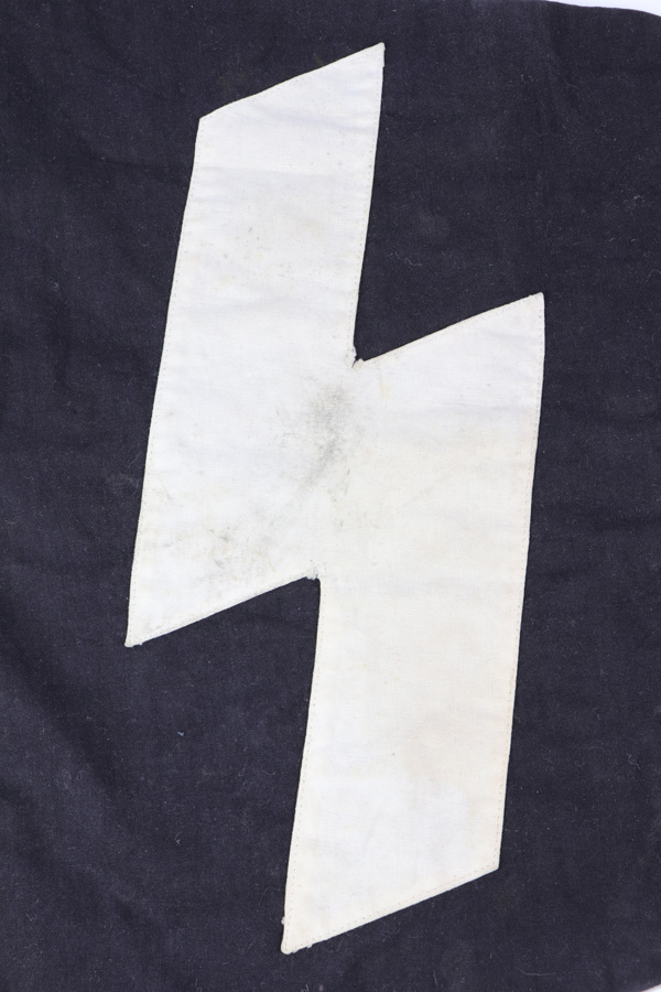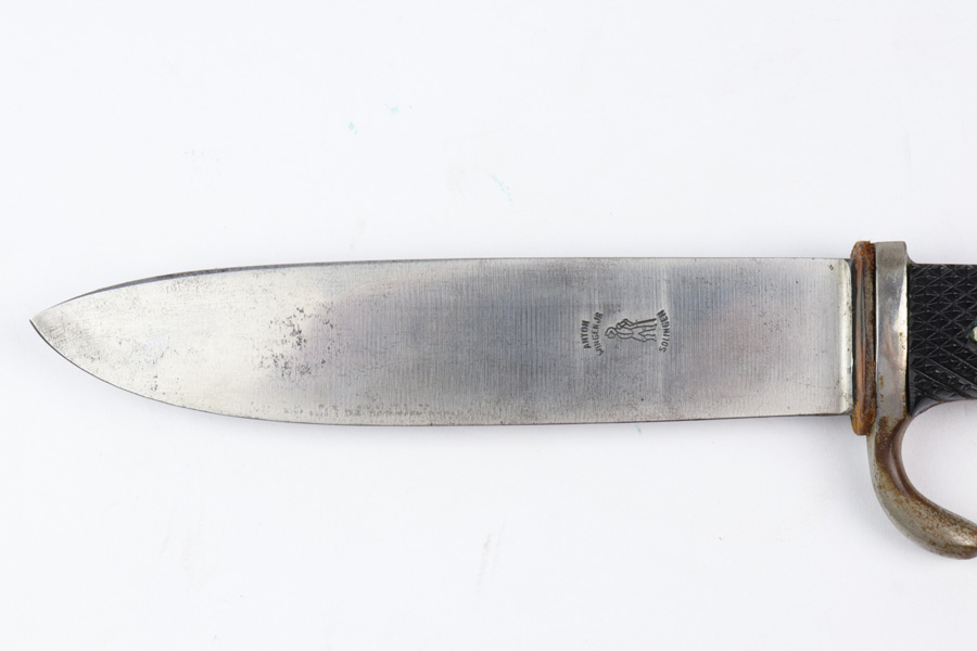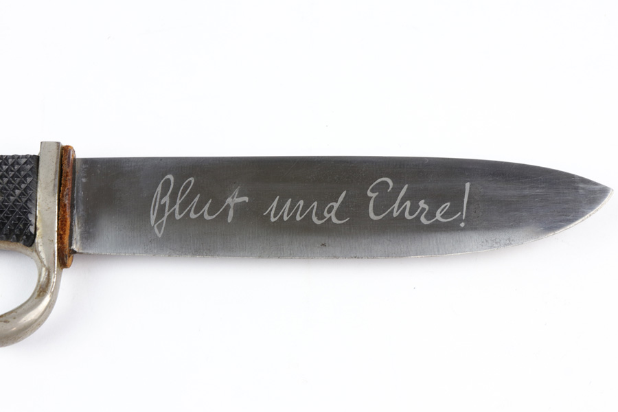 10/30/18 – This is an original Hitler Youth / DJ grouping of a beautiful youth knife with a Deutsche Yungvolk unit pennant flag. The youth knife comes with the original scabbard and leather frog in tact. The scabbard has some minor paint loss but no major wear nor any dents. The blade is excellent and clean with no signs of sharpening. There’s some very light oxidation a minor discoloration in a few spots, but overall very clean. Both maker stamped and “Blut und Ehre” etched. The handle has some wear on the emblem, with the red areas being cracked and chipped. The pennant flag is 28.5 inches long and one side (the side with the unit griffen animal) has some spotty discoloration. The reverse side has a single rune and is excellent. No fraying or significant issues. Guaranteed all original and authentic.