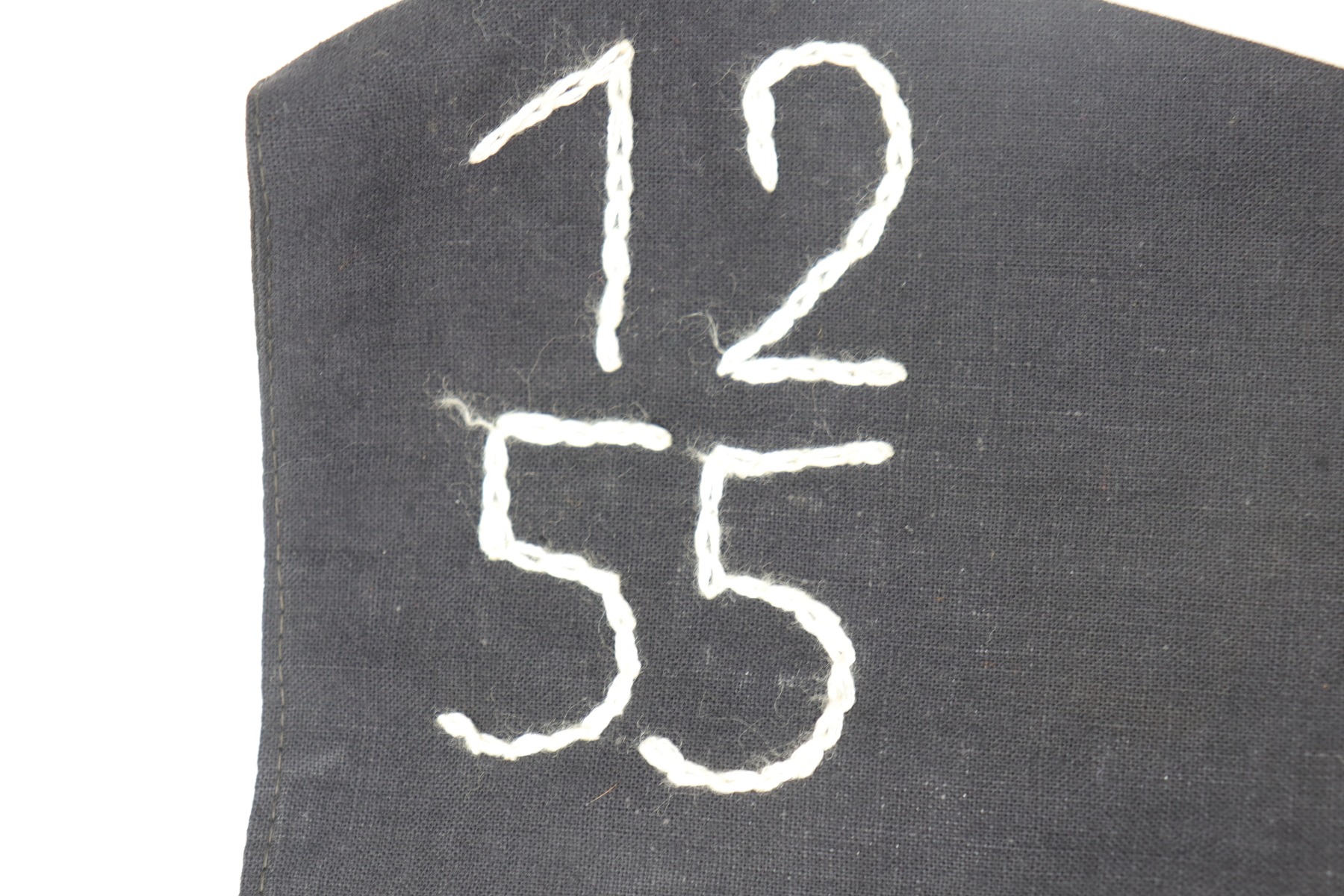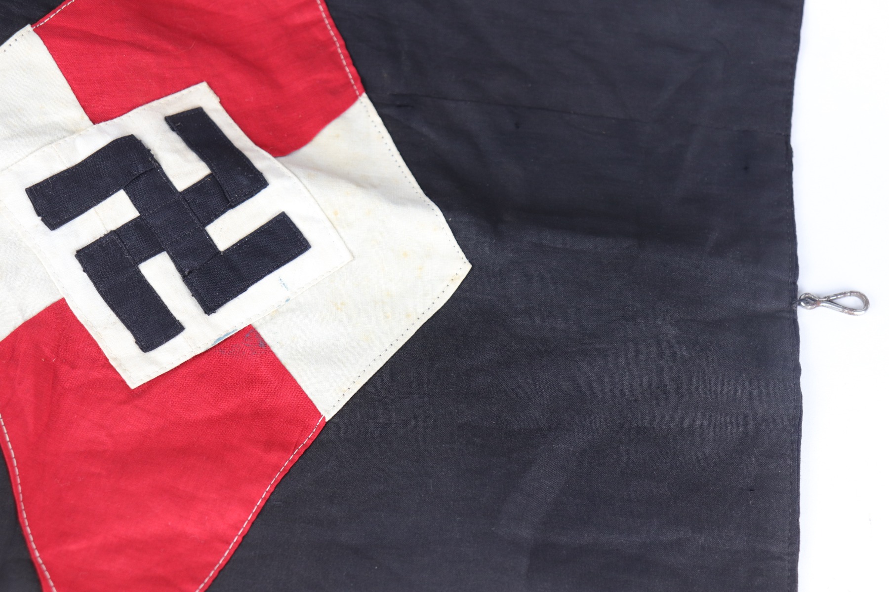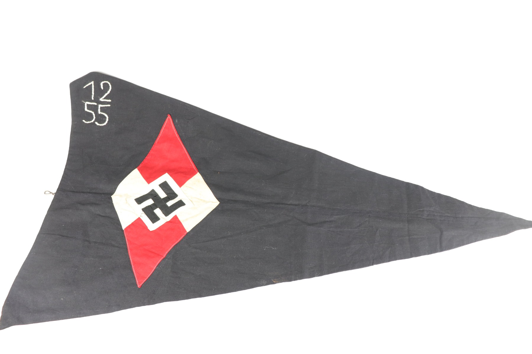 8/26/20 – This is a hard to come by Hitler Youth unit pennant. This pennant is double-sided and uses multi-piece construction with black, red and white cotton fabric. In the upper corner of the pennant (both sides) is the group number, “12” over “55”, embroidered in white woven stitching. The Hitler Youth emblem (Swastika inside the red and white diamond) is constructed using individual colored panels stitched together to create the red and white pattern. At the center of the emblem is a separate white square panel stitched to the red and white background. Within the white square center panel is stitched the black swastika, using the traditional overlapping 45 degree fabric pattern at the elbows. There was a lot of care and skill that went into creating just the emblem itself! Overall the pennant is in great condition. There is a bit of staining and a few scattered- very small- holes through the pennant due to age and use. The dimensions of the Hitler Youth pennant are 41 inches in length by 22 inches tall.