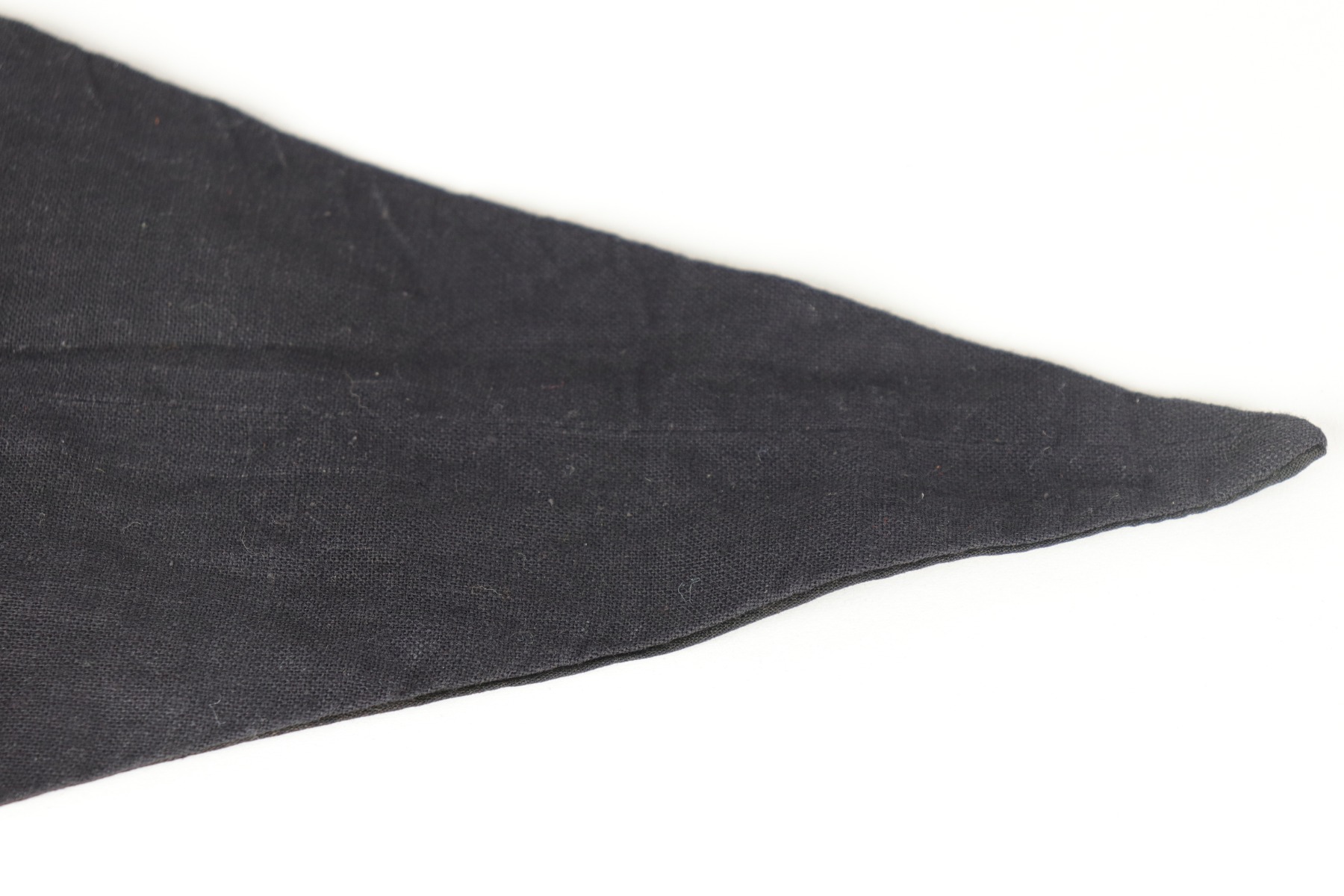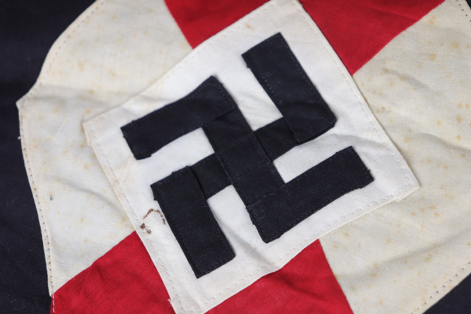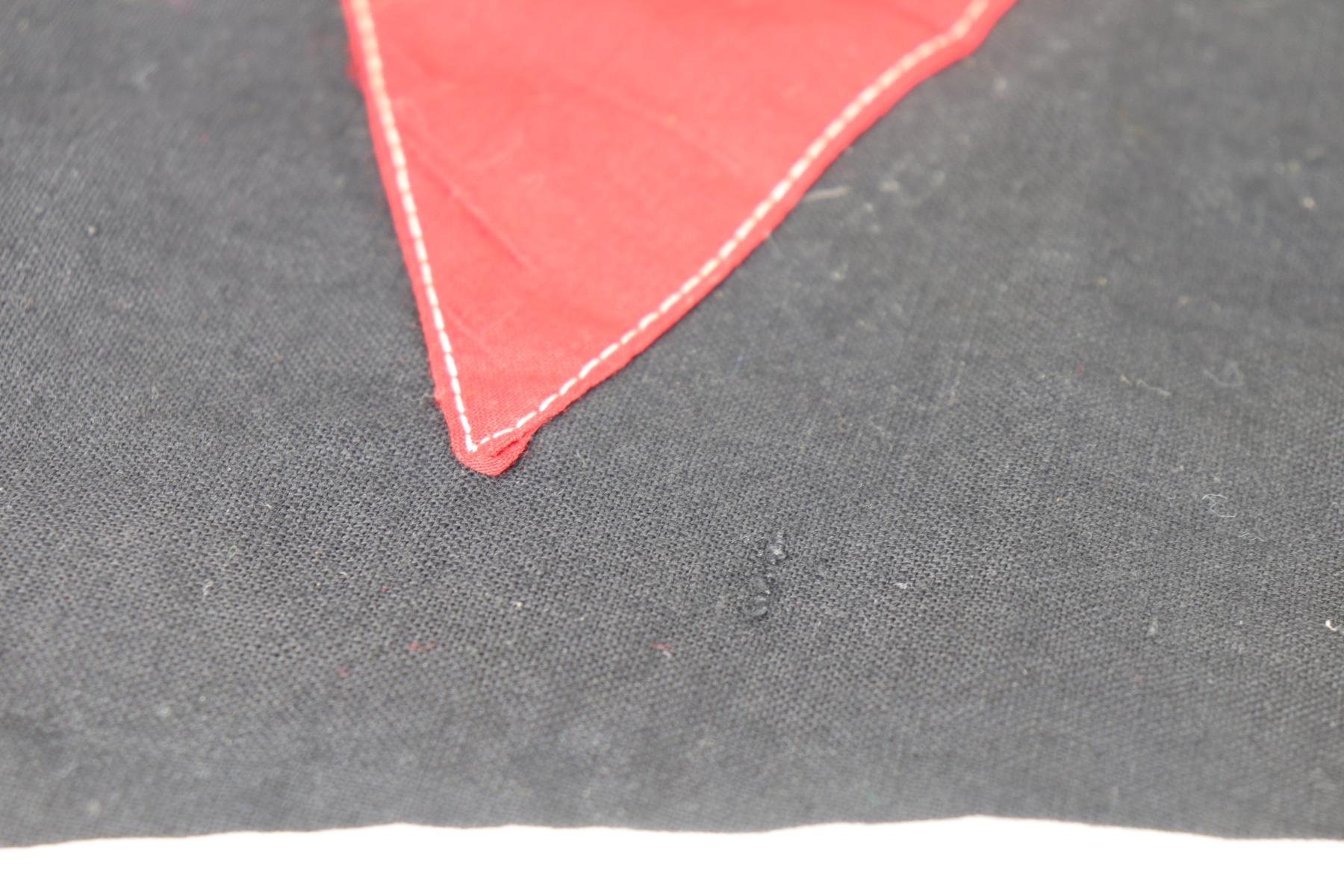 8/26/20 – This is a hard to come by Hitler Youth unit pennant. This pennant is double-sided and uses multi-piece construction with black, red and white cotton fabric. In the upper corner of the pennant (both sides) is the group number, “12” over “55”, embroidered in white woven stitching. The Hitler Youth emblem (Swastika inside the red and white diamond) is constructed using individual colored panels stitched together to create the red and white pattern. At the center of the emblem is a separate white square panel stitched to the red and white background. Within the white square center panel is stitched the black swastika, using the traditional overlapping 45 degree fabric pattern at the elbows. There was a lot of care and skill that went into creating just the emblem itself! Overall the pennant is in great condition. There is a bit of staining and a few scattered- very small- holes through the pennant due to age and use. The dimensions of the Hitler Youth pennant are 41 inches in length by 22 inches tall.