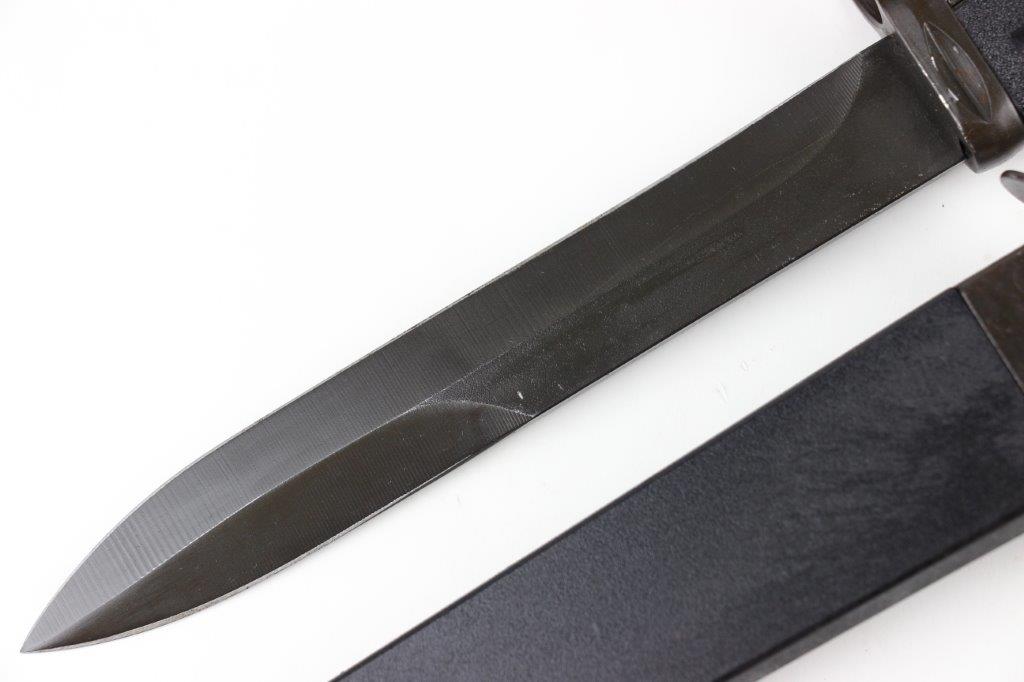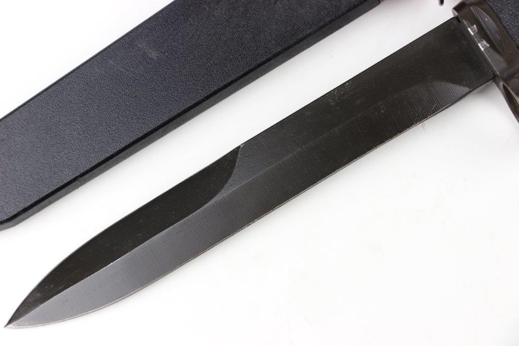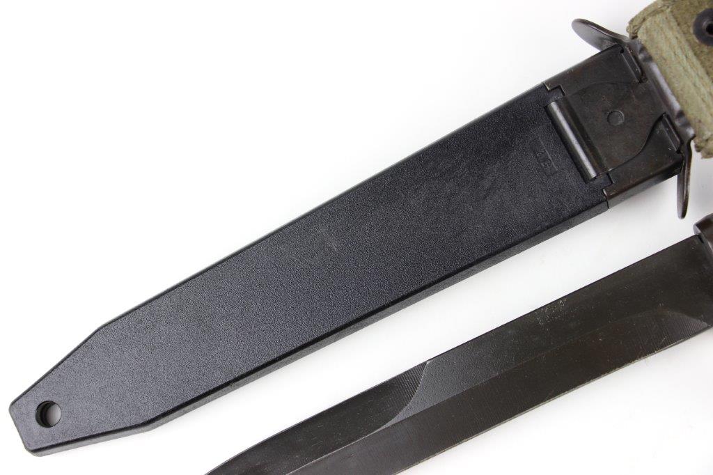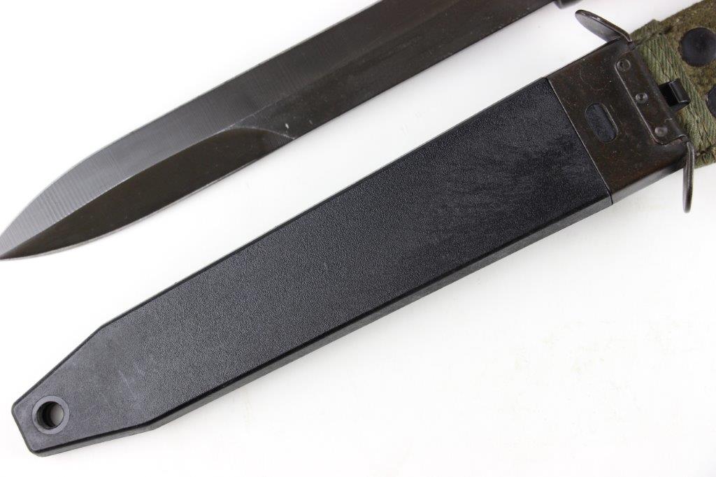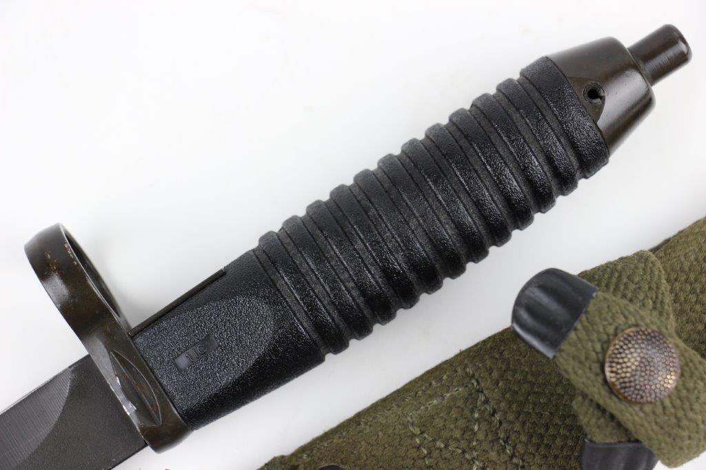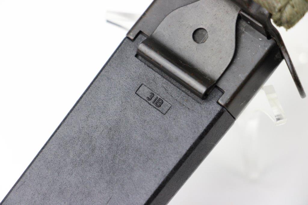 7/3/24 – This is a 1960’s production German H&K G3 Rifle Bayonet. The bayonet features a 12 groove black plastic grip in excellent condition, stamped “1 IC” on one side. The pommel has a press catch at the 9 o’clock position and is fully functional. Minimal high edge wear on the barrel ring and hand guard area. The blade has a clean finish throughout with visible cross graining and a uniformly sharpened edge. There’s mild surface scratches near the tip and base of the blade edge. Comes with a minty, triangular tipped scabbard.