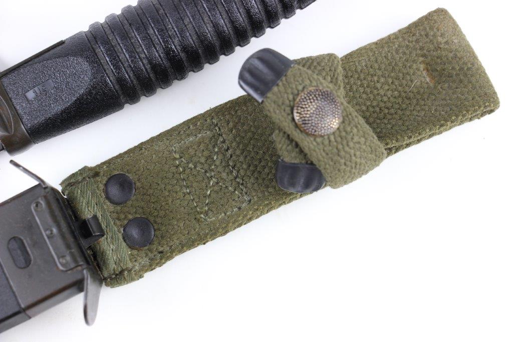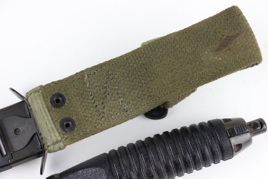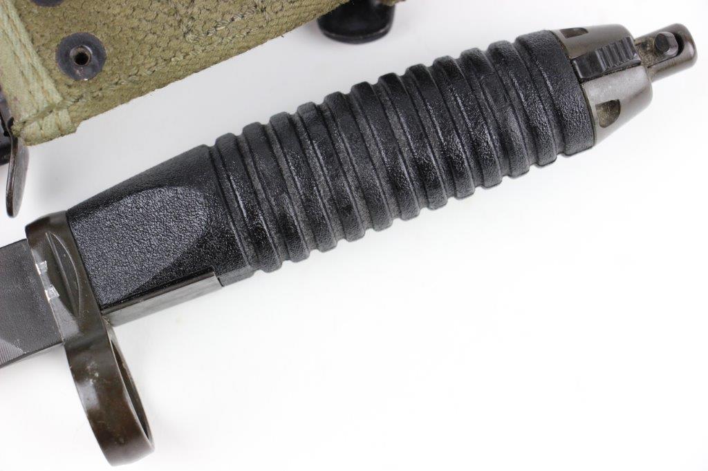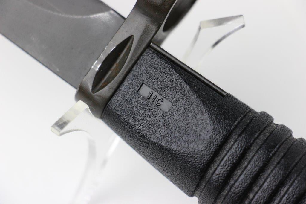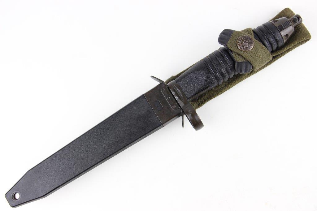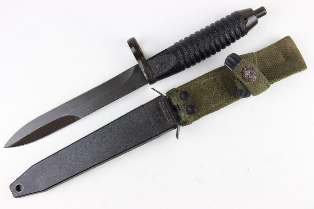 7/3/24 – This is a 1960’s production German H&K G3 Rifle Bayonet. The bayonet features a 12 groove black plastic grip in excellent condition, stamped “1 IC” on one side. The pommel has a press catch at the 9 o’clock position and is fully functional. Minimal high edge wear on the barrel ring and hand guard area. The blade has a clean finish throughout with visible cross graining and a uniformly sharpened edge. There’s mild surface scratches near the tip and base of the blade edge. Comes with a minty, triangular tipped scabbard.