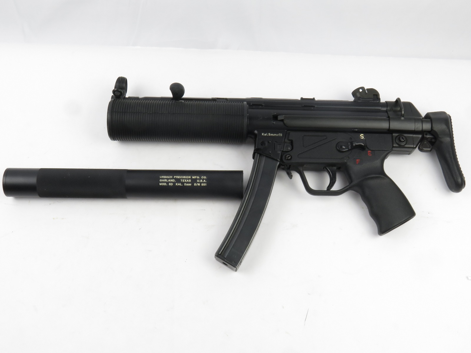 9/15/17 – This is an original W. Germany production H&K MP5 SD machine gun. The firearm is a pre-sample and can only be transferred dealer-to-dealer. The bore is in great condition, but there is some residue and signs of use, especially within the suppressor. The gun is all original and mechanically sound, with a suppressor made by Urbach Precision Mfg. Co. Comes with two 30 rounds 9mm magazines. Please see photos, and feel free to ask any questions!