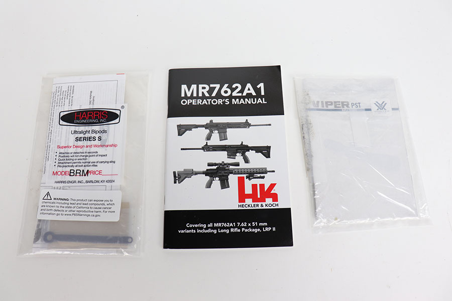 12/4/20 – This is a new unfired HK MR 762A1 rifle with the LRP III add-on package. This includes a Vortex Viper PST II 3-15×44 FFP MRAD scope, LaRue Tactical Harris S Bipod, Blue Force Gear standard issue Vickers sling, three 20 round magazines, and one 10 round magazine, all made in Germany. Also included is a 42inch model 1720 Pelican Case with the HK logo. The rifle features HK’s short stroke gas piston system which increases reliability and prevents combustion gases from entering the weapon’s interior. This markedly reduces heat and fouling of the bolt carrier group. The rifle also features a cold hammer-forged free floating heavy barrel for extreme accuracy. Comes with original owner’s manuals for the scope and rifle.
