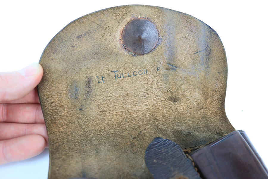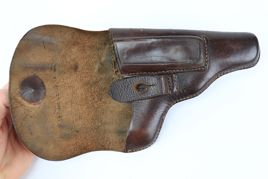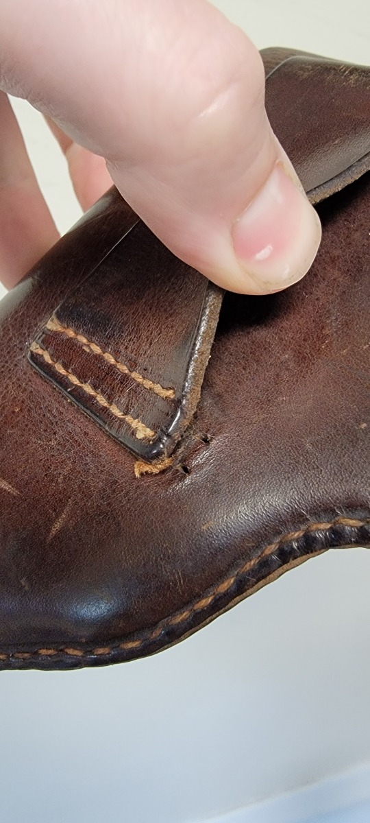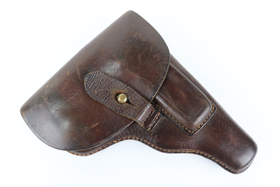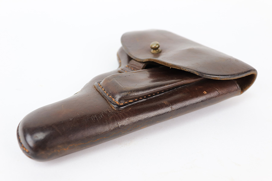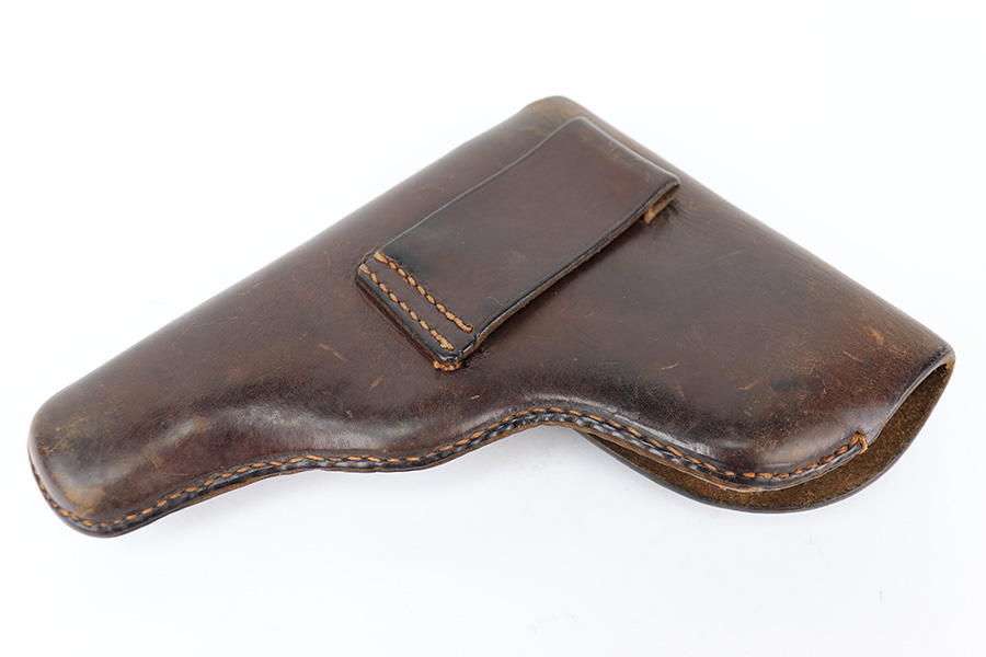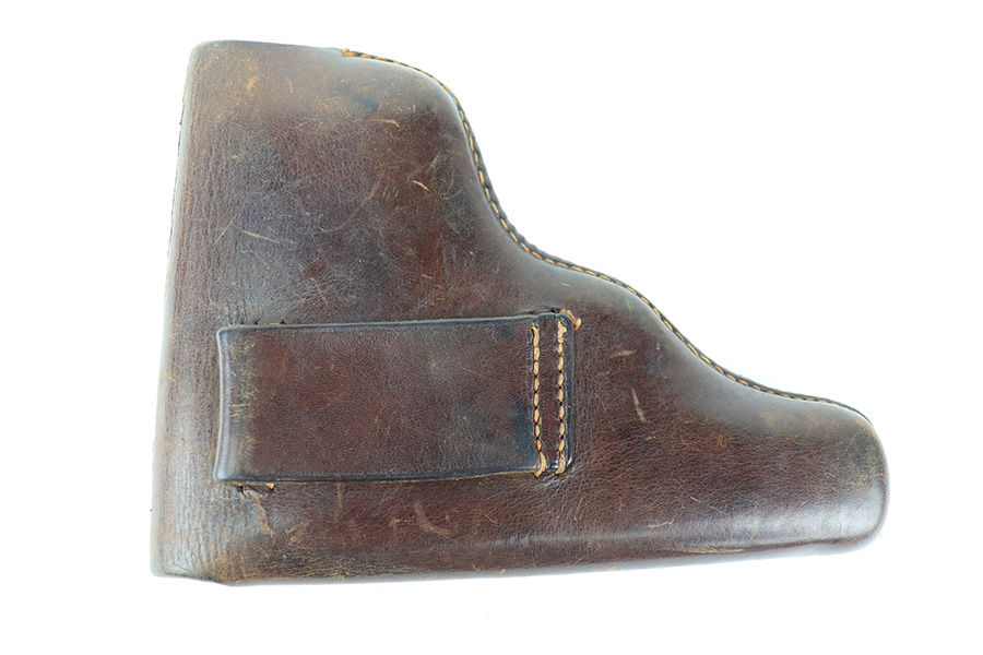 6/13/22 – This is an unmarked “Hoffmann” style holster for a 7.65mm Axis pistol, such as the Walther PP or Mauser model 1934. The holster has an early brass closure knob and no markings or stamps throughout the leather. Nice stitching is in great shape except for 2-4 loose stitches on the belt loop. See photos. There is some light surface wrinkling and wear around the top bend in leather and the closure strap. Fairly clean interior leather.