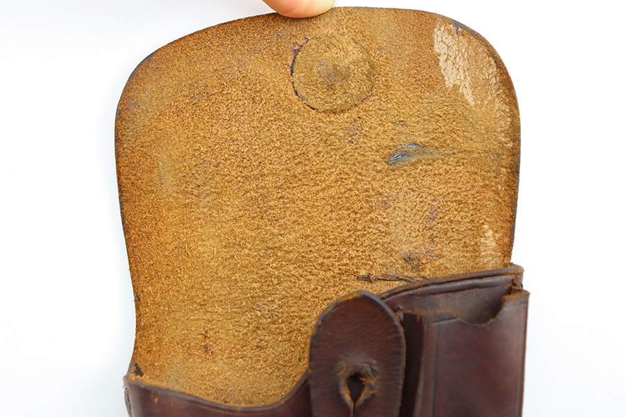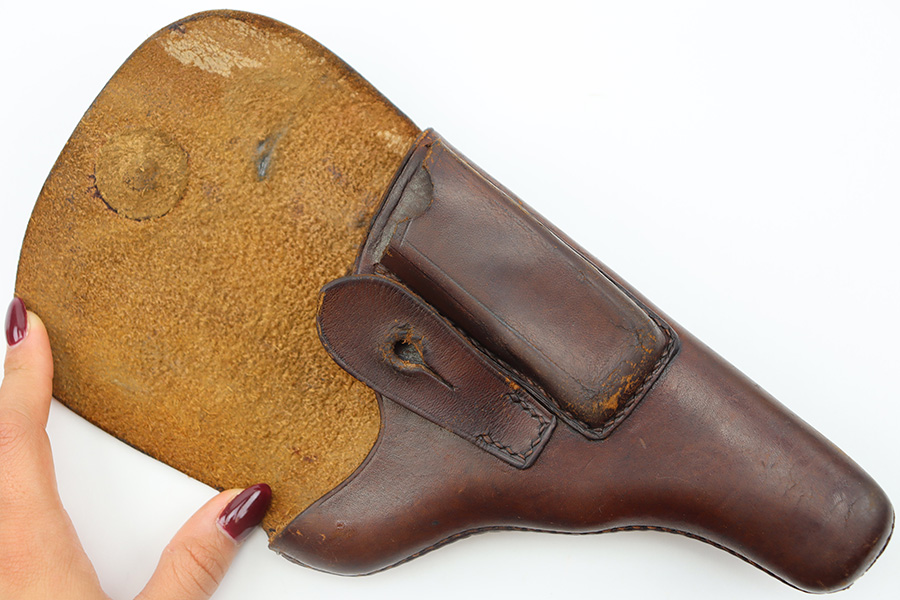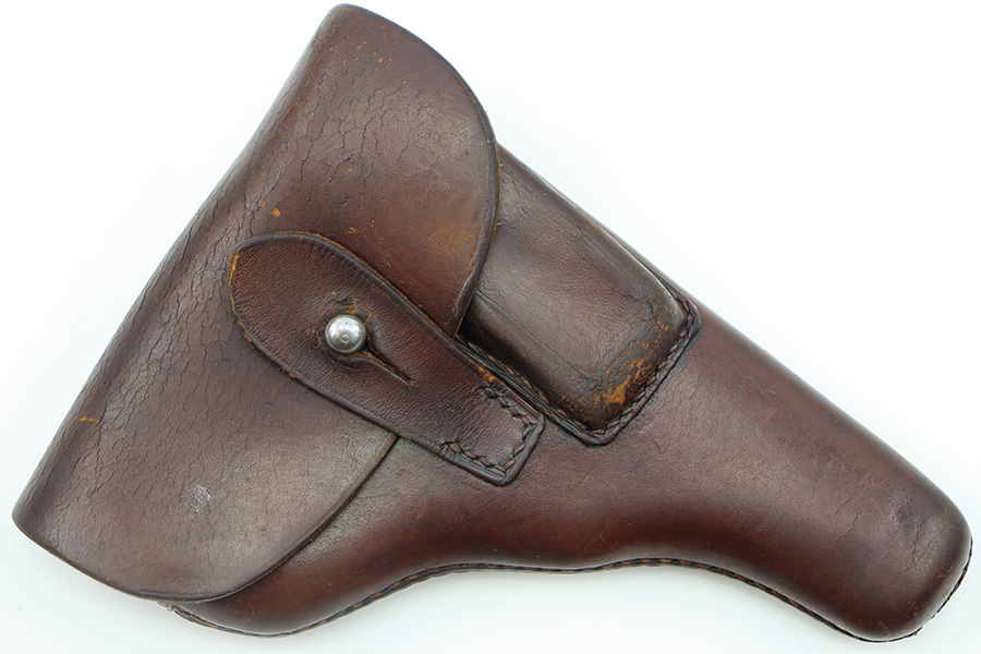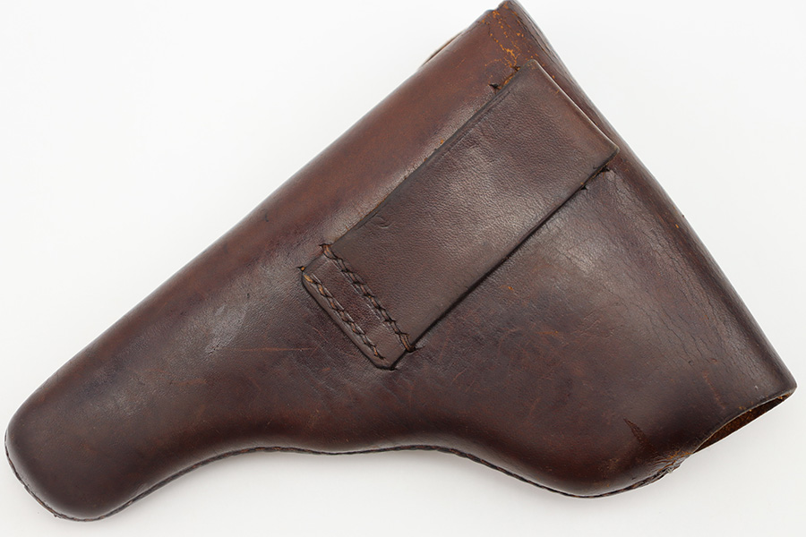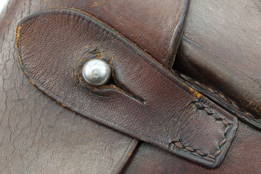 11/20/23 – This is an original 7.65mm Axis pistol holster for a Walther PP, Sauer 38h, Mauser HSC, or similar sized pistol. The holster has no markings or stamps, and is a “Hoffmann” style due to the type of construction and closure strap. The leather is soft and pliable with normal signs of aging. Some cracking on the top leather around the rounded portion of the lid. Fairly clean interior leather. All original stitching is in excellent condition.