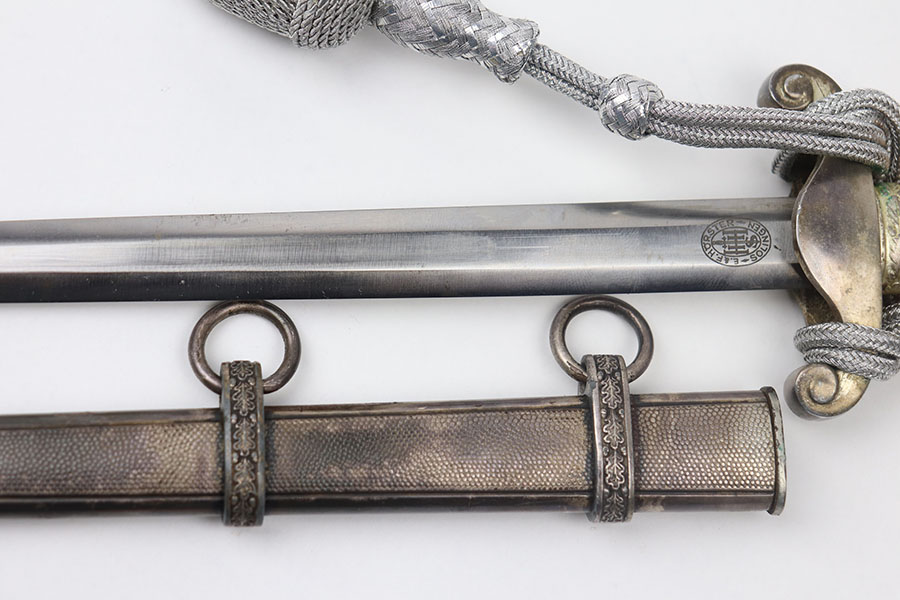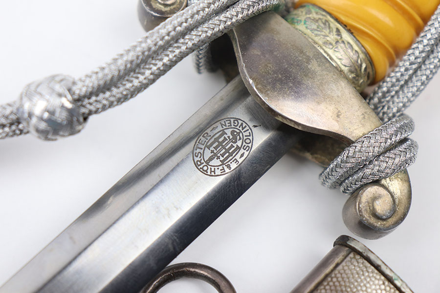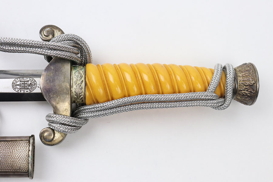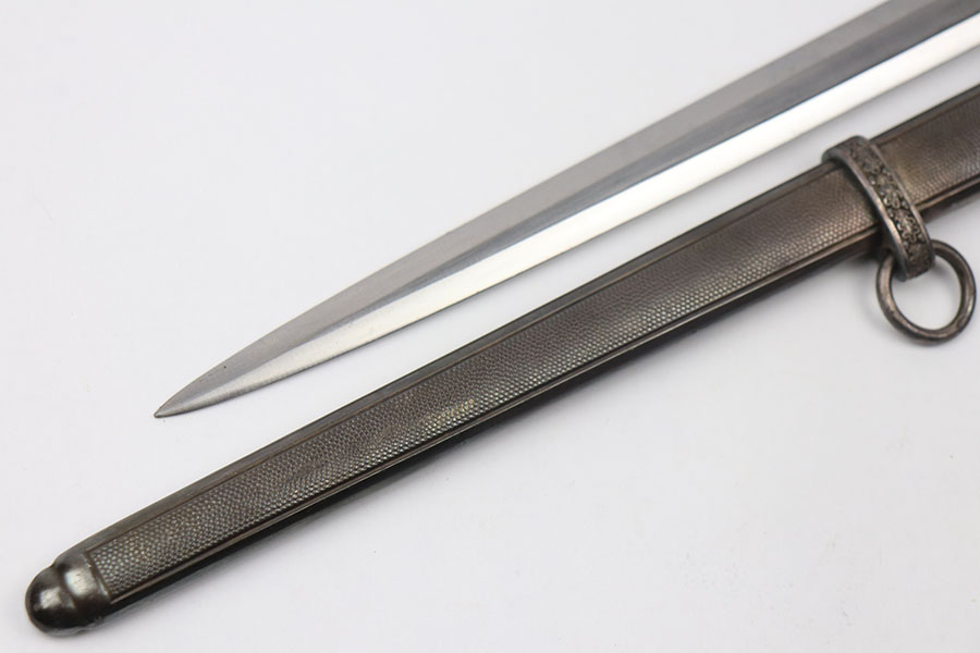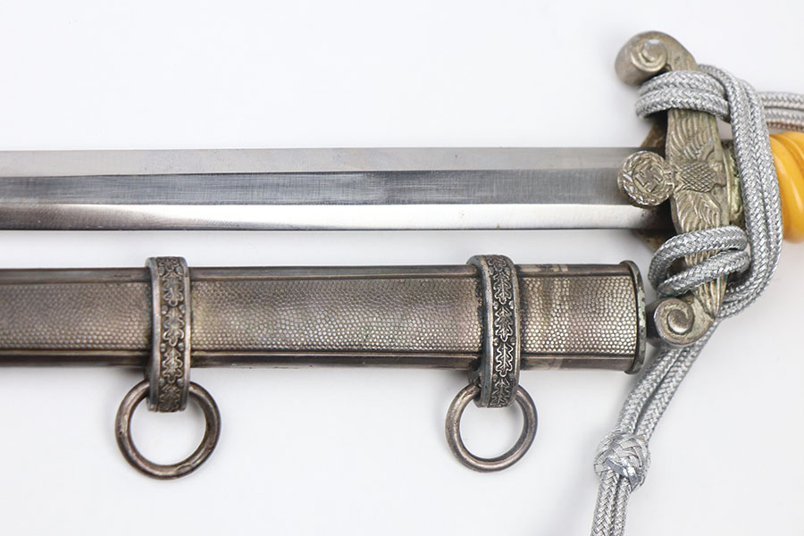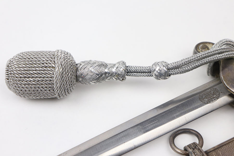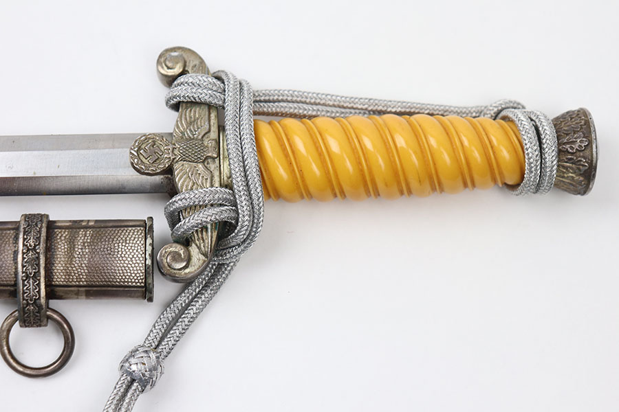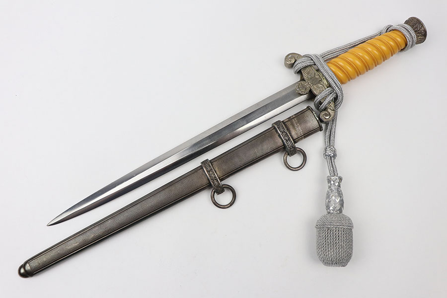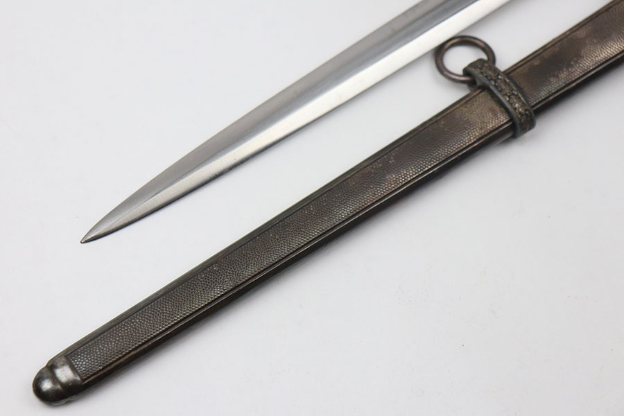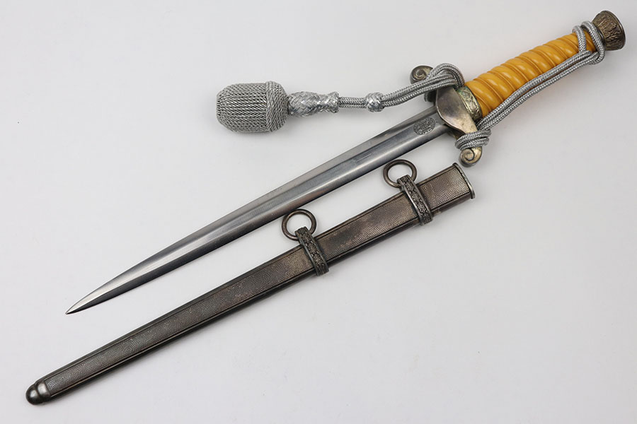 6/8/21 – This is an original WW2 nazi Army Dagger with an original portepee and scabbard. The blade is maker marked by Horster and is in great overall condition. Very clean with good cross graining and no signs of sharpening. No cracks or chips in the bakelite handle. The portepee is excellent with no fraying. No dents or issues on the scabbard as well.