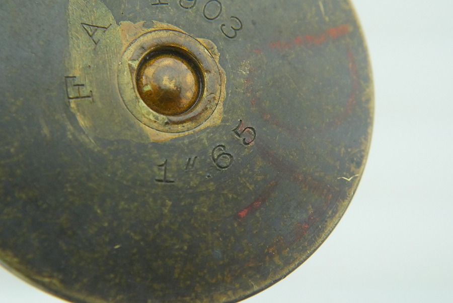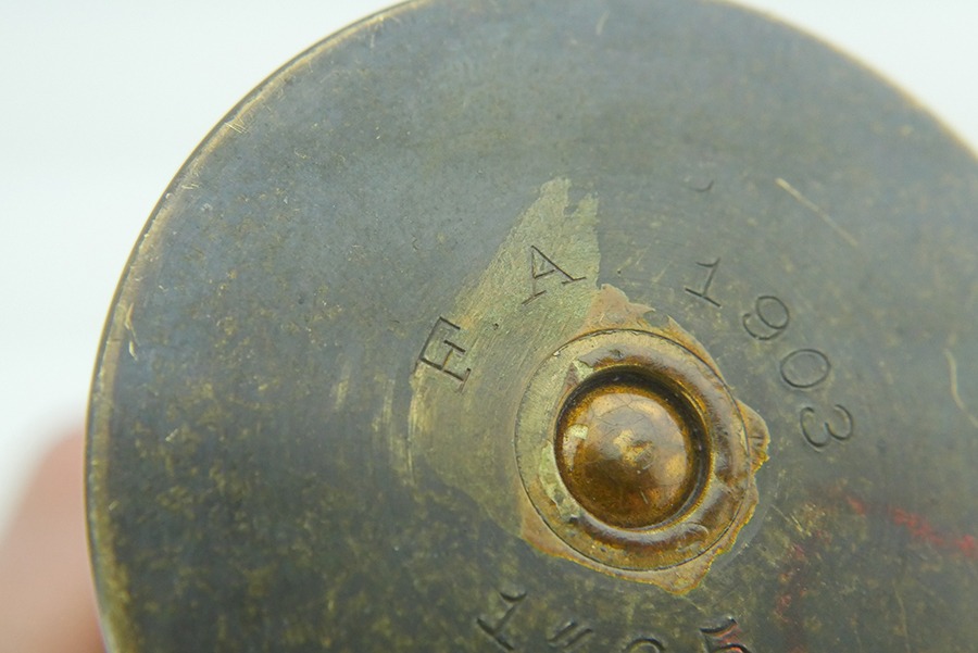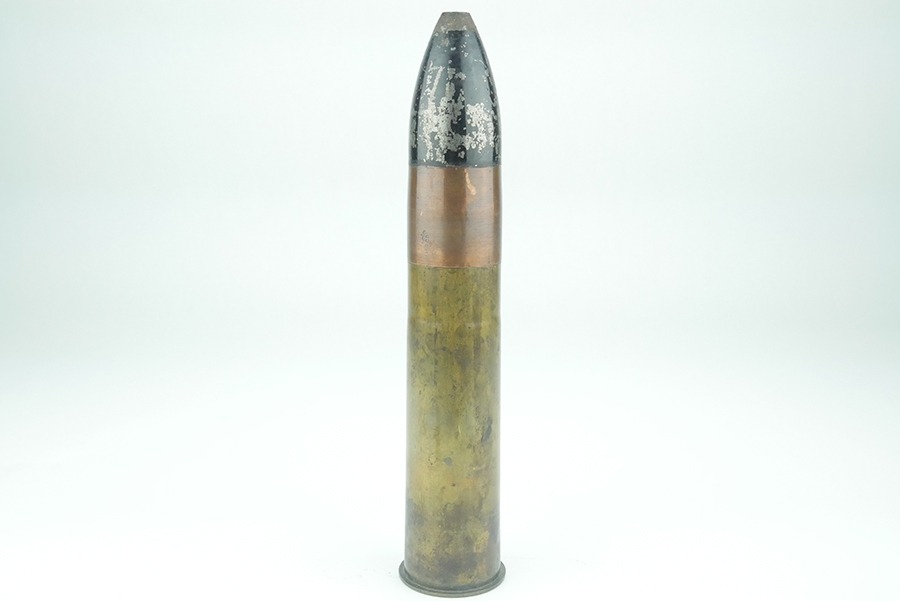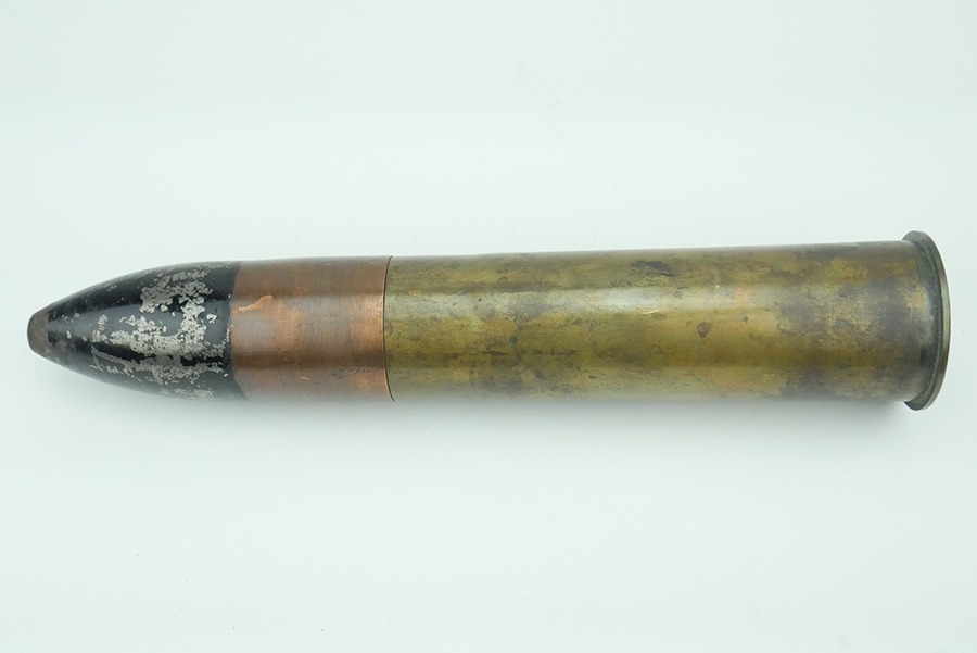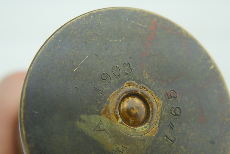 9/4/24 – This is a good example of an inert 1.65 Inch Hotchkiss High Explosive (HE) round. These rounds were used most often in the M1875 Mountain Gun. These guns were famous for their use during the Spanish-American War in Cuba, and for their use by the U.S. Cavalry at Wounded Knee. The brass shell on this round is in great shape with no major dents. The HE Shell still has an empty fuse housing inside, and can be removed from the brass, although the fitment is tight. The brass is case stamped ” F.A. 1903 1″65 “.