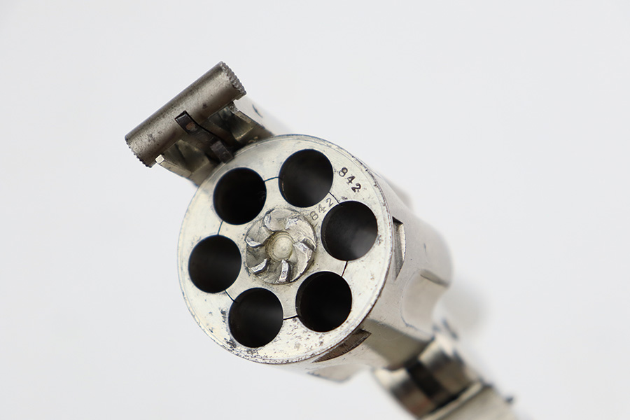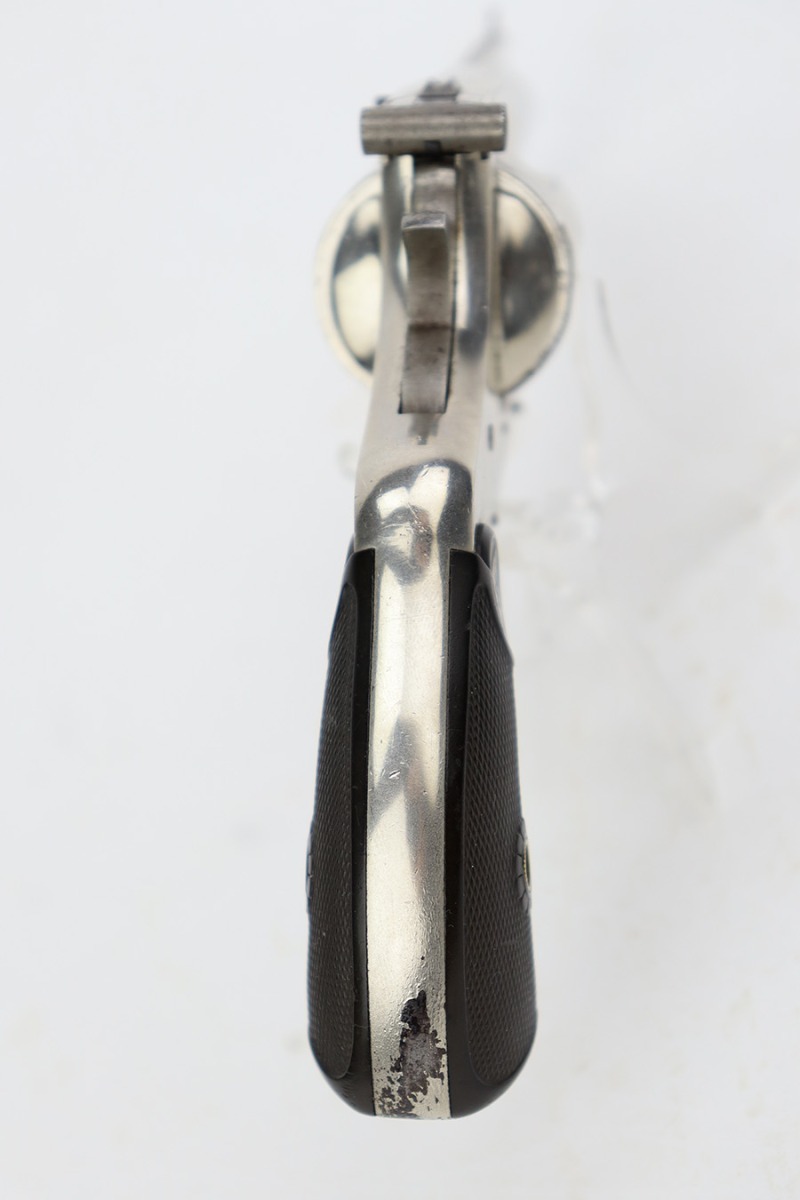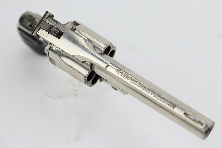 Specifically, there is an external ejector button on the underside of the barrel-frame hinge that can be used to manually return the ejector. This is only found on the First and Second Variations of the Second Model Automatic Ejecting Revolver. The barrel markings also confirm that it is a Second Model, First Variation revolver.