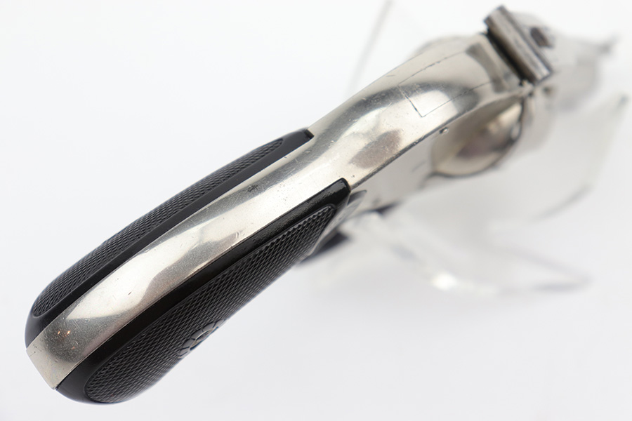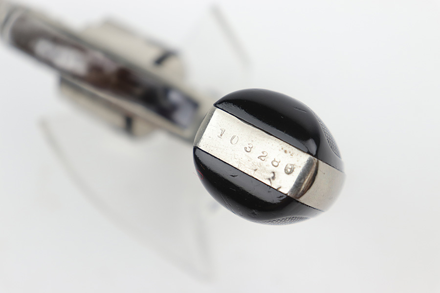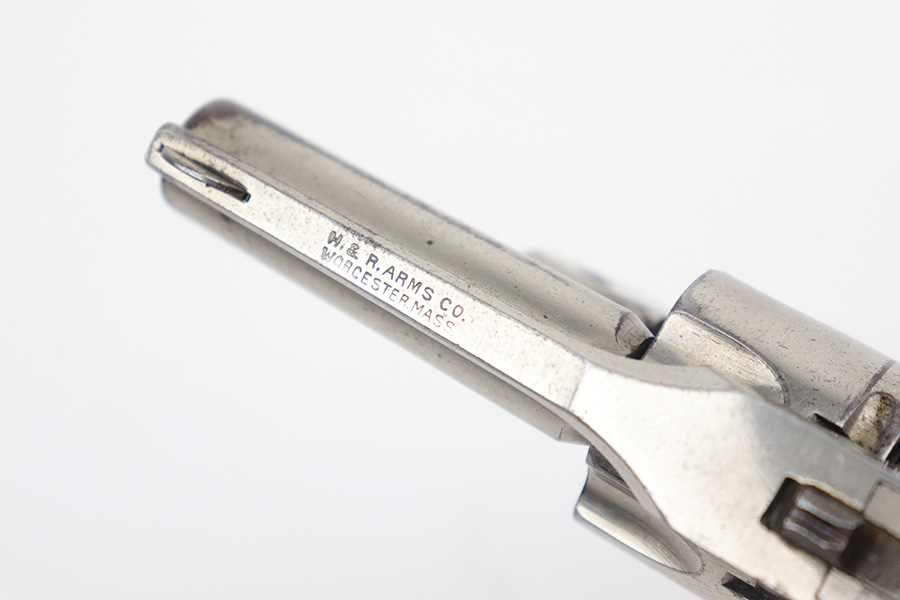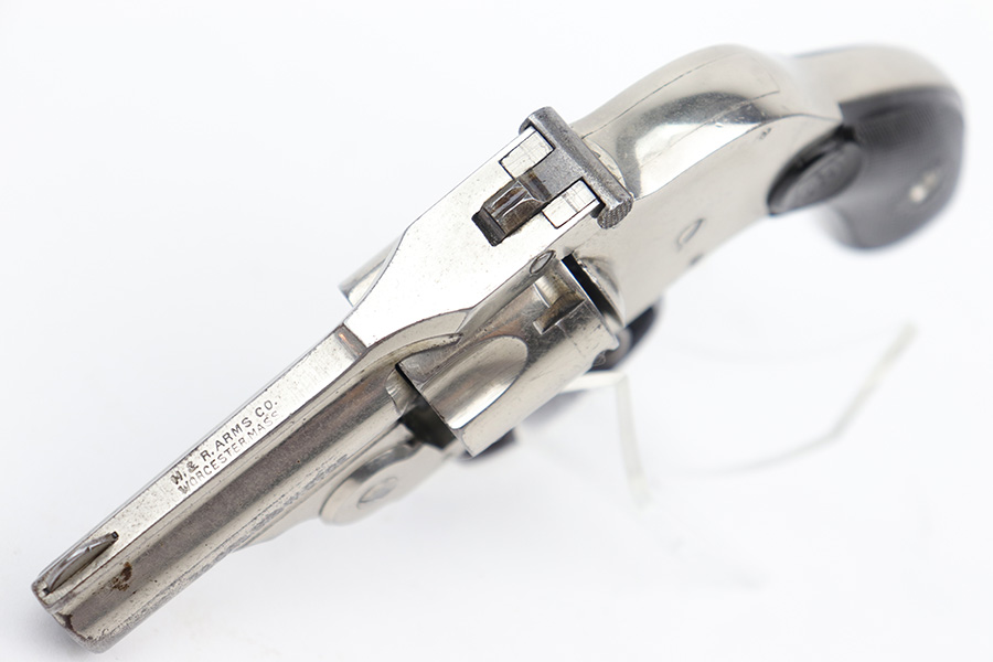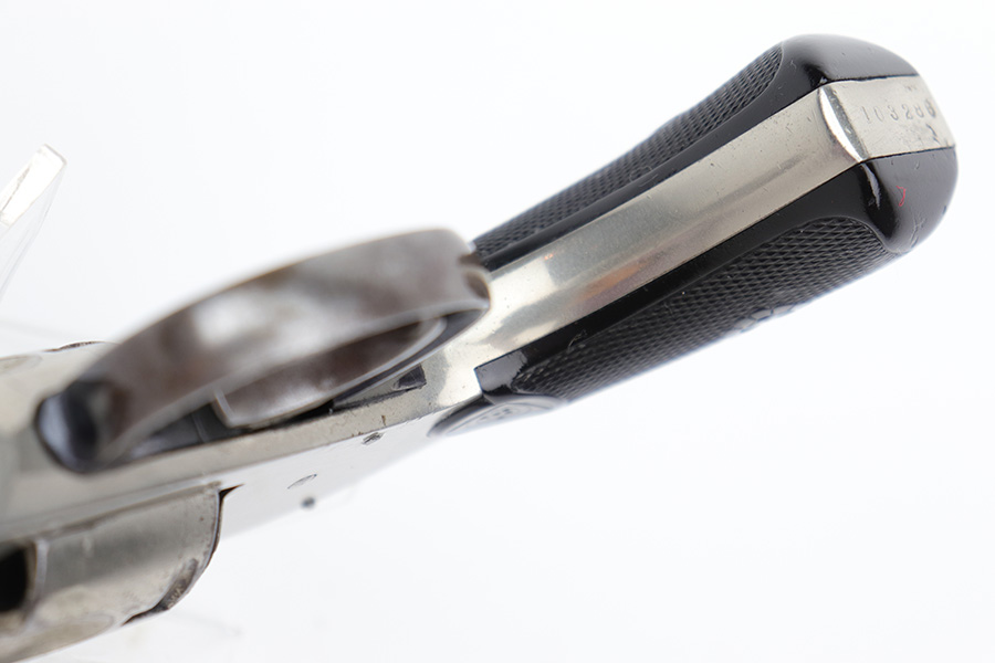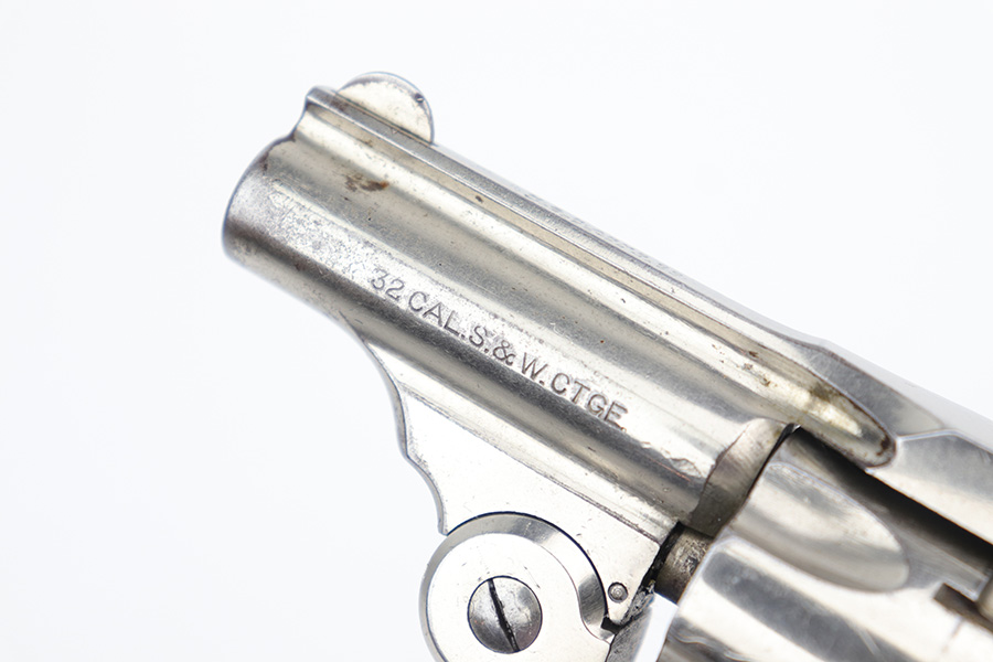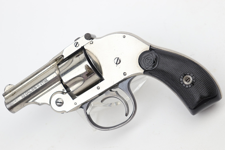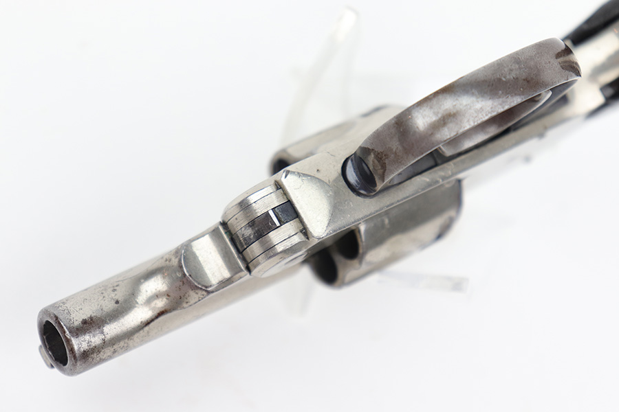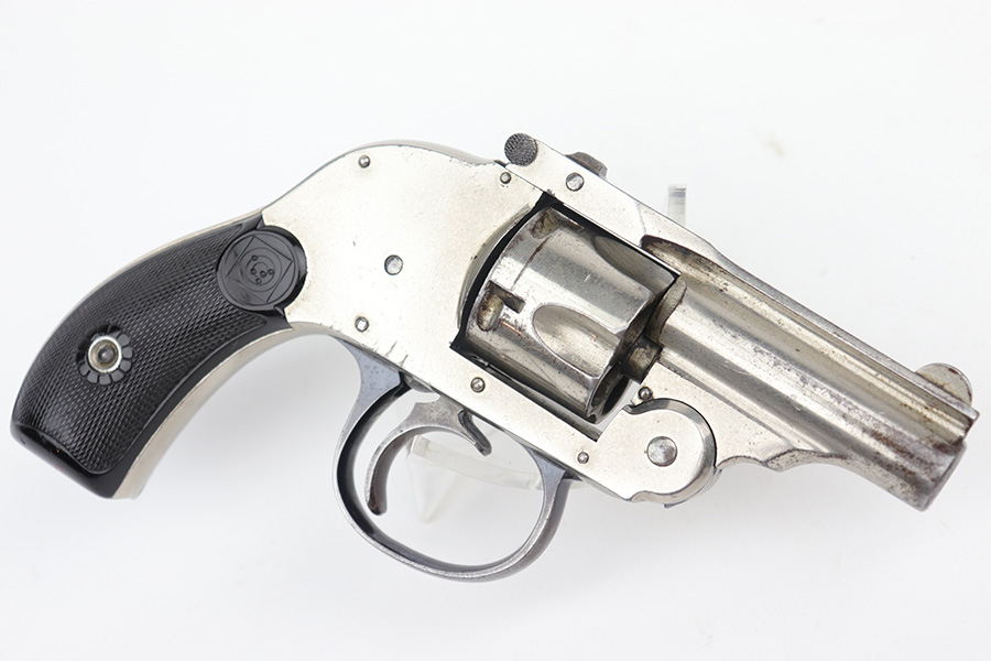 12/19/22 – This is a nice example of an H&R Second Model “Bicycle” Top-Break Revolver, manufactured between 1905-20 and chambered in .32 S&W. 2″ barrel. The gun is all matching and has retained somewhere between 85-90% of its original finish. Almost the whole gun is nickel-plated, but the trigger guard is blued. Most of the wear is around the muzzle and along the barrel, where there is some light flaking in the finish. Some flaking on the cylinder as well. Thinning in the bluing on the underside of the trigger guard. Some tiny dots of oxidation here and there. Fitted with a set of excellent period-correct black bakelite grips. The bore has decent rifling, but there is spotty oxidation throughout and some minor pitting here and there.