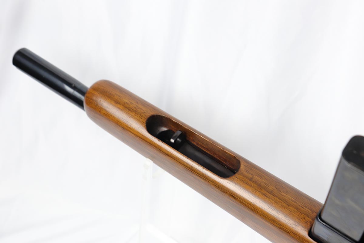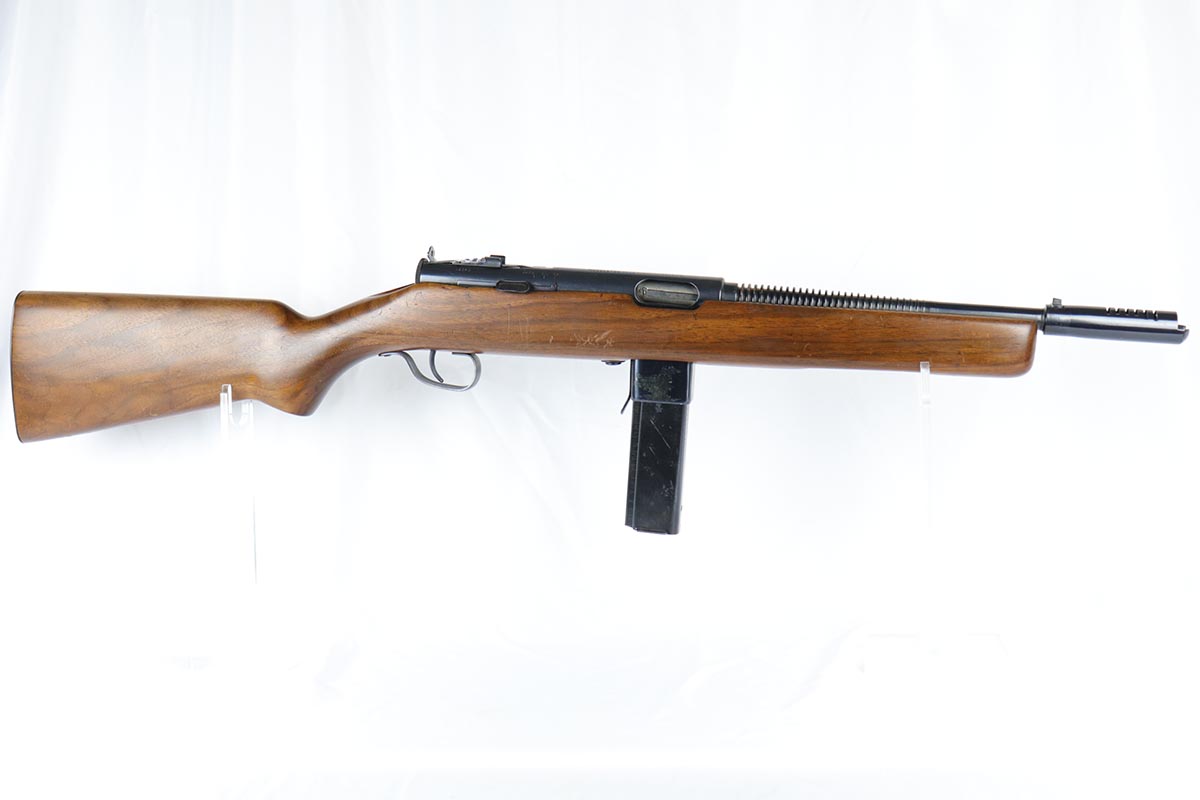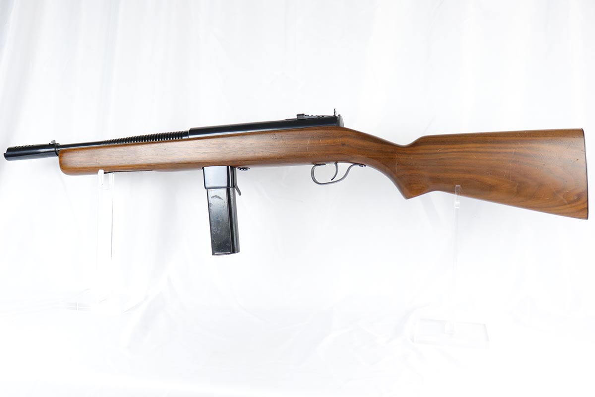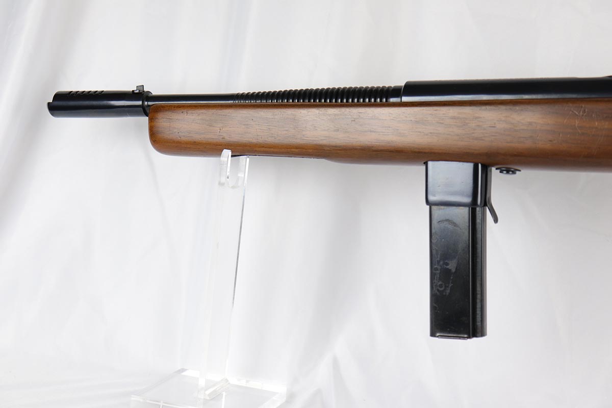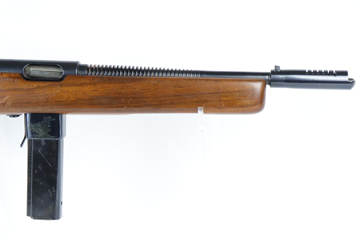 6/14/18 – This is a very attractive Reising M-50 with typical compensator and rear peep sight, and includes one original 25-rd mag and two reproduction 35-rd mags. The Reising M-50 was notably issued to Marines in the Pacific Theater during WWII as an alternative to the Thompson sub-machine gun which was in short supply. Although not well received by the Marines, these guns were also supplied to various police departments and utilized for decades after WWII. They have gained in popularity over the years with recreational shooting enthusiasts as a well made, relatively inexpensive entry level machine gun which utilizes readily available ammunition. This specimen with its excellent, high-glossy refinish and attractive wood likely was one of the police guns. Firing mechanism moves smoothly when operated by hand. This weapon is fully transferable on an ATF form 3 or form 4 as Curio & Relic eligible. Mechanics are fine. Bore is extremely fine, shiny and bright. No doubt this will bring many hours of enjoyment to a future owner.