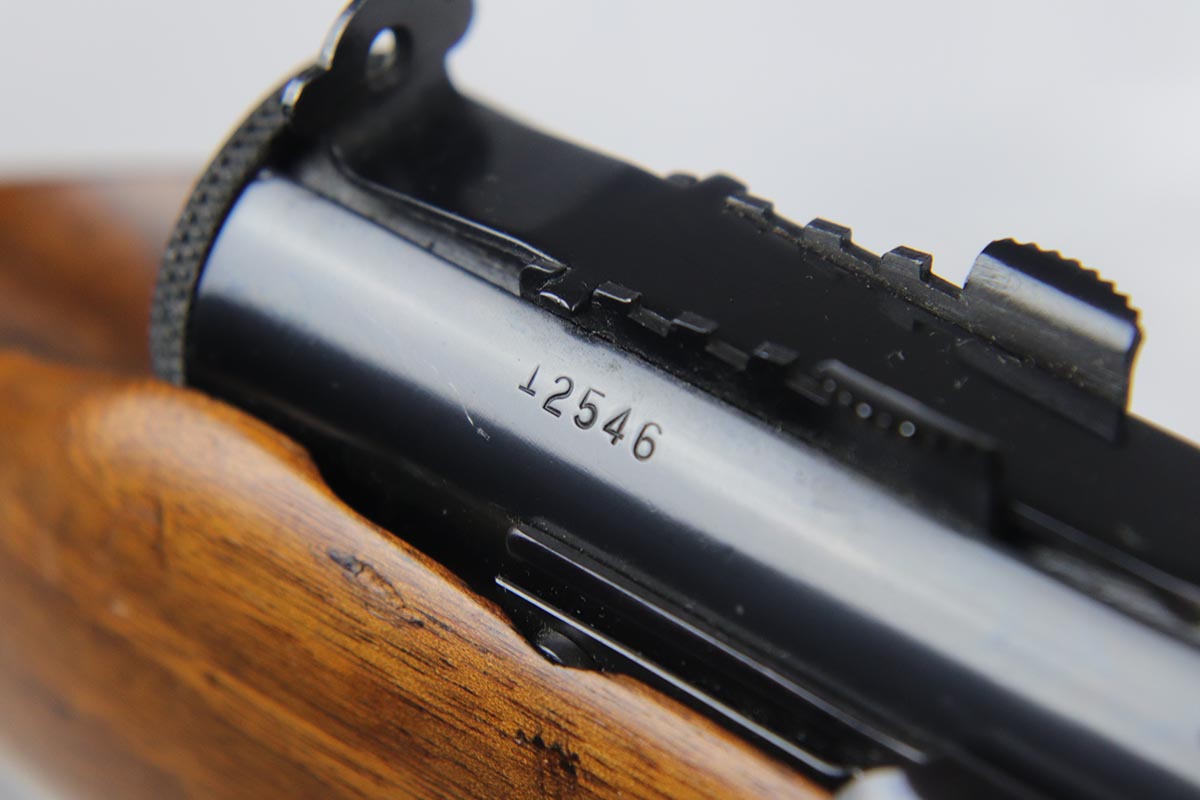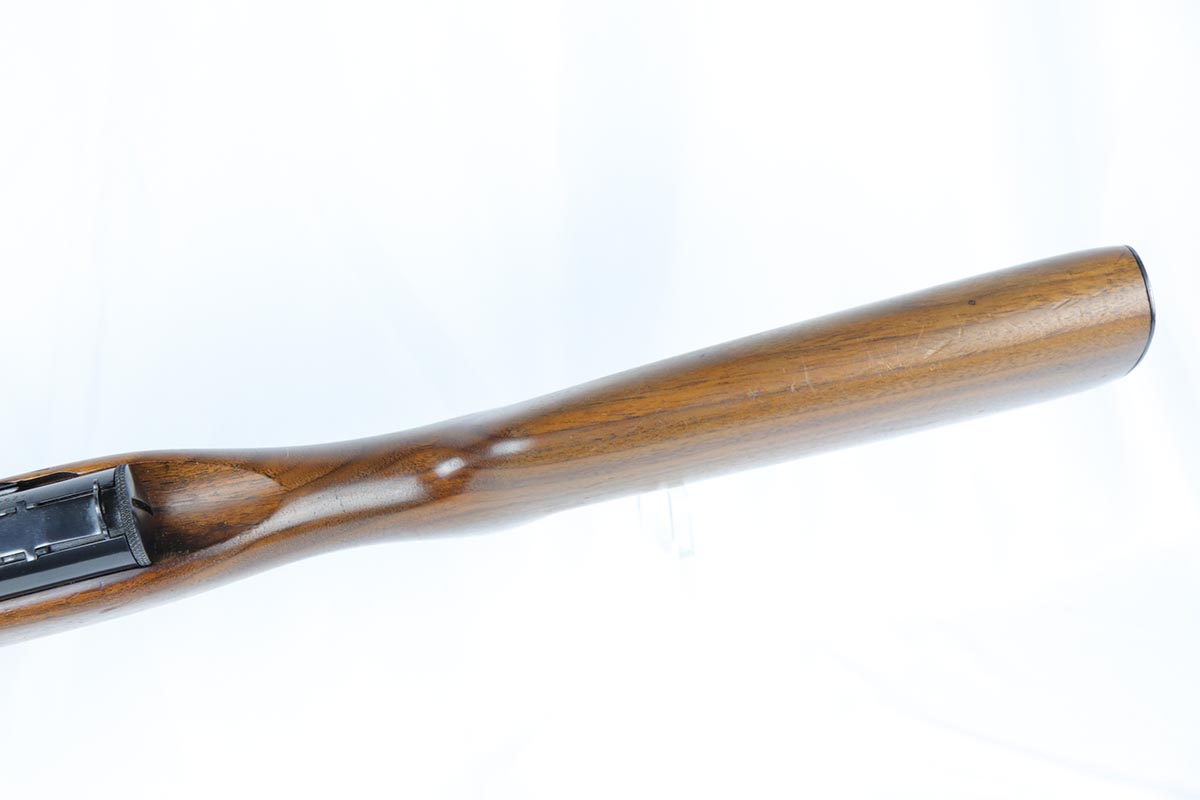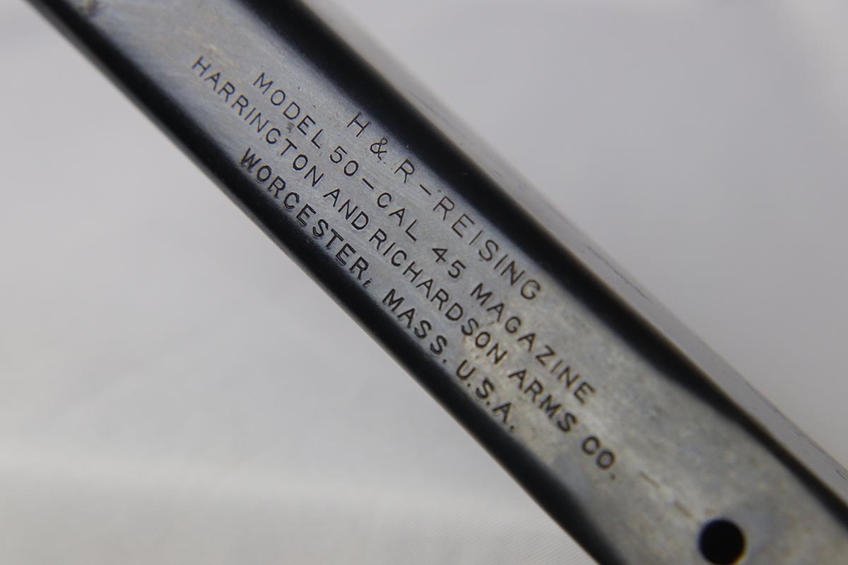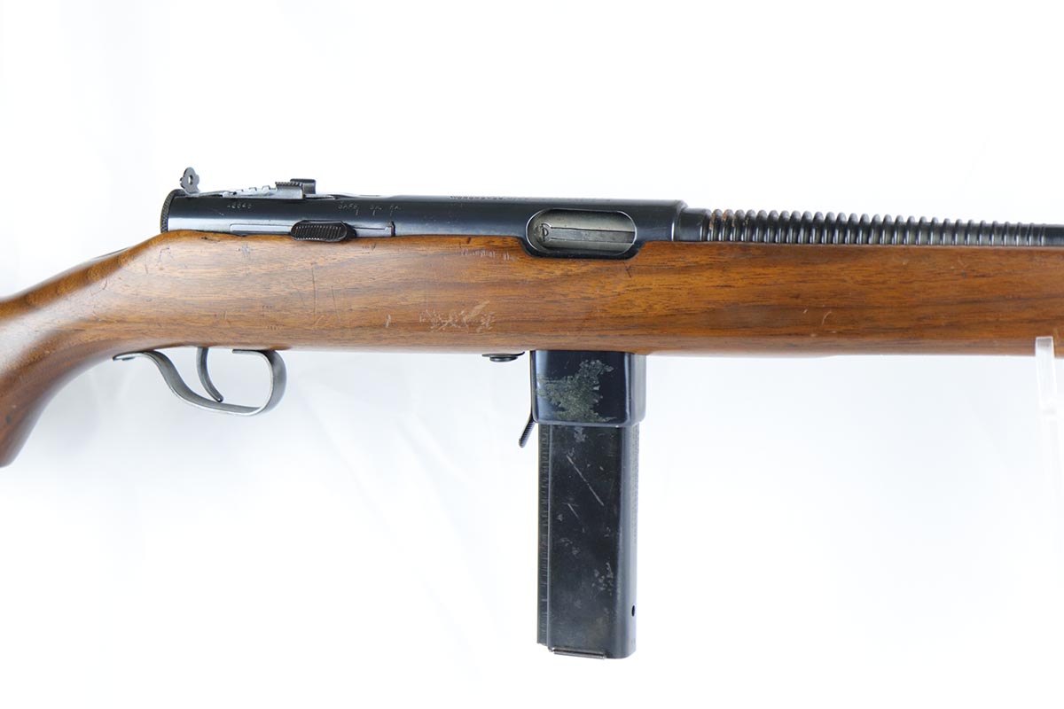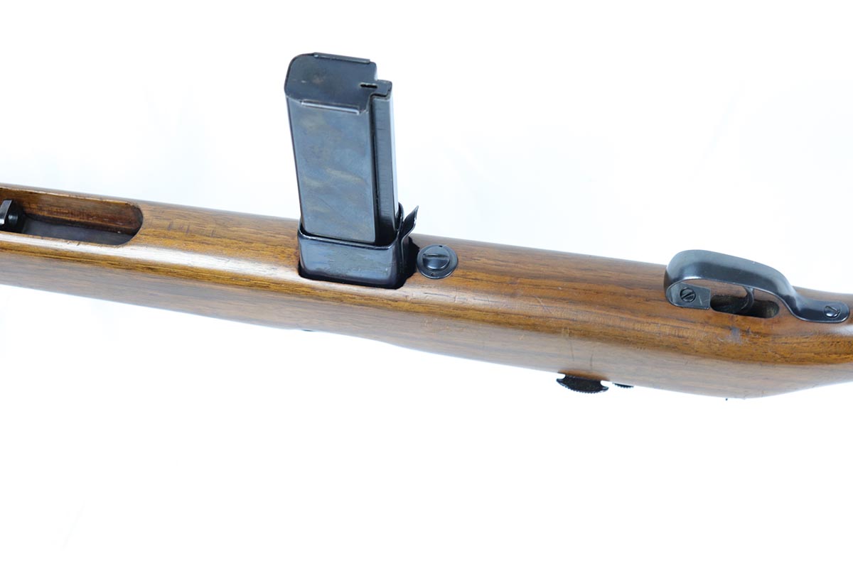 6/14/18 – This is a very attractive Reising M-50 with typical compensator and rear peep sight, and includes one original 25-rd mag and two reproduction 35-rd mags. The Reising M-50 was notably issued to Marines in the Pacific Theater during WWII as an alternative to the Thompson sub-machine gun which was in short supply. Although not well received by the Marines, these guns were also supplied to various police departments and utilized for decades after WWII. They have gained in popularity over the years with recreational shooting enthusiasts as a well made, relatively inexpensive entry level machine gun which utilizes readily available ammunition. This specimen with its excellent, high-glossy refinish and attractive wood likely was one of the police guns. Firing mechanism moves smoothly when operated by hand. This weapon is fully transferable on an ATF form 3 or form 4 as Curio & Relic eligible. Mechanics are fine. Bore is extremely fine, shiny and bright. No doubt this will bring many hours of enjoyment to a future owner.