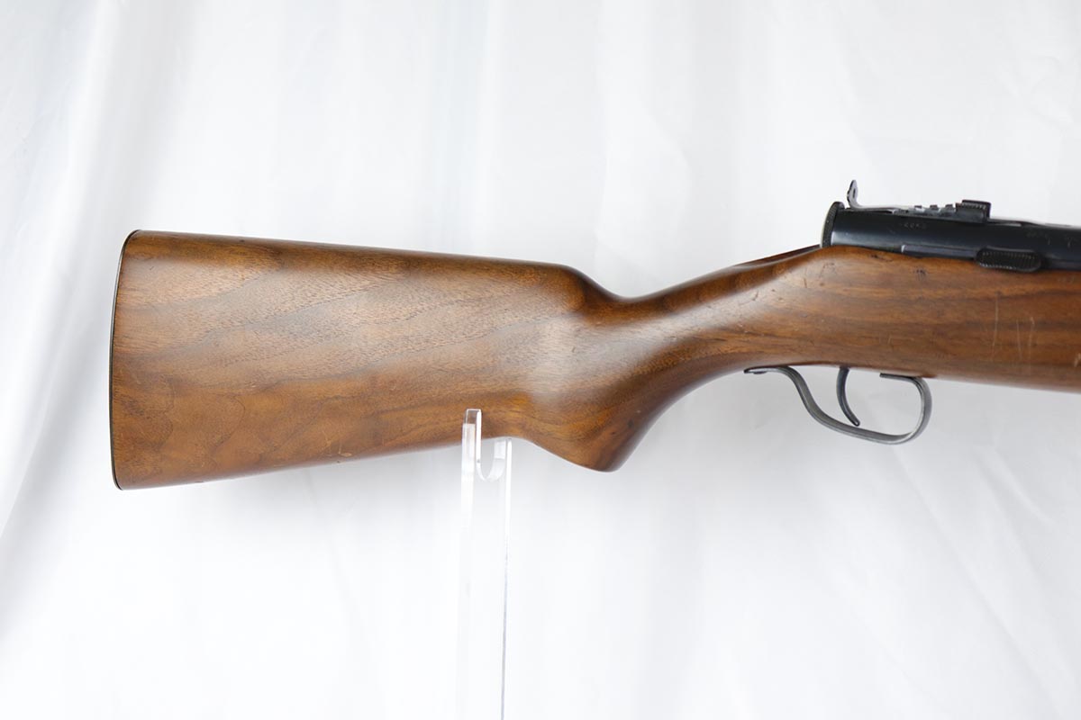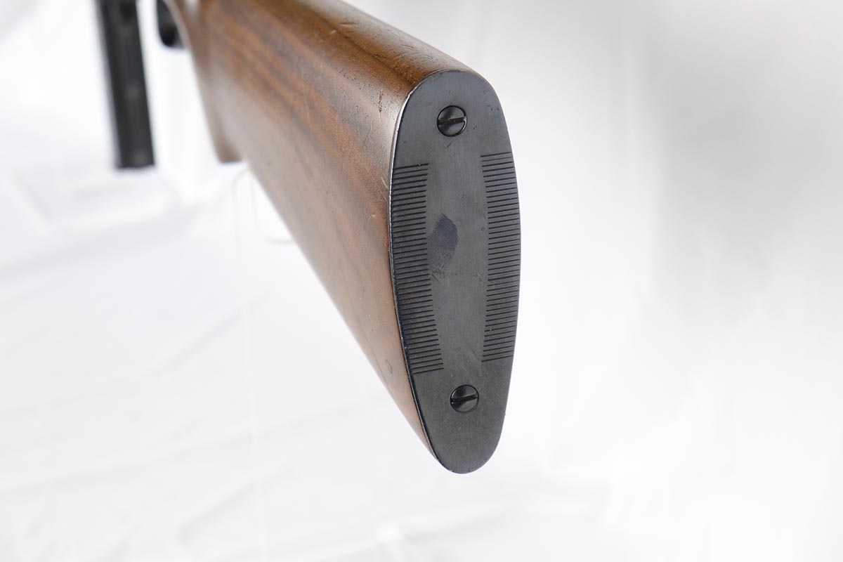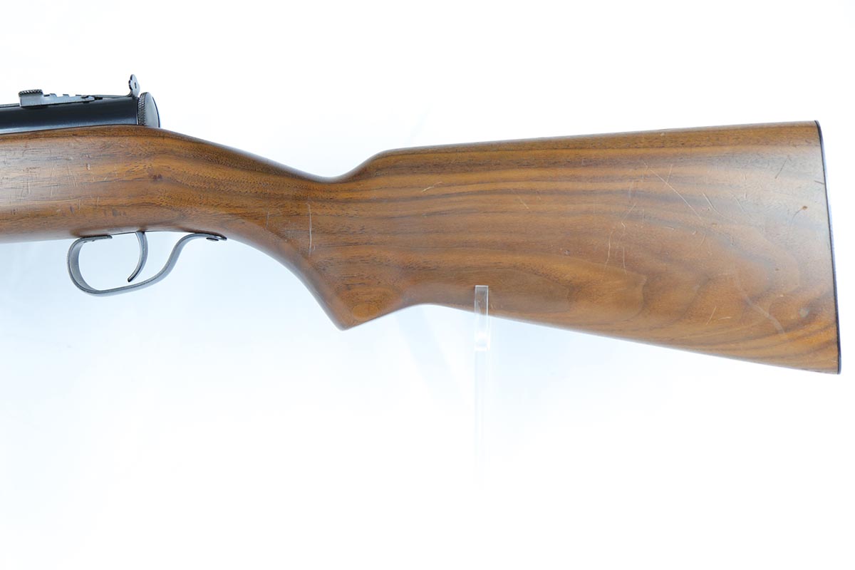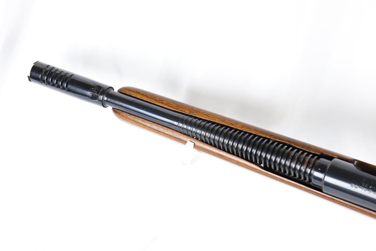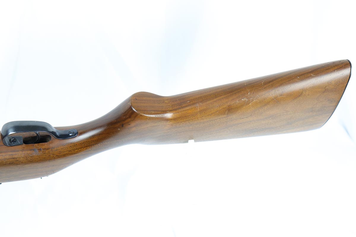 6/14/18 – This is a very attractive Reising M-50 with typical compensator and rear peep sight, and includes one original 25-rd mag and two reproduction 35-rd mags. The Reising M-50 was notably issued to Marines in the Pacific Theater during WWII as an alternative to the Thompson sub-machine gun which was in short supply. Although not well received by the Marines, these guns were also supplied to various police departments and utilized for decades after WWII. They have gained in popularity over the years with recreational shooting enthusiasts as a well made, relatively inexpensive entry level machine gun which utilizes readily available ammunition. This specimen with its excellent, high-glossy refinish and attractive wood likely was one of the police guns. Firing mechanism moves smoothly when operated by hand. This weapon is fully transferable on an ATF form 3 or form 4 as Curio & Relic eligible. Mechanics are fine. Bore is extremely fine, shiny and bright. No doubt this will bring many hours of enjoyment to a future owner.