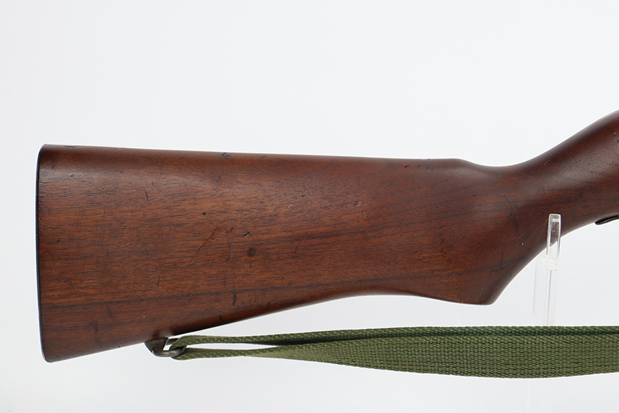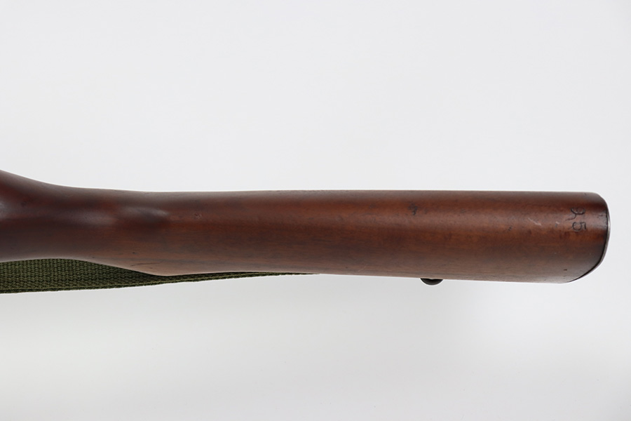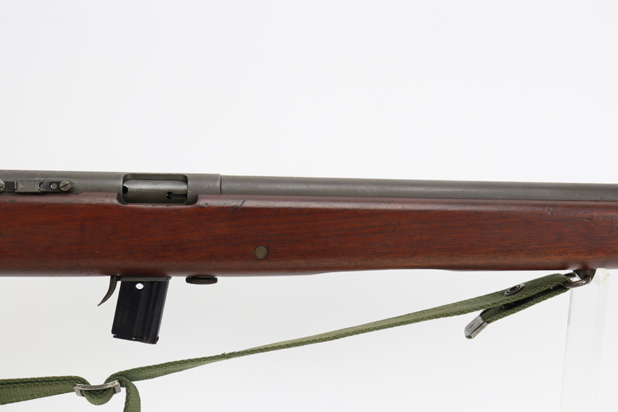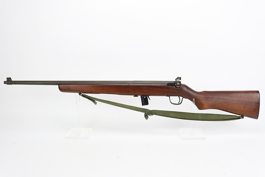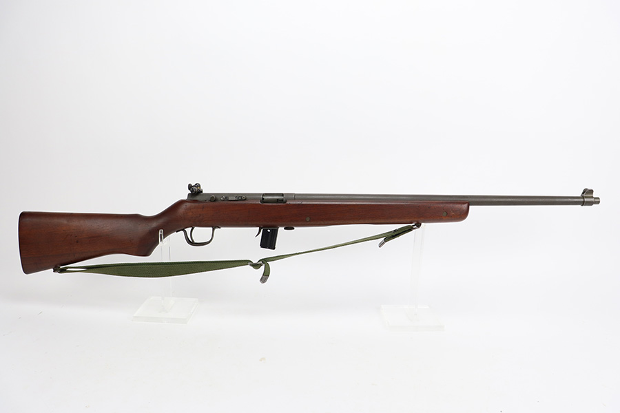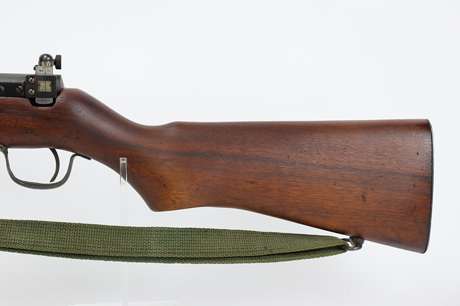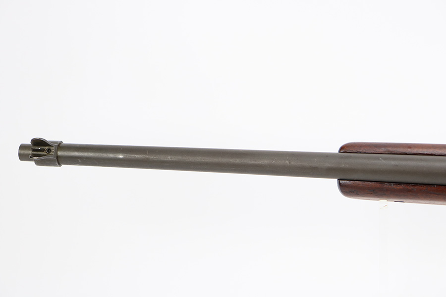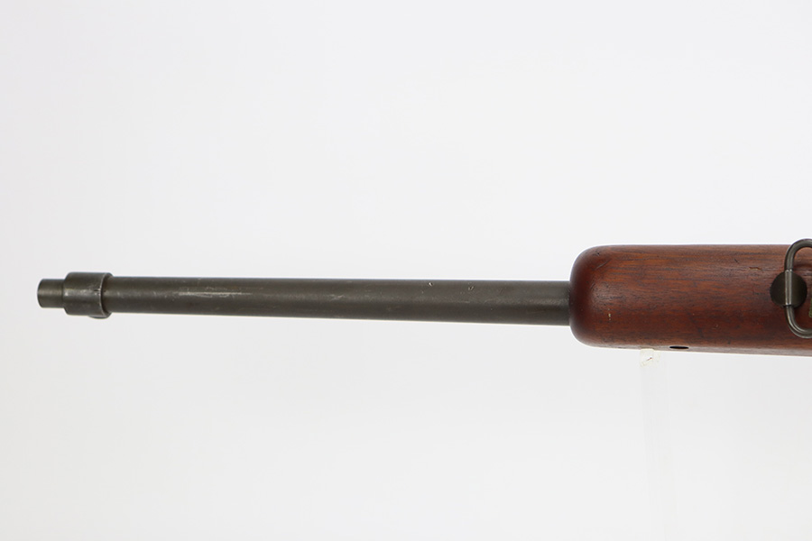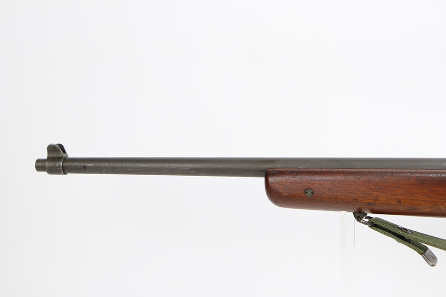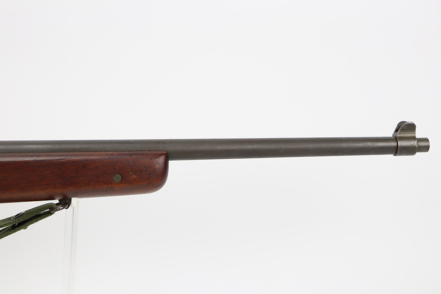 9/6/23 – This is an excellent example of a Reising Model 65, a blowback operated semi-automatic rifle designed to emulate the weight and sight picture of the U.S. M1 Garand Rifle. This is the civilian version of the 58C, which was used by the United States Marine Corps as a training weapon. Winged blade front sight and Redfield peep rear sight. This one has retained about 97% of its parkerized finish with just minor surface scratches and scuffs along the barrel. Very nice wood stock with only minor dings and scratches. Comes with one proper magazine and a green canvas sling. Mint bore.