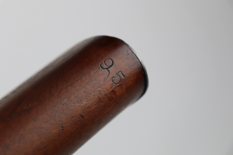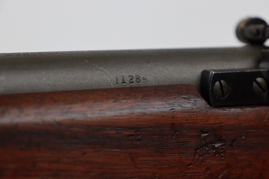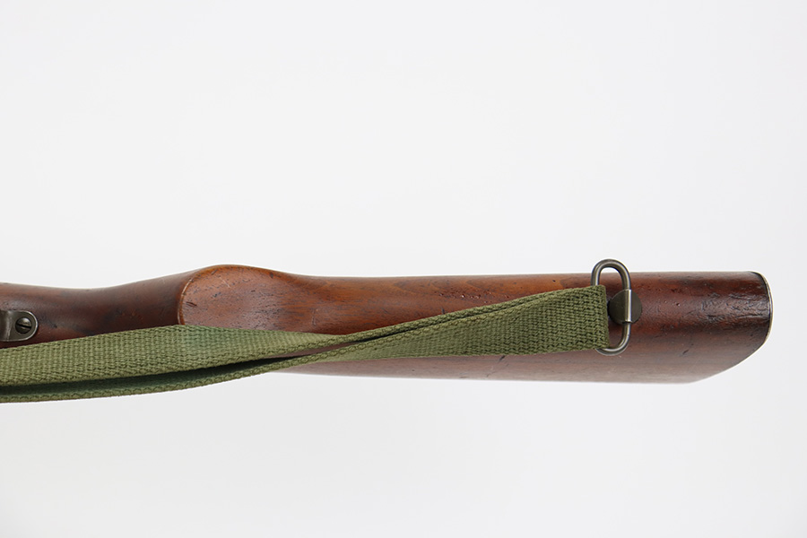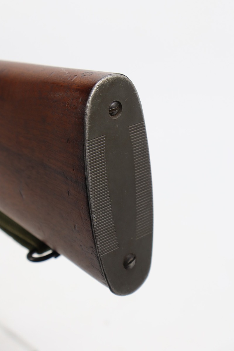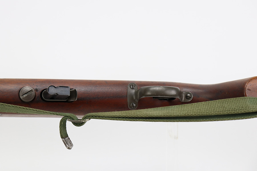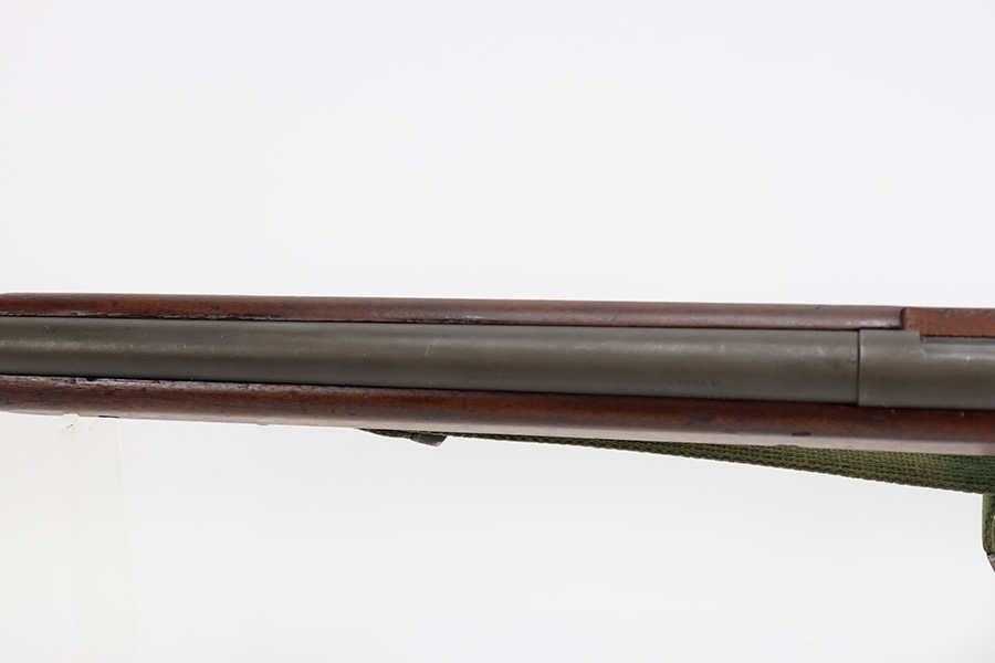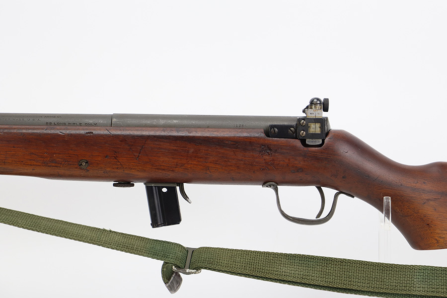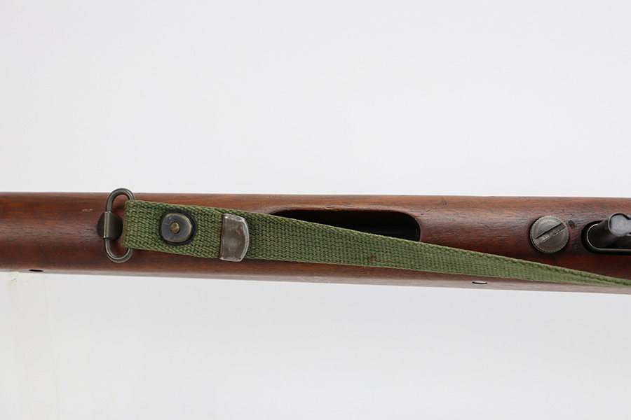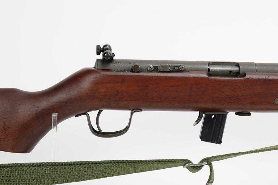 9/6/23 – This is an excellent example of a Reising Model 65, a blowback operated semi-automatic rifle designed to emulate the weight and sight picture of the U.S. M1 Garand Rifle. This is the civilian version of the 58C, which was used by the United States Marine Corps as a training weapon. Winged blade front sight and Redfield peep rear sight. This one has retained about 97% of its parkerized finish with just minor surface scratches and scuffs along the barrel. Very nice wood stock with only minor dings and scratches. Comes with one proper magazine and a green canvas sling. Mint bore.