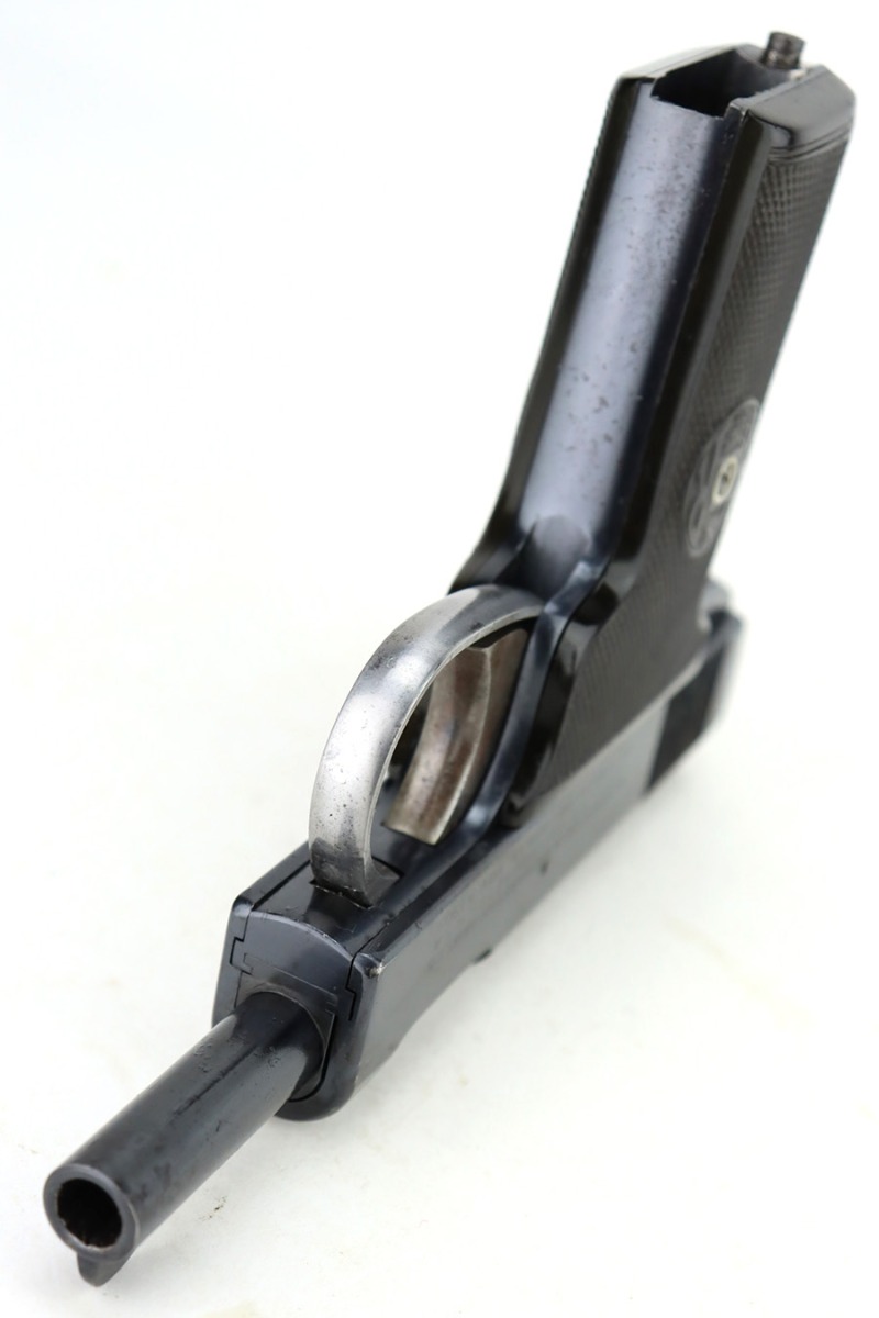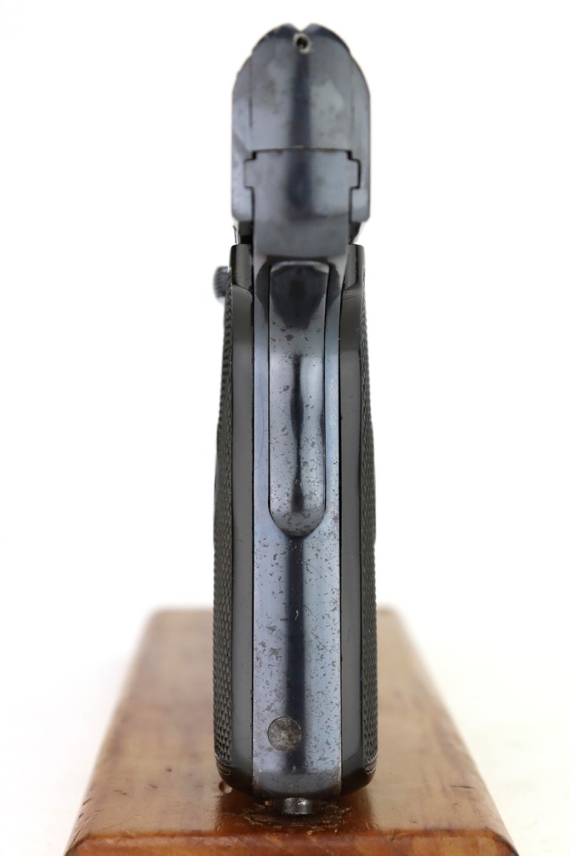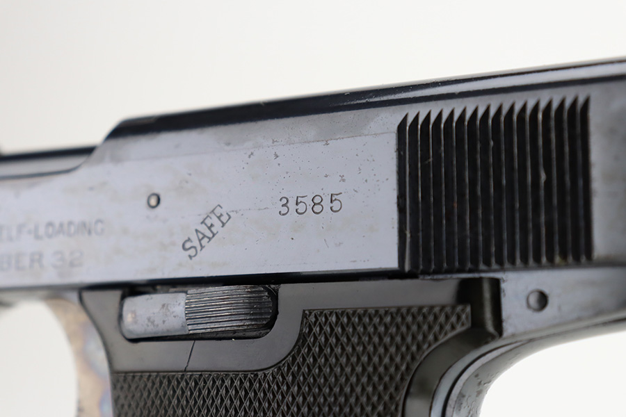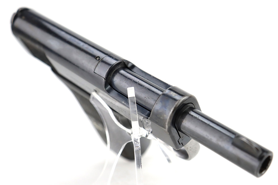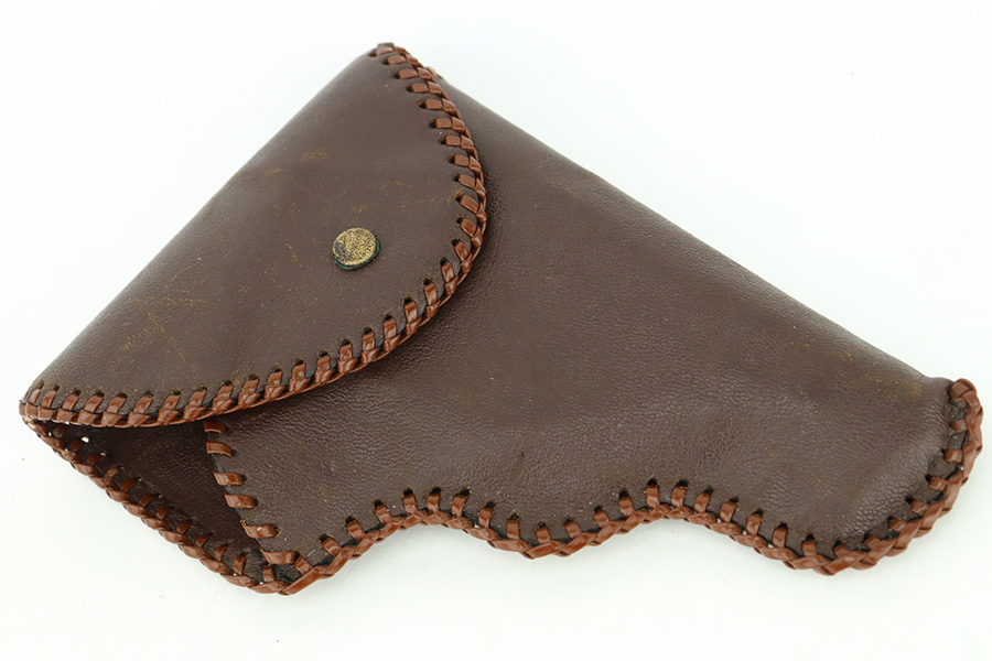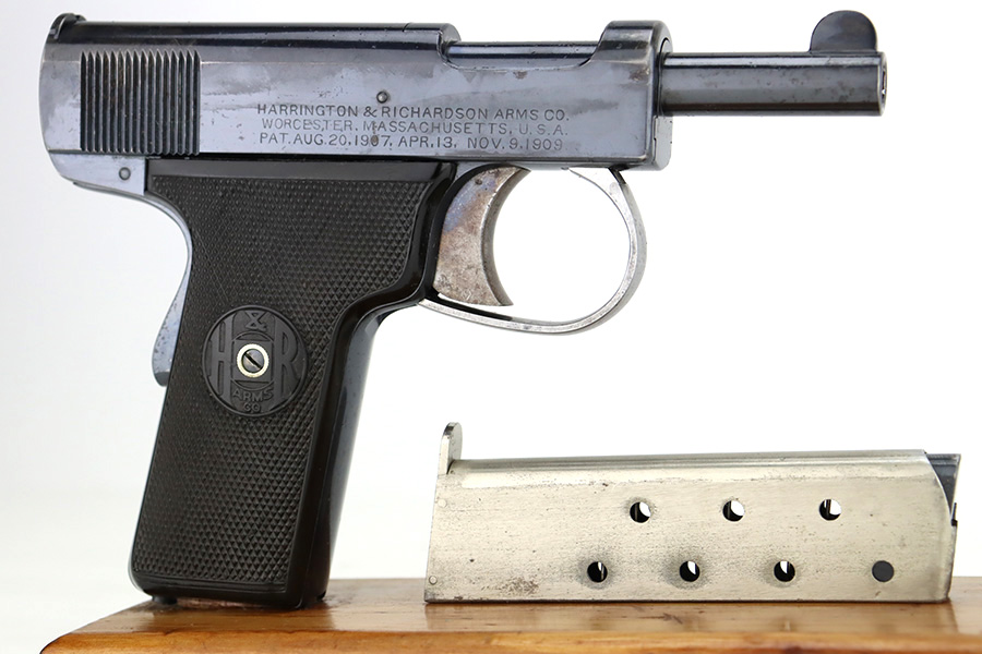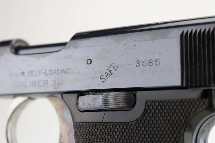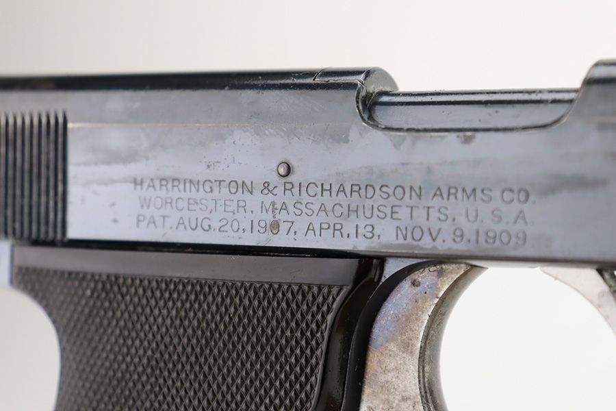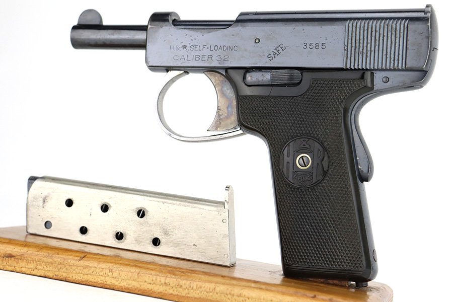 3/5/24 – This is a very nice H&R Self-Loading .32 pistol, manufactured in 1916 and chambered in .32 ACP. This one has an early serial number. It comes as a rig with a generic holster and one magazine. The finish on the gun rates about 97%. While there is very little actual finish loss, there are some areas of light spotty oxidation and pin-pricking here and there, mostly on the grip straps and back half of the slide. Fitted with period-correct bakelite grips. The bore has good rifling with minor pin-pricking throughout.