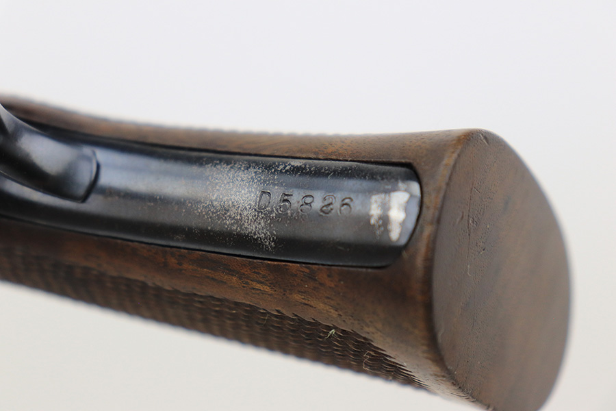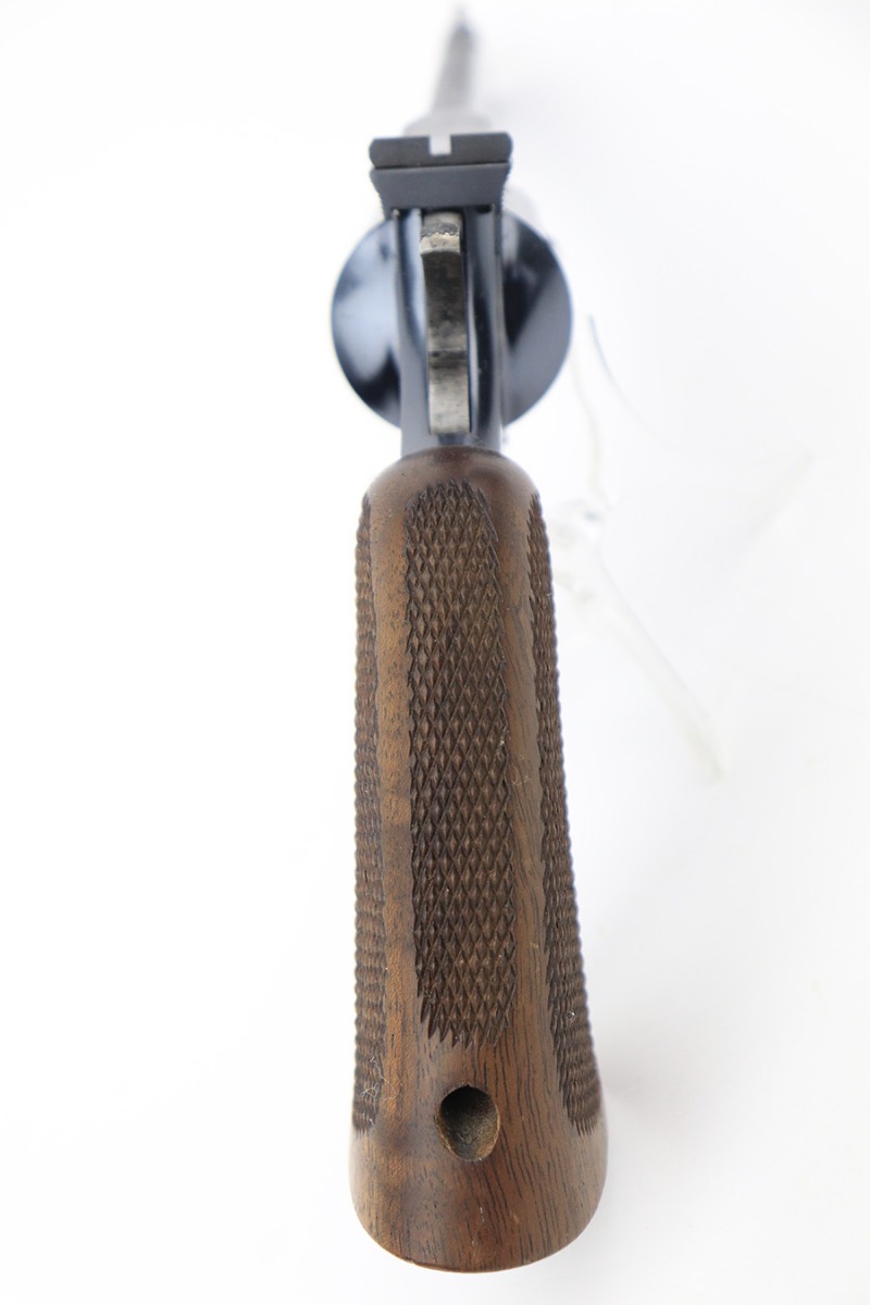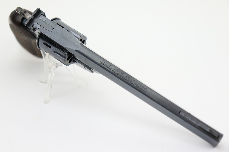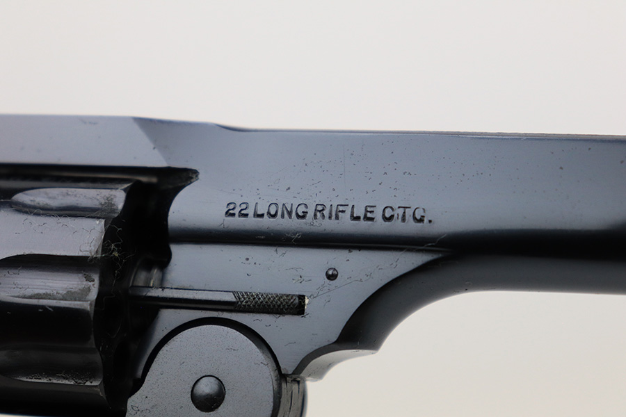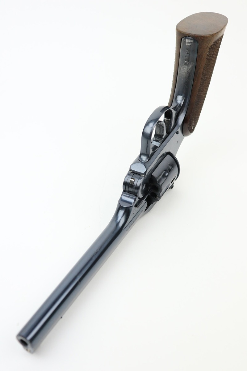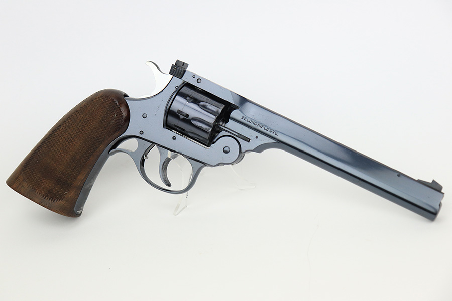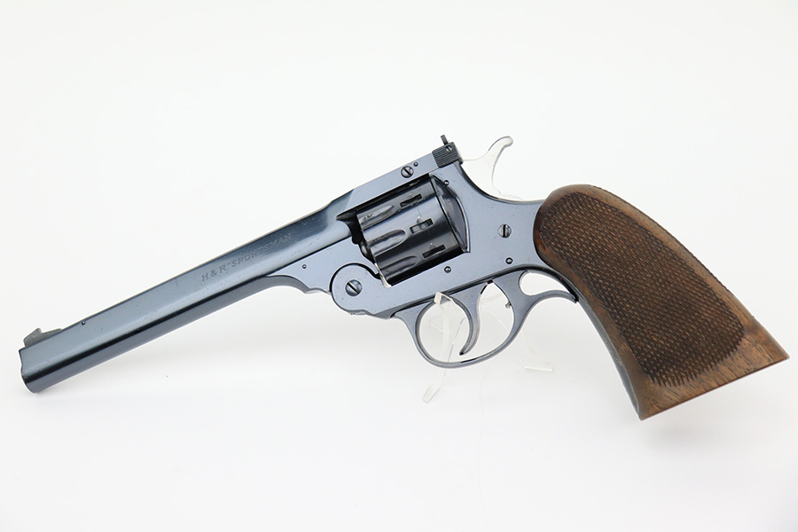 7/5/23 – This is a very nice example of an H&R Sportsman revolver, chambered in .22 LR. From the “D” serial number prefix, it was manufactured in 1943. Comes with two speed loading tools. The gun itself has retained about 96% of its high polish finish. The majority of the wear is on the front strap, and there are some tiny scratches and handling marks here and there. Some very light oxidation in the grooves on the cylinder. Fitted with an excellent one-piece wood grip. Mint bore.