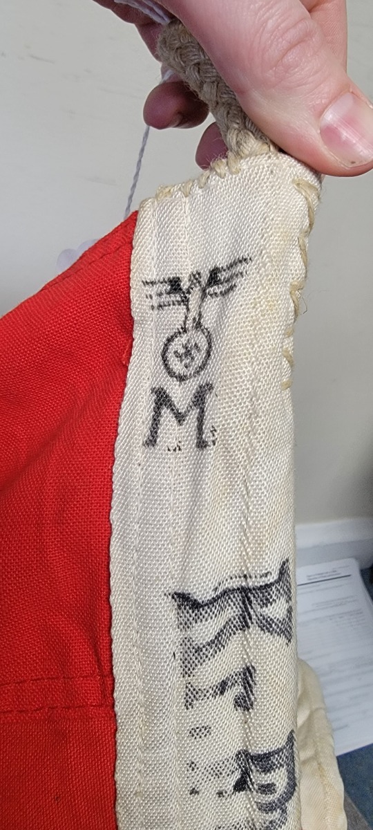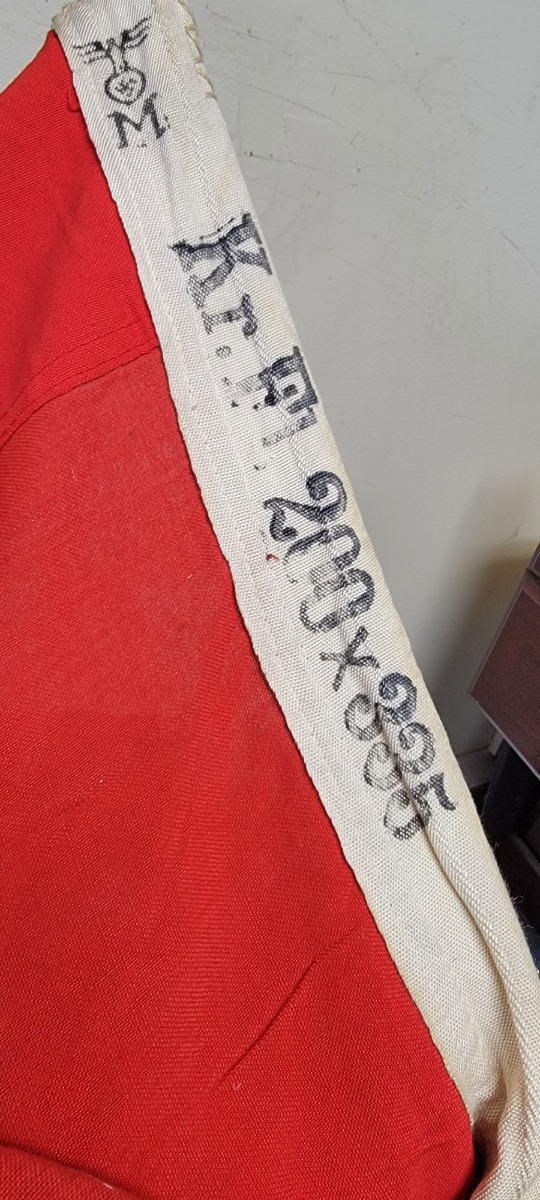4/27/22 – This is a humongous German Kriegsmarine banner flag from WW2. The flag is roughly 11 feet long and 6.5 feet wide. The hoist is ink stamped with a Kriegsmarine eagle and size 200×335 (cm). The flag is double sided with no major rips, tears, or issues. No notable stitching flaws. The original rope is present and goes through the hoist.