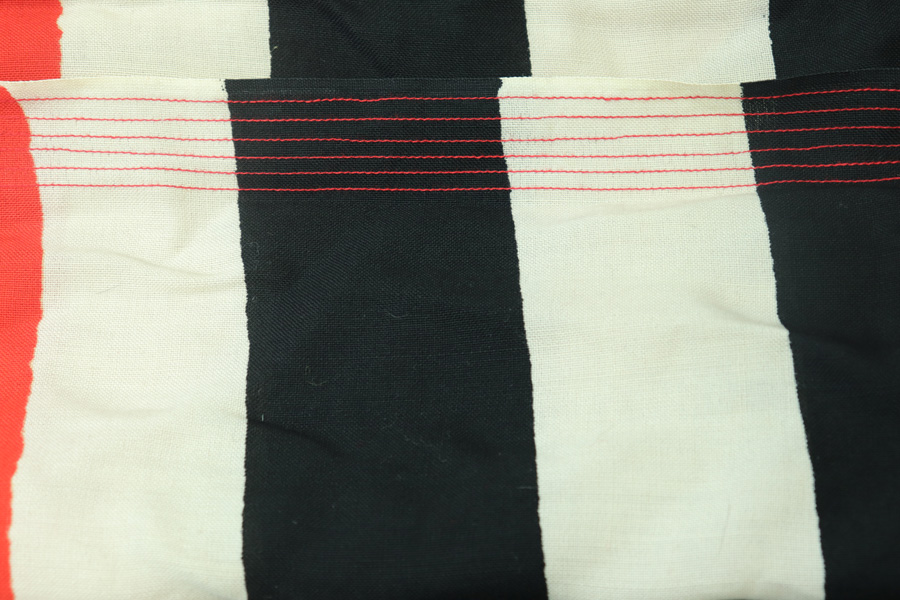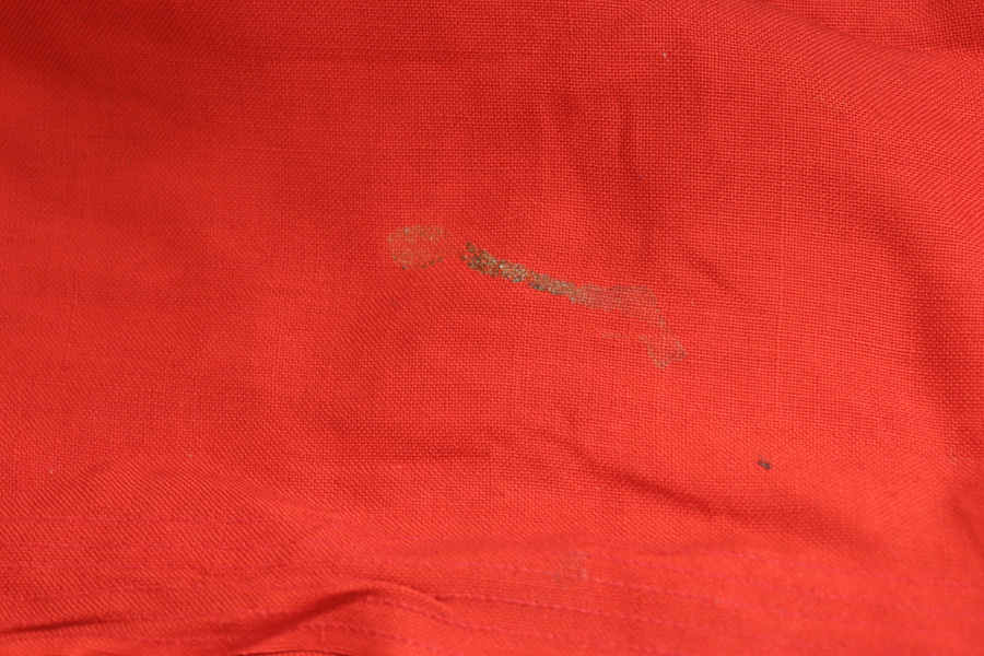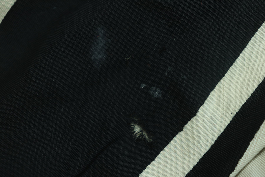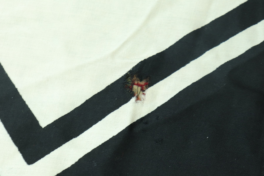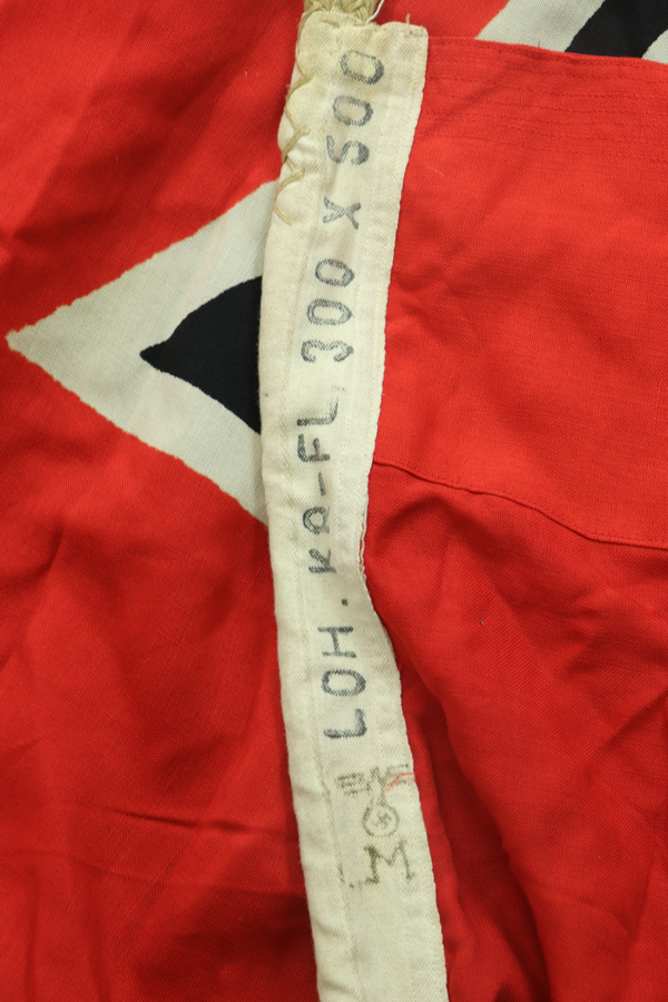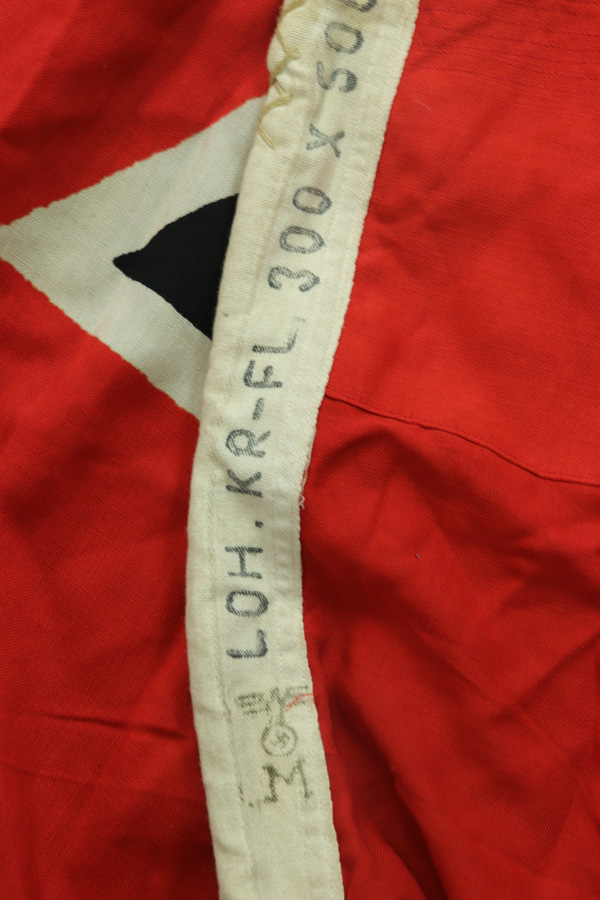 4/16/19 – This is a giant (10ft x 16.5ft) WWII Kriegsmarine battleship flag. This is the largest we’ve ever offered! The flag is Kriegsmarine marked and measurements are displayed in centimeters. The original rope is included attached to the flag. Overall the flag is in great condition with a few very minor areas of fraying or minor holes. We took photos of every issue we could find – so to not leave the buyer with any surprises. Overall these flaws are very minor in perspective to the entire piece. All original and authentic.