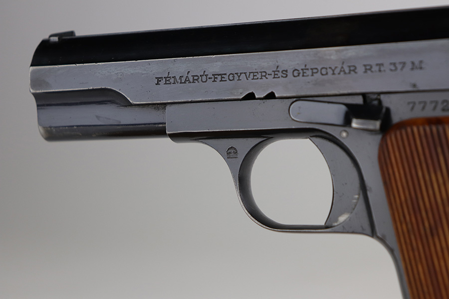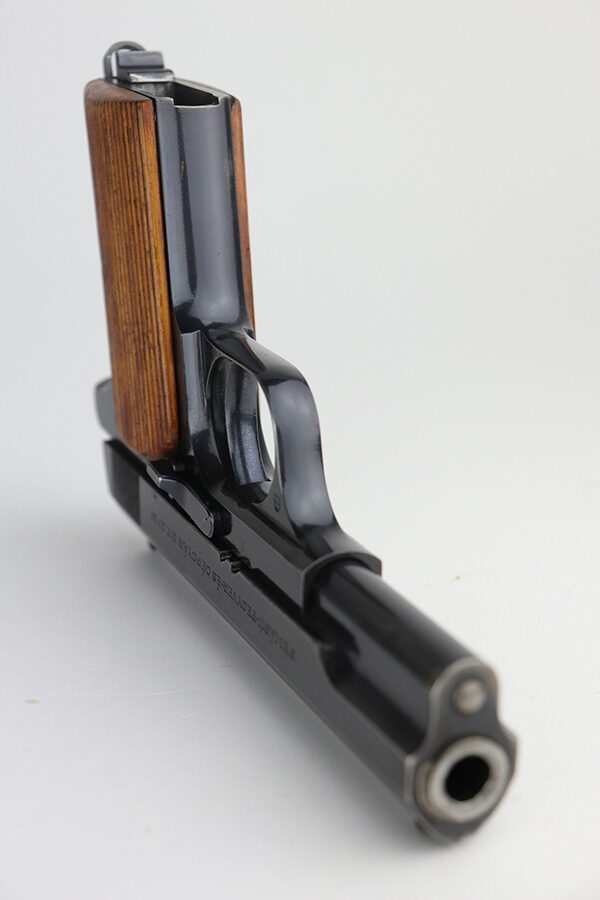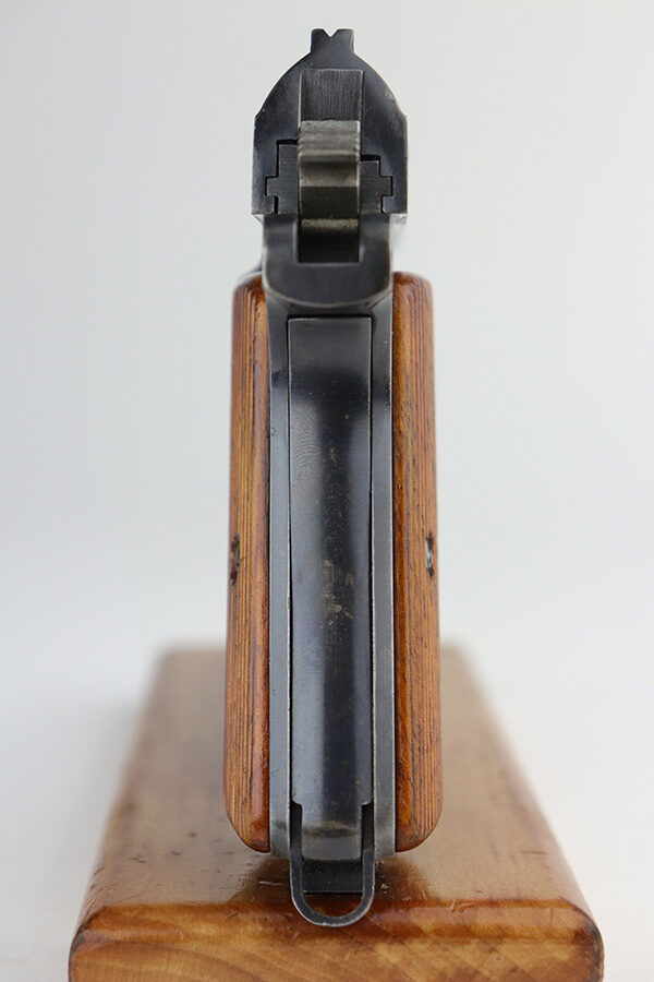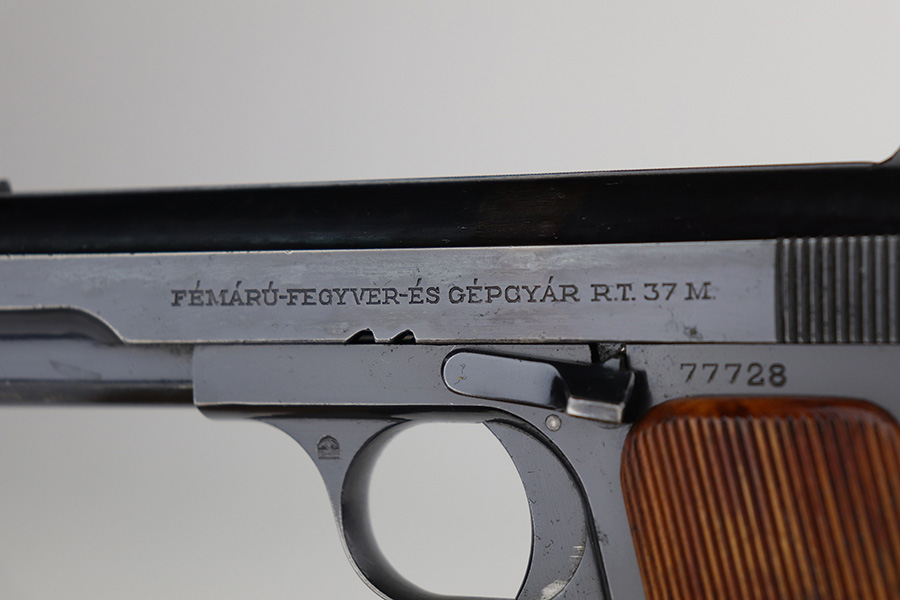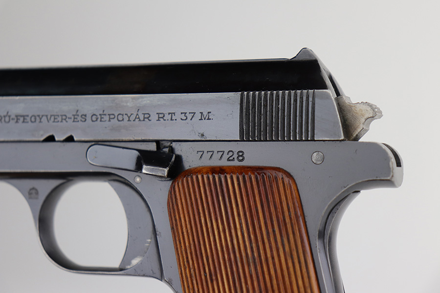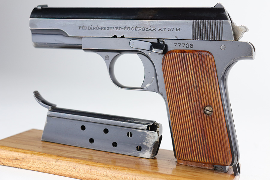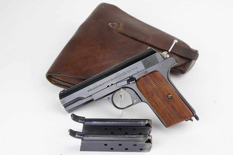 8/19/21 – This is an excellent example of a Hungarian Femaru Model 37 rig manufactured in 1940. It is all matching and has a “St. Stephen’s Crown” acceptance proof on the left side of the trigger guard. It is generally believed this a non-military mark but rather indicates commercial sale or police issue. It comes with an excellent period-correct leather holster and two proper magazines. Excellent wood grips. It has retained about 95% of its finish. There is minor wear on the high edges of the slide, around the muzzle, and some light scratchy wear on the straps. While there is very little actual finish loss, there are areas of discoloration along the slide. Excellent bore – shiny with strong rifling.